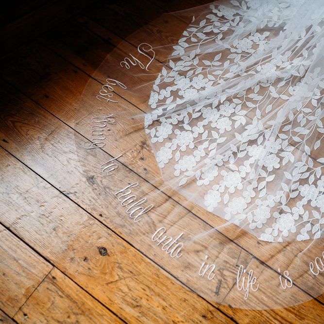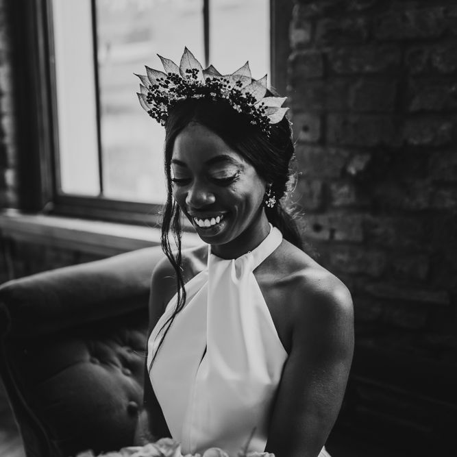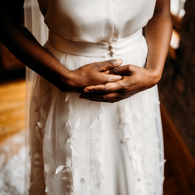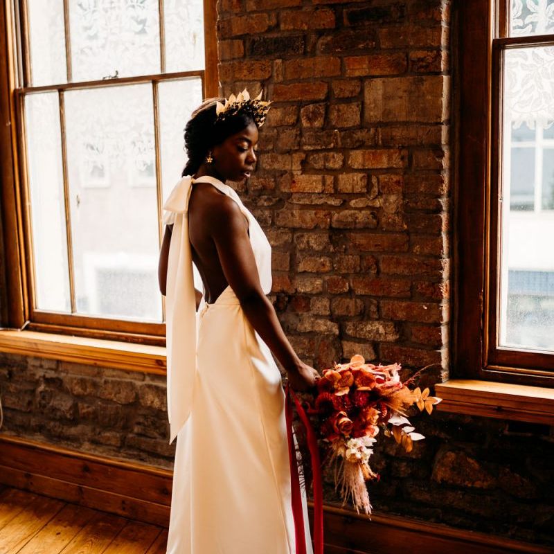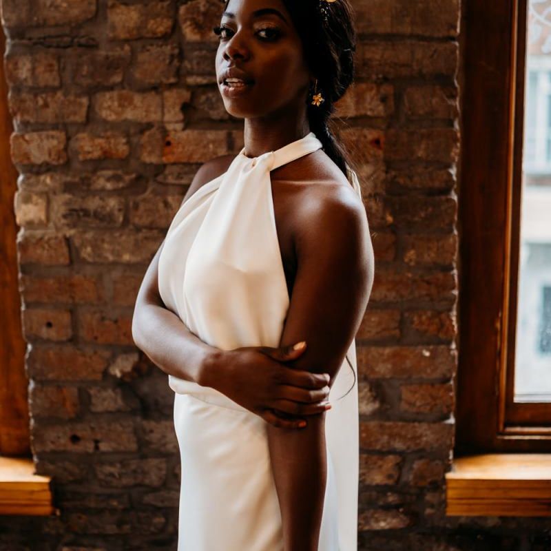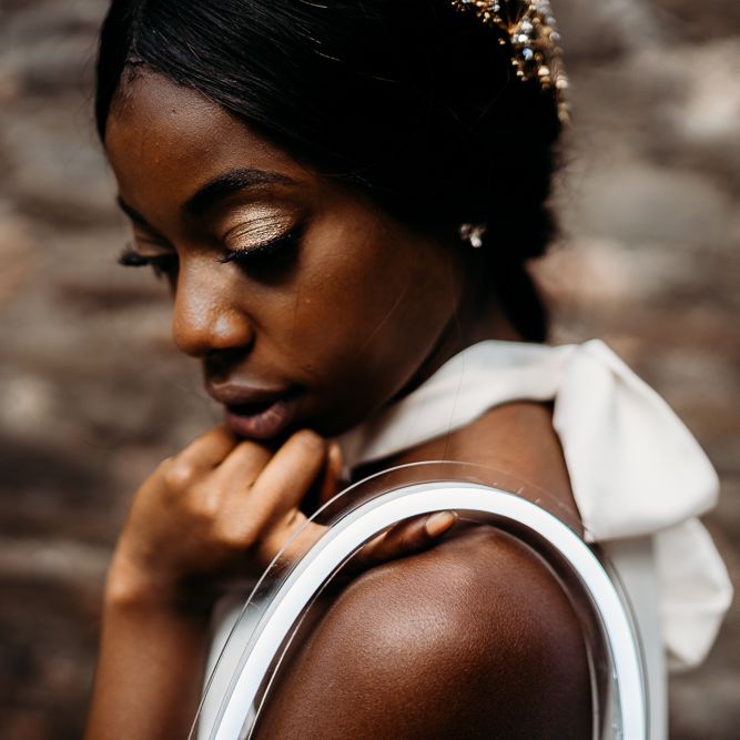 Our beautiful model Latisha wore the ‘Cheryl’ dress with detachable skirt ‘Beale’ we specifically chose this dress because it was modern, elegant and very classy. Both items are by Halfpenny London. With the dress, we introduced “The Audrey” embroidered script veil provided by Rebecca which featured an Audrey Hepburn quote of “the best thing to hold on to in life is each other” which felt very fitting for a shoot so soon after lockdown. With all the uncertainty at the moment, it was definitely a lovely reminder. Emma did a wonderful job of styling Latisha’s hair with a relaxed tied up look, to suit the bohemian vibe but also classy style.
