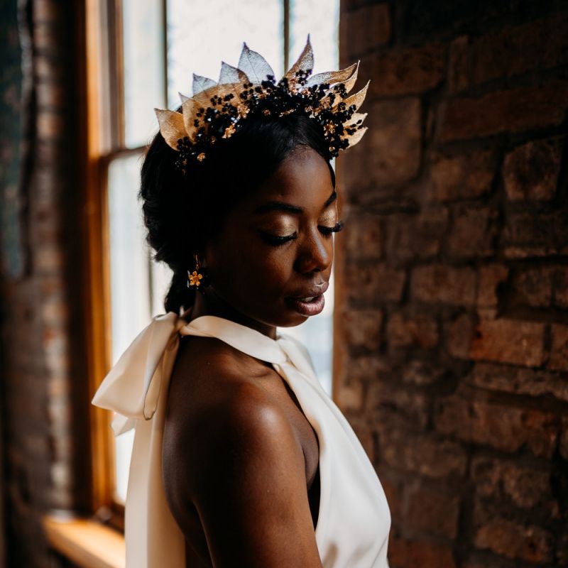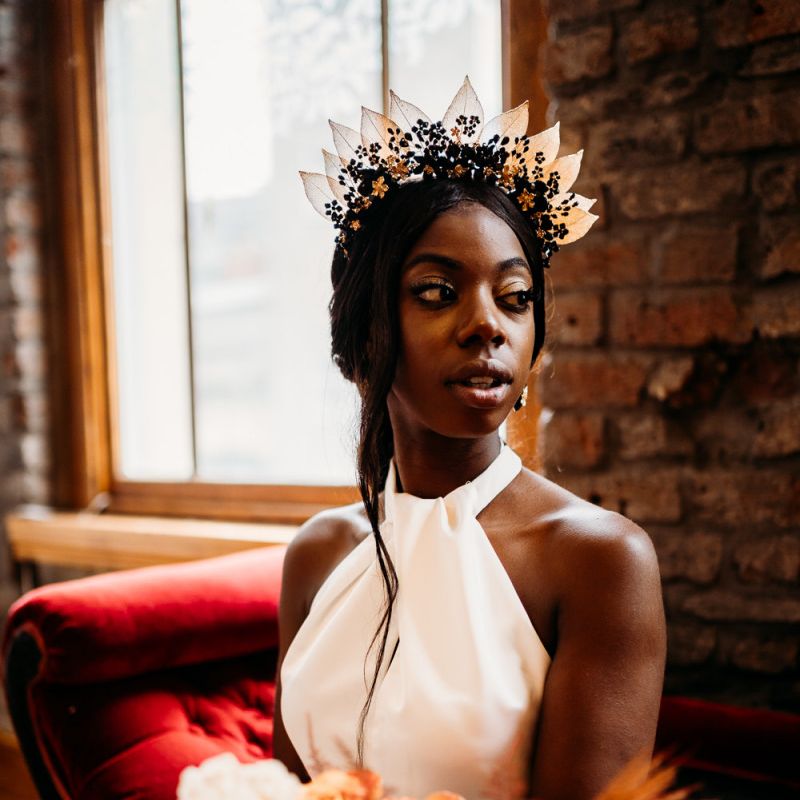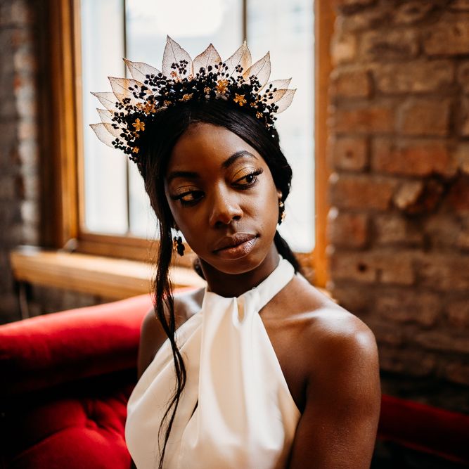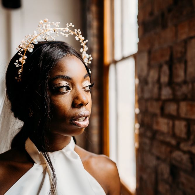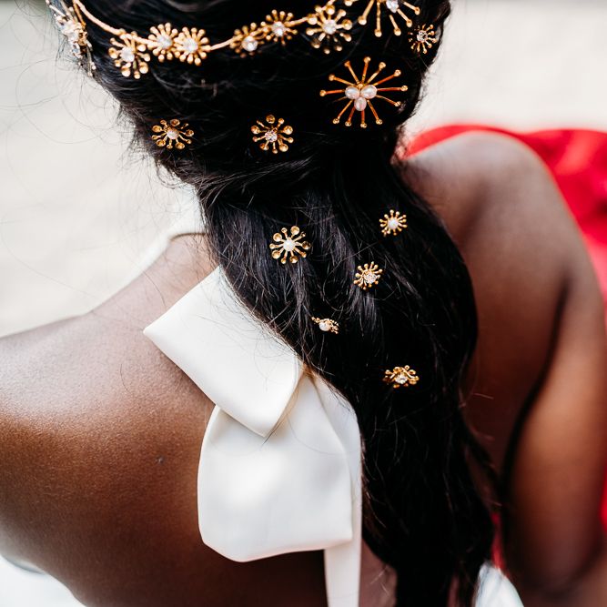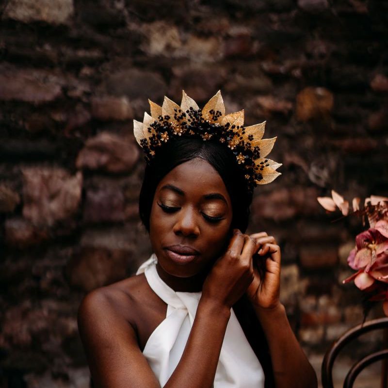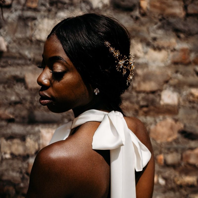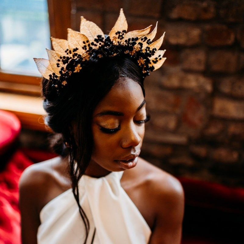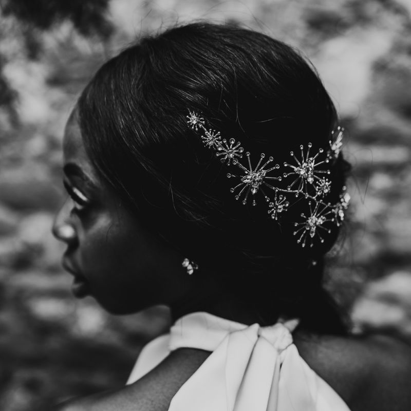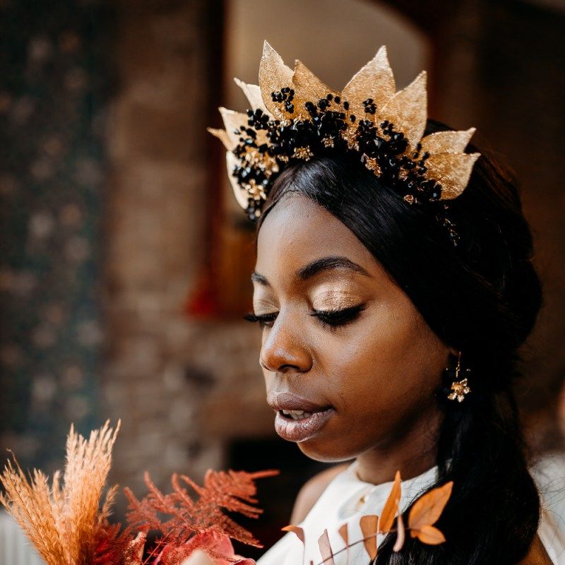 Hermione provided three beautiful accessories. Firstly the Titania Black Crown is a crown of golden leaves embellished with dazzling black Swarovski crystals. The Artemis Garland combined with Artemis Hairpins created a stunning display of scattered golden starbursts with Swarovski crystal centres. Finally, the last piece that was featured was the Lyra Halo in gold, a gorgeous halo of freshwater pearl blossoms embellished with pearl and crystal tendrils throughout. All with matching earrings. We thought the star piece of the day was the Titania Black Crown, we had spotted it a while back and thought it would be absolutely perfect with both the touches of gold and black, though not too much gold and the black! It was just enough to add texture and to break up the gold a little bit and to create that all-important statement piece for the bride.
