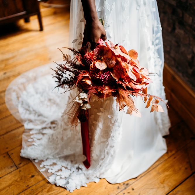 The Edmond Trestle table and Bentwood chairs were of a lovely dark wood, which worked so well with the venue, on the table we laid a hand-dyed silk caramel shade runner down the middle. Lucy created the floral centrepiece that fitted perfectly with our concept. She introduced lots of texture by using fluffy feather-like grasses in shades of dusty pinks and orange/brown to contrast against fresh blooms in caramel shades. Flowers used included golden garden roses and cafe au lait dahlias with the odd pop of raspberry. There was the addition of a show stopper vanda orchid in a mottled coral that enhanced the bridal bouquet and table centrepiece to make it feel much more luxurious. We decided to avoid pampas grass for this shoot as although typically ‘boho’ we felt it had been done many times before so instead opted for the grasses and trailing dyed asparagus fern as alternatives to achieve the modern luxe boho aesthetic. We wanted the floral table centrepiece to feel quite abundant and luxurious so had fresh blooms in all the concept colours climbing on top of each other in an organic and asymmetrical manner, spilling over the centrepiece with loose foliage draping over the bowl.