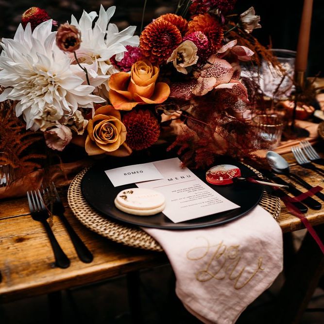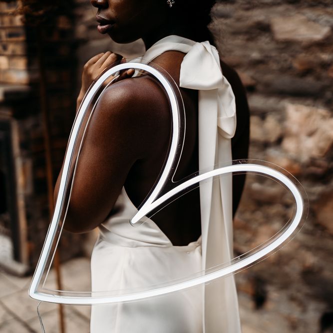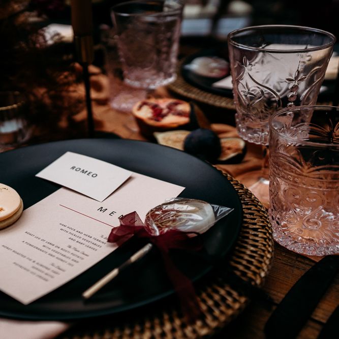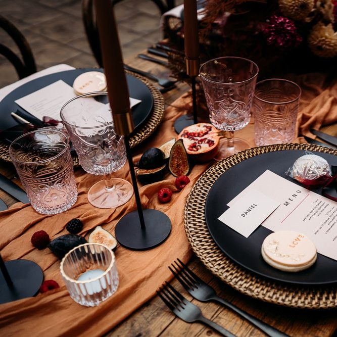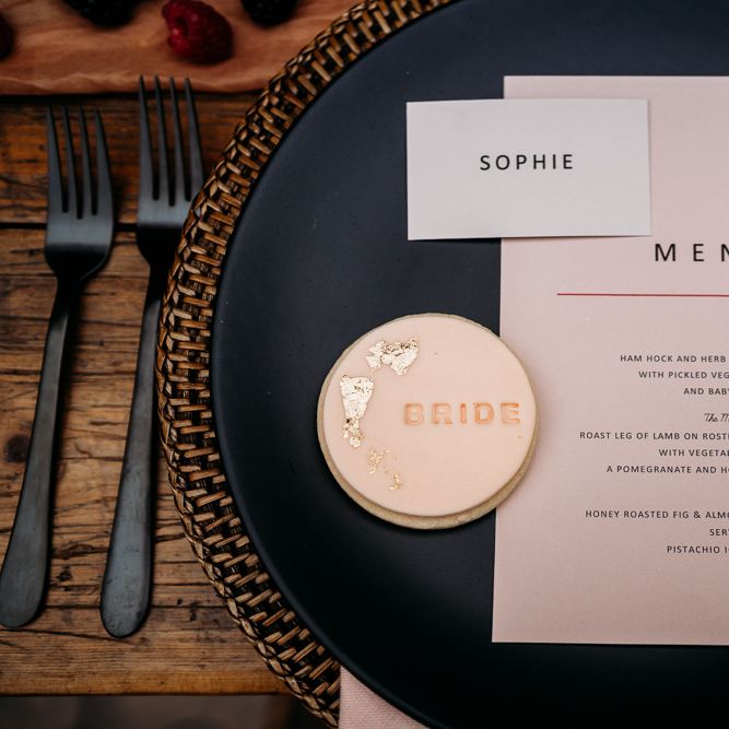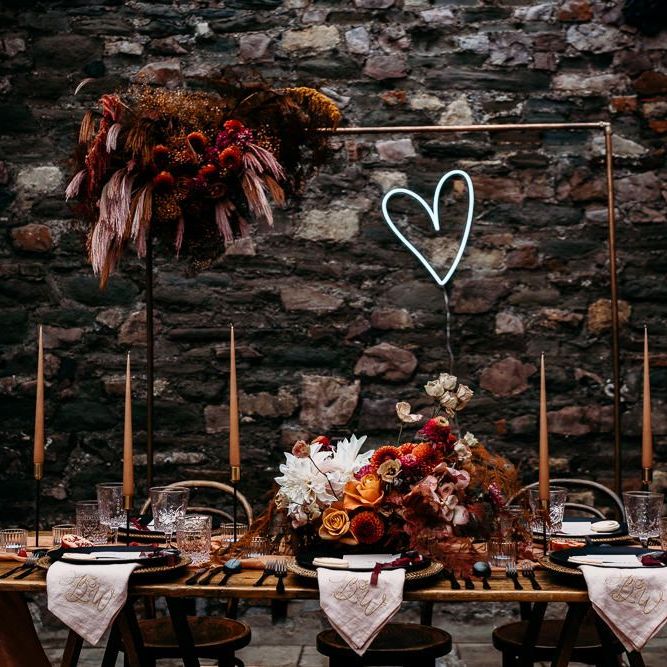 To the table, we added black and gold candlestick holders with caramel shade taper candles from Ester & Erik and glass tea light holders. We finished dressing the table centrepiece with fresh fruit such as pomegranate, blackberries, raspberries and figs to add that extra black and raspberry colour. Each place setting had a rattan charger plate to give a boho feel with pink cut glassware, matt black cutlery, modern-looking matt black dinner plates, salmon pink monogrammed napkins and simple handmade menu cards and place names cards. The menu and name cards in blush pink shades were added on top of the plate. Sarah made peach shade coloured iced biscuits with gold leaf and embossed detail to bring contrast from the plate, we also added a handmade artisan lollipop from Sugar Pop in the colour palette of pink and raspberry, with a gold “Crazy In Love” design, with black and raspberry shade of silk ribbons. Lucy also created the lovely corner backdrop for our wedding breakfast table and sofa with dried grasses and beautiful blooms in caramel, rust and raspberry shades. The shoot was finished with the all-important neon sign. We chose the neon heart because it could be held and placed in different ways, definitely something a little bit more special to add to the shoot.