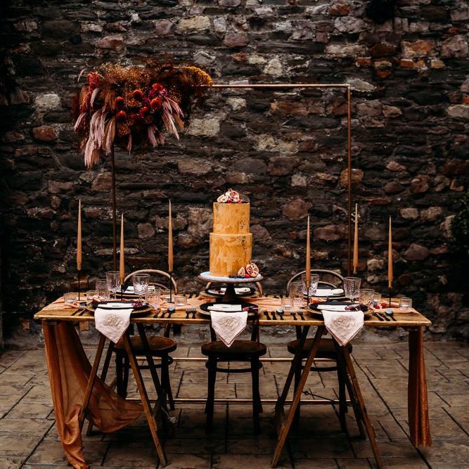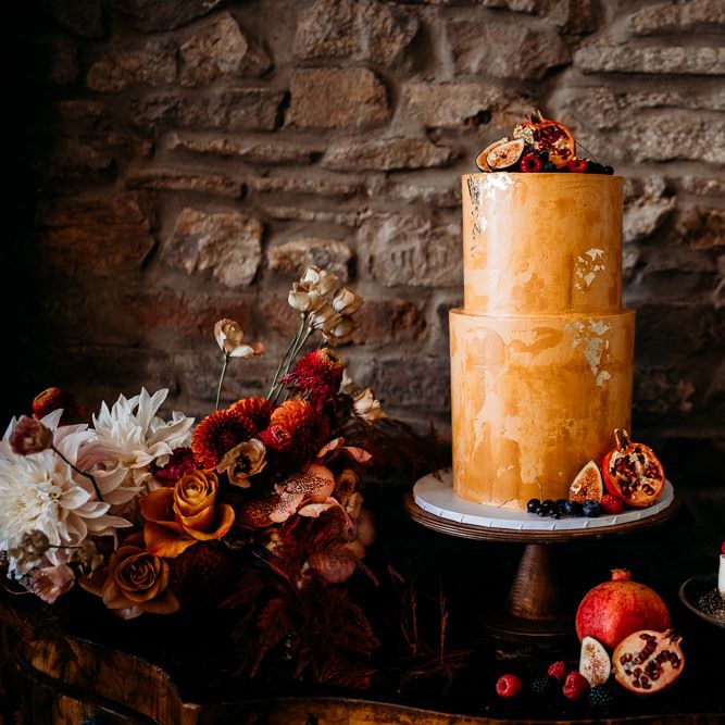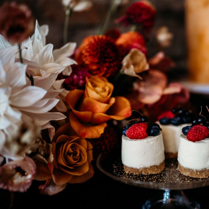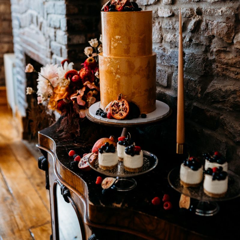 The shoot also featured a cake table with some mini desserts. The centrepiece was a two-tier rust/caramel wedding cake finished with swiss meringue buttercream, gold leaf and fresh fruit created by Sarah. We decided on a two-tier because it looked quite modern and sophisticated. We also wanted to add other nibbles to the table with mini vanilla & white chocolate cheesecakes topped with fresh berries. A floral piece, pomegranate, figs, blackberries and raspberries and candlestick holders dress the table.