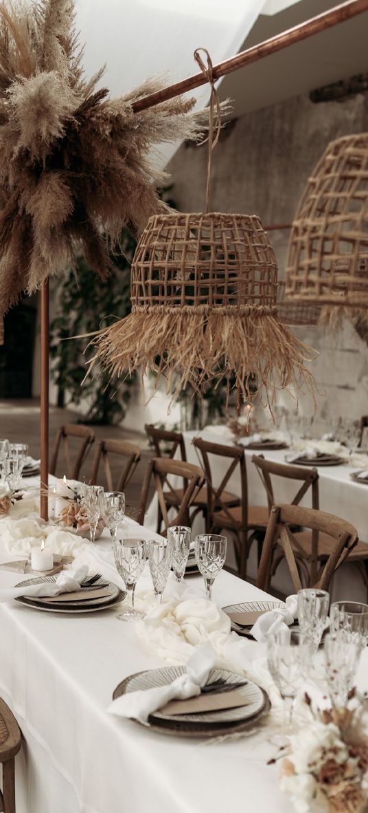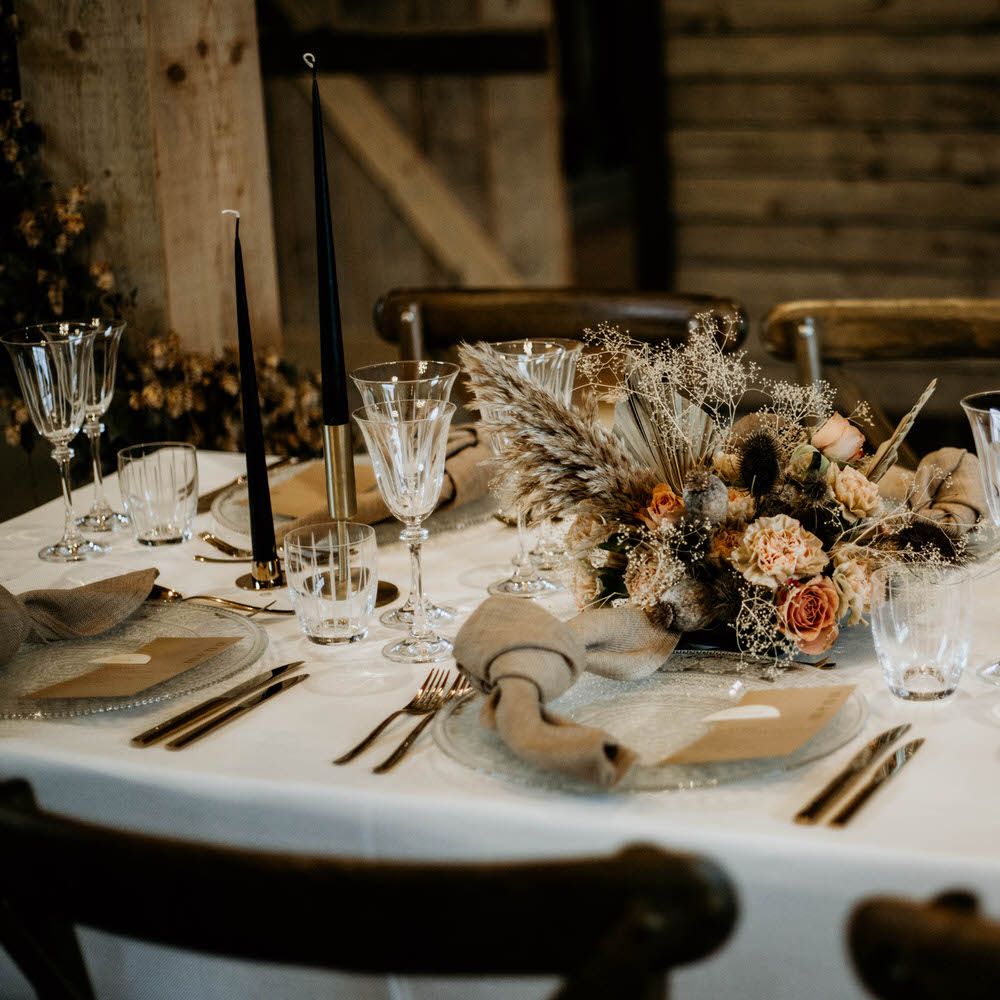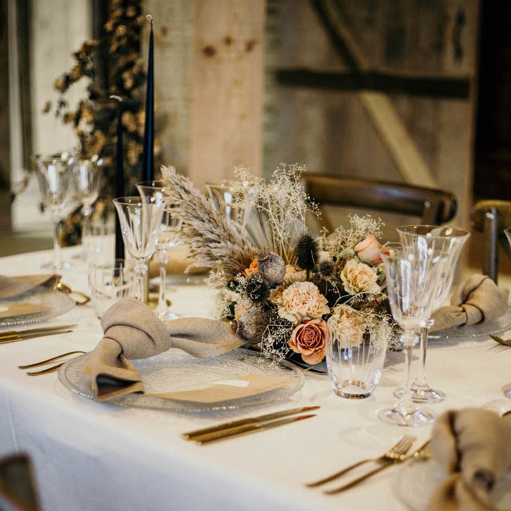 To suit the venue and style, we decided to choose natural tones. With the dried flowers already decorating the barn along the columns and the chimney, the taupe colour scheme was a perfect match.