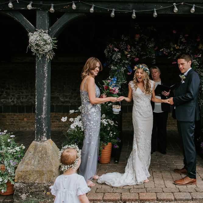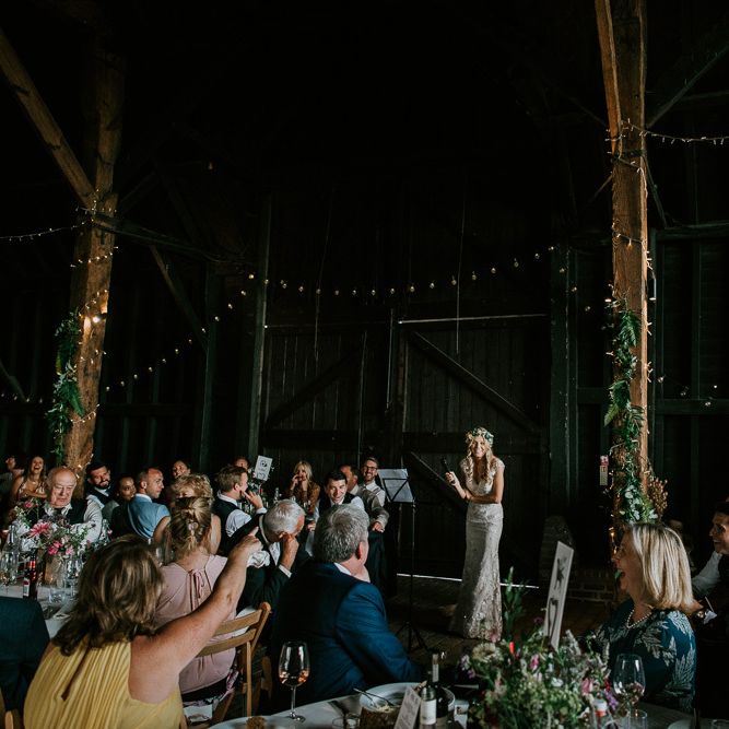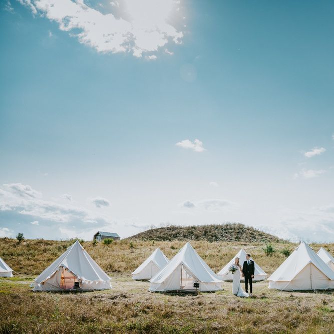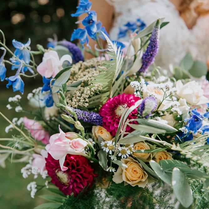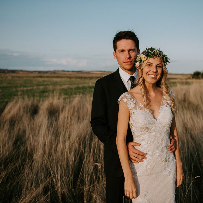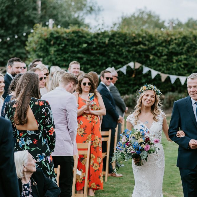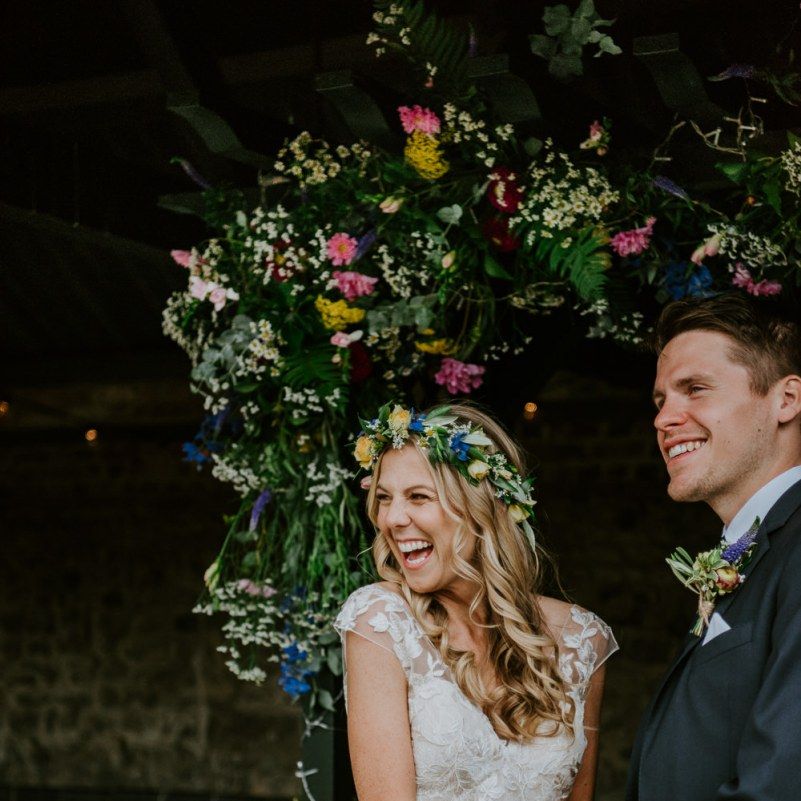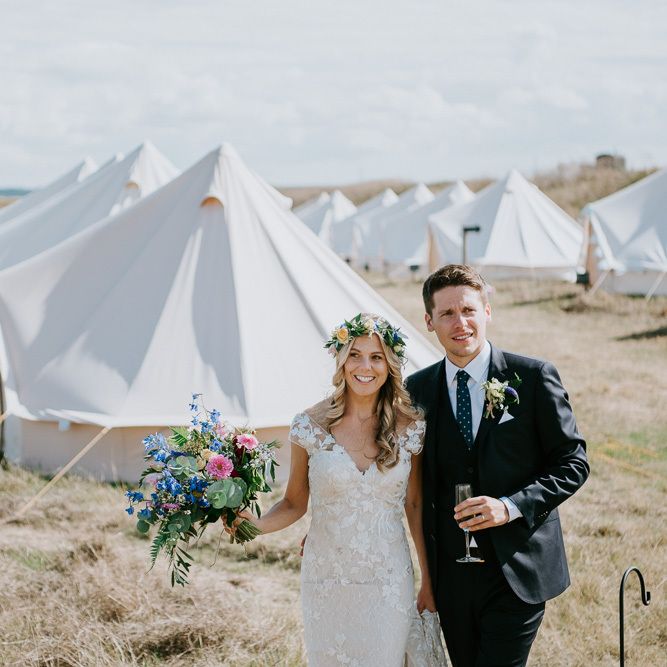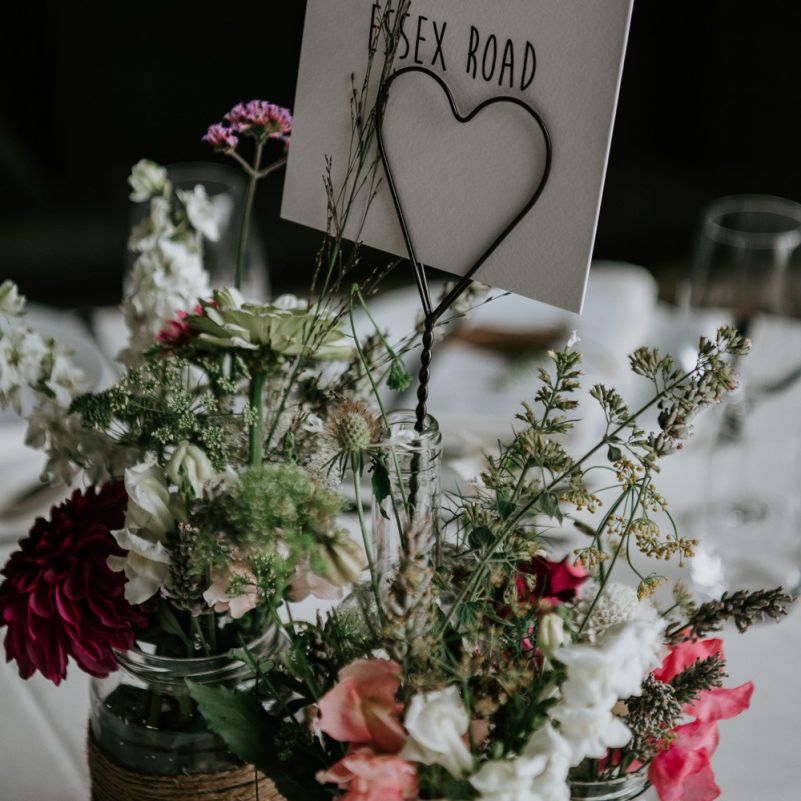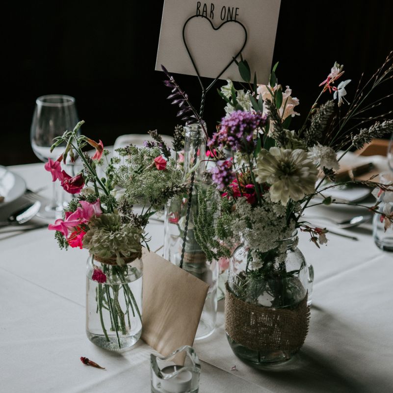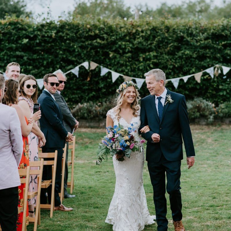 Our venue was set in the incredible beauty of Elmley Nature Reserve, so we wanted to celebrate nature and keep the styling to a minimum to complement the venue with a boho, relaxed feel. Our flowers were all English grown, meadow style and were supplemented with ferns and greenery wrapped around the pillars in the barn. The tables all had home-grown flowers in varying jam jars wrapped in hessian and lace. Our guests were staying in tipis on-site so the décor outside on the lawn reflected the festival style feel of the wedding.