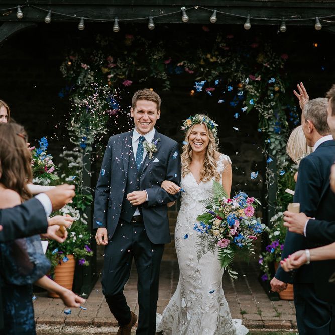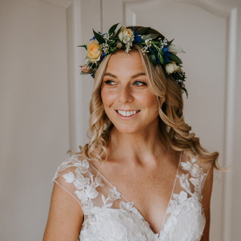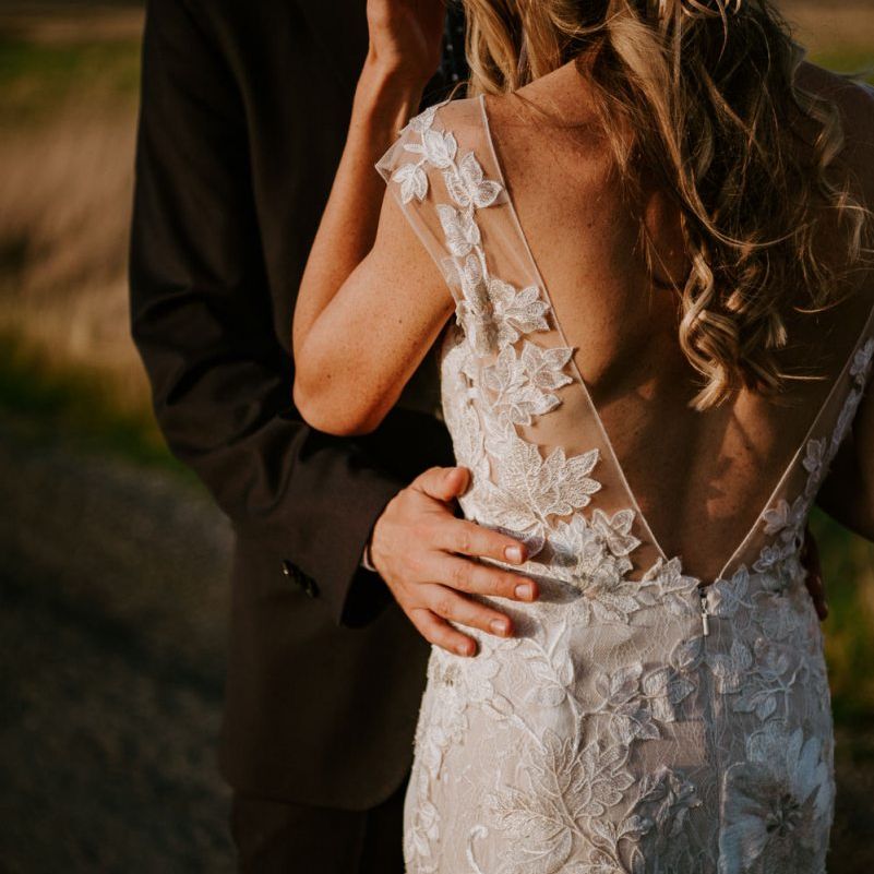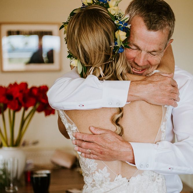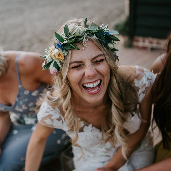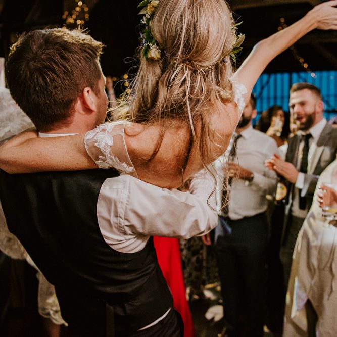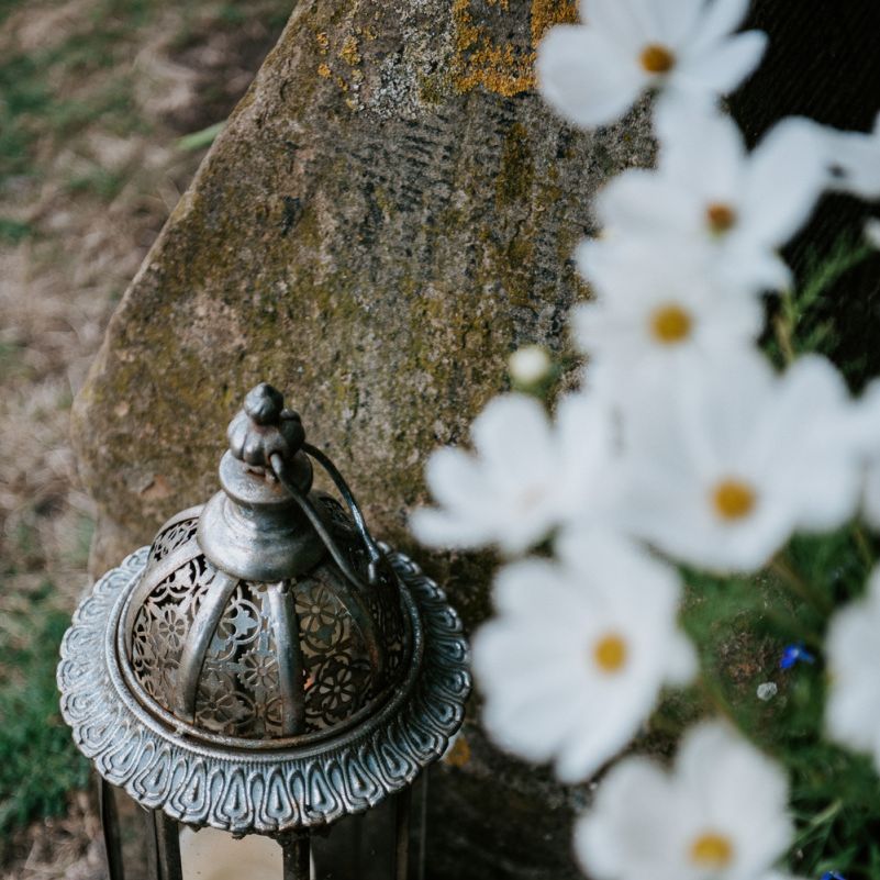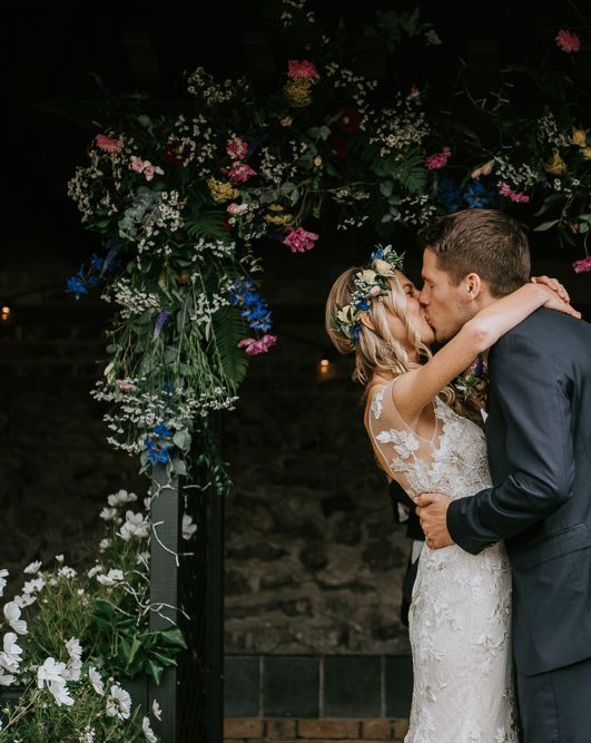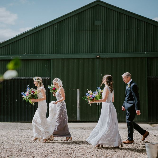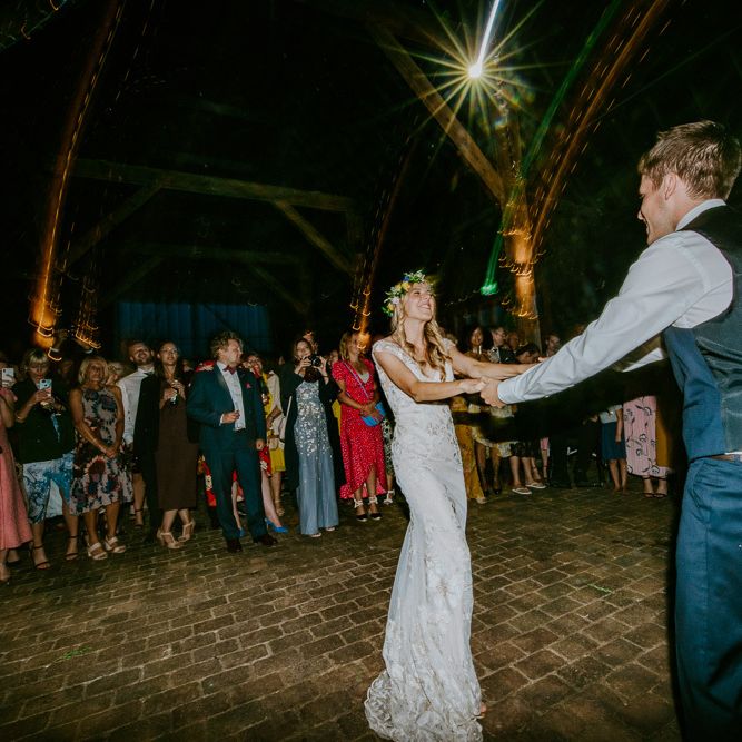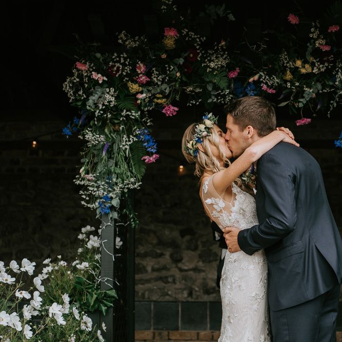 Our venue was set in the incredible beauty of Elmley Nature Reserve, so we wanted to celebrate nature and keep the styling to a minimum to complement the venue with a boho, relaxed feel. Our flowers were all English grown, meadow style and were supplemented with ferns and greenery wrapped around the pillars in the barn. The tables all had home-grown flowers in varying jam jars wrapped in hessian and lace. Our guests were staying in tipis on-site so the décor outside on the lawn reflected the festival style feel of the wedding.