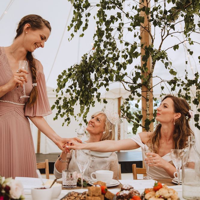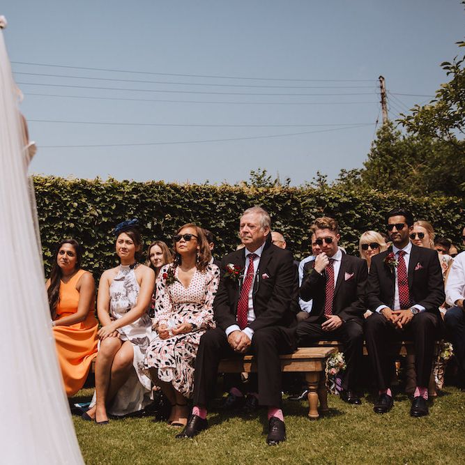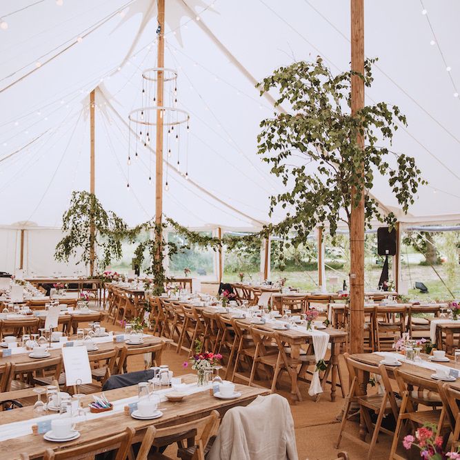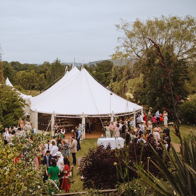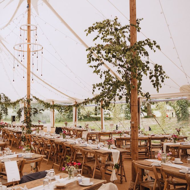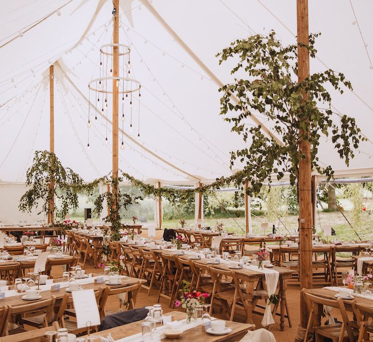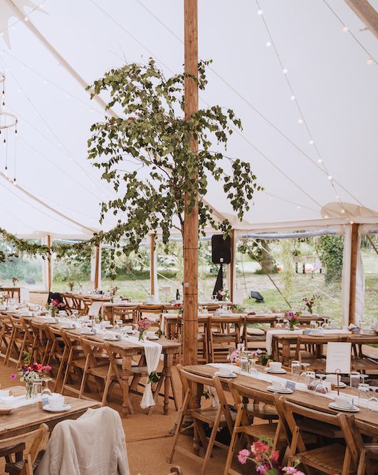 We went for a relaxed garden party vibe. We unknowingly chose the same date as Glastonbury so we set up our own Mini-Glasto with a pizza van, overnight camping and festival flags! We used Pinterest a lot through the process and the styling was mainly based around what would compliment the space and seasonal colours of the gardens that my family home provided. The marquee was perfect for the back garden, neatly nestled in between the trees. We had the sides open which allowed people to make the most of the games and chill out areas whilst the Jazz band set the perfect atmosphere. The interior of the marquee featured greenery to bring the garden indoors and trestle tables to get people mingling and sharing the afternoon tea.