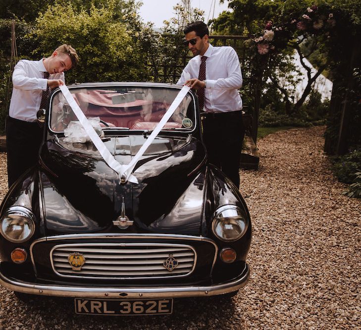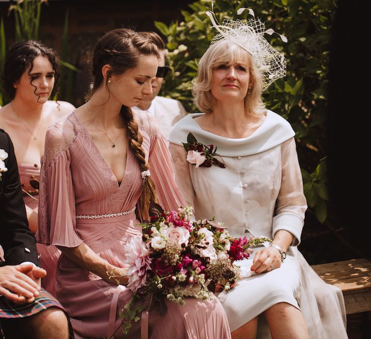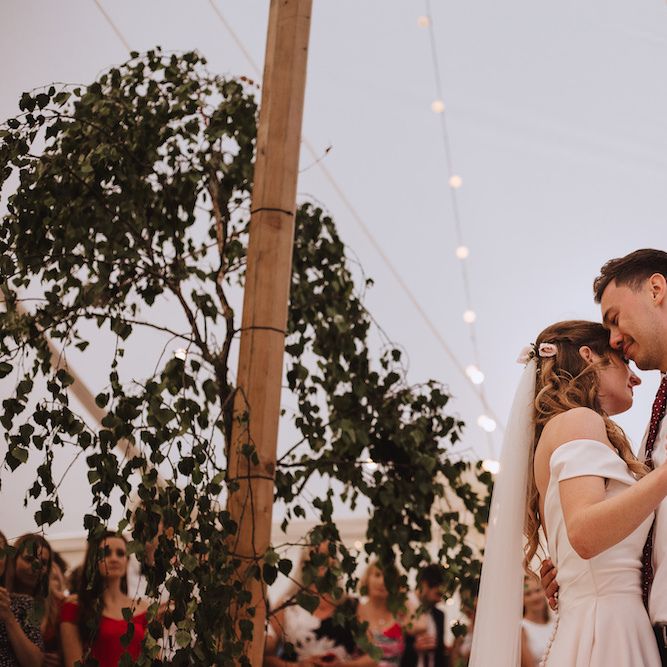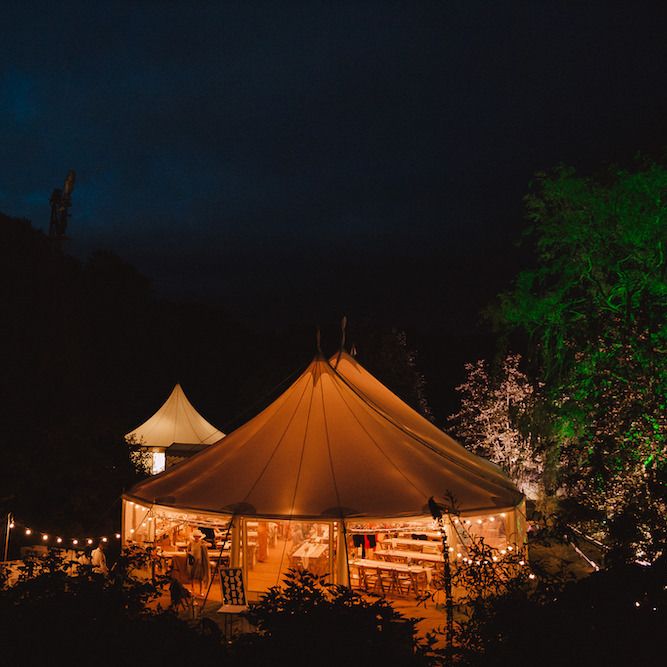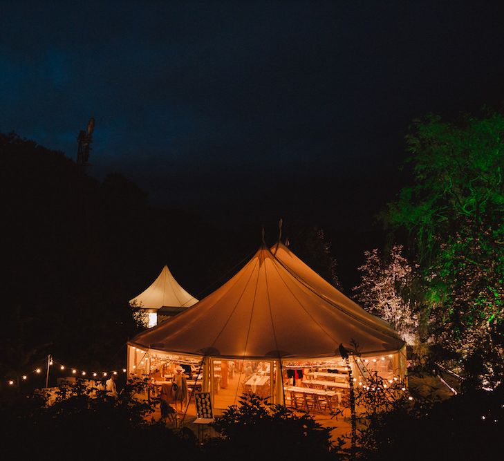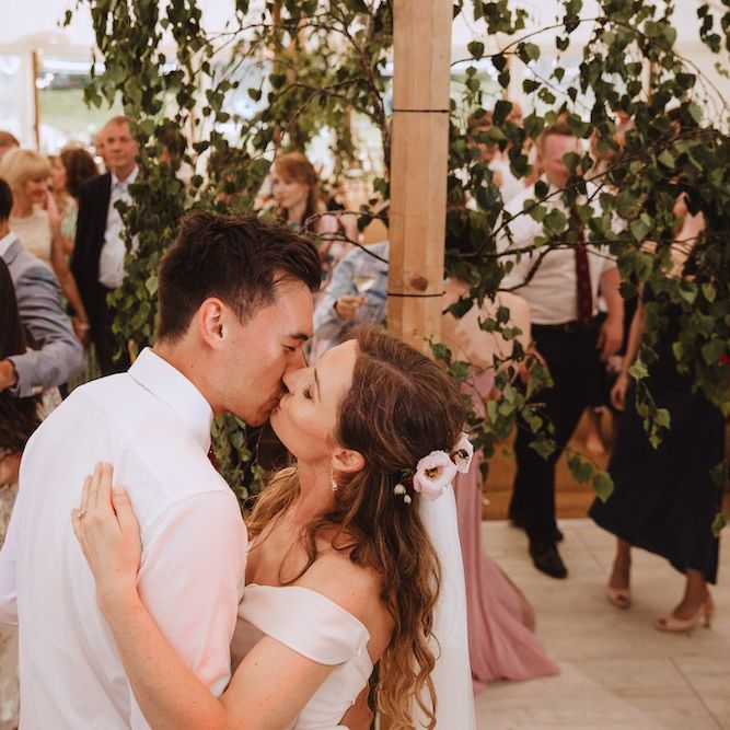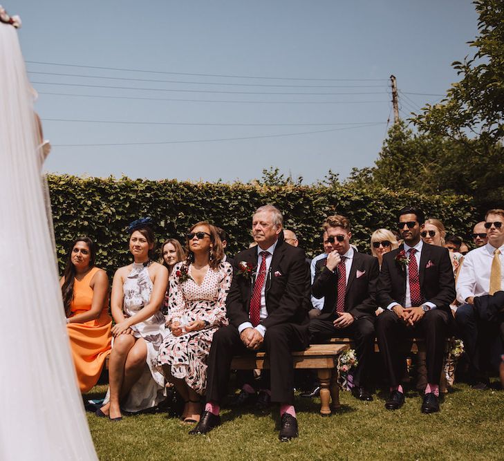 We went for a relaxed garden party vibe. We unknowingly chose the same date as Glastonbury so we set up our own Mini-Glasto with a pizza van, overnight camping and festival flags! We used Pinterest a lot through the process and the styling was mainly based around what would compliment the space and seasonal colours of the gardens that my family home provided. The marquee was perfect for the back garden, neatly nestled in between the trees. We had the sides open which allowed people to make the most of the games and chill out areas whilst the Jazz band set the perfect atmosphere. The interior of the marquee featured greenery to bring the garden indoors and trestle tables to get people mingling and sharing the afternoon tea.