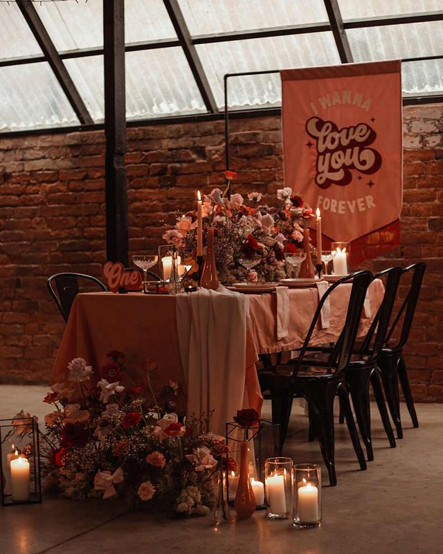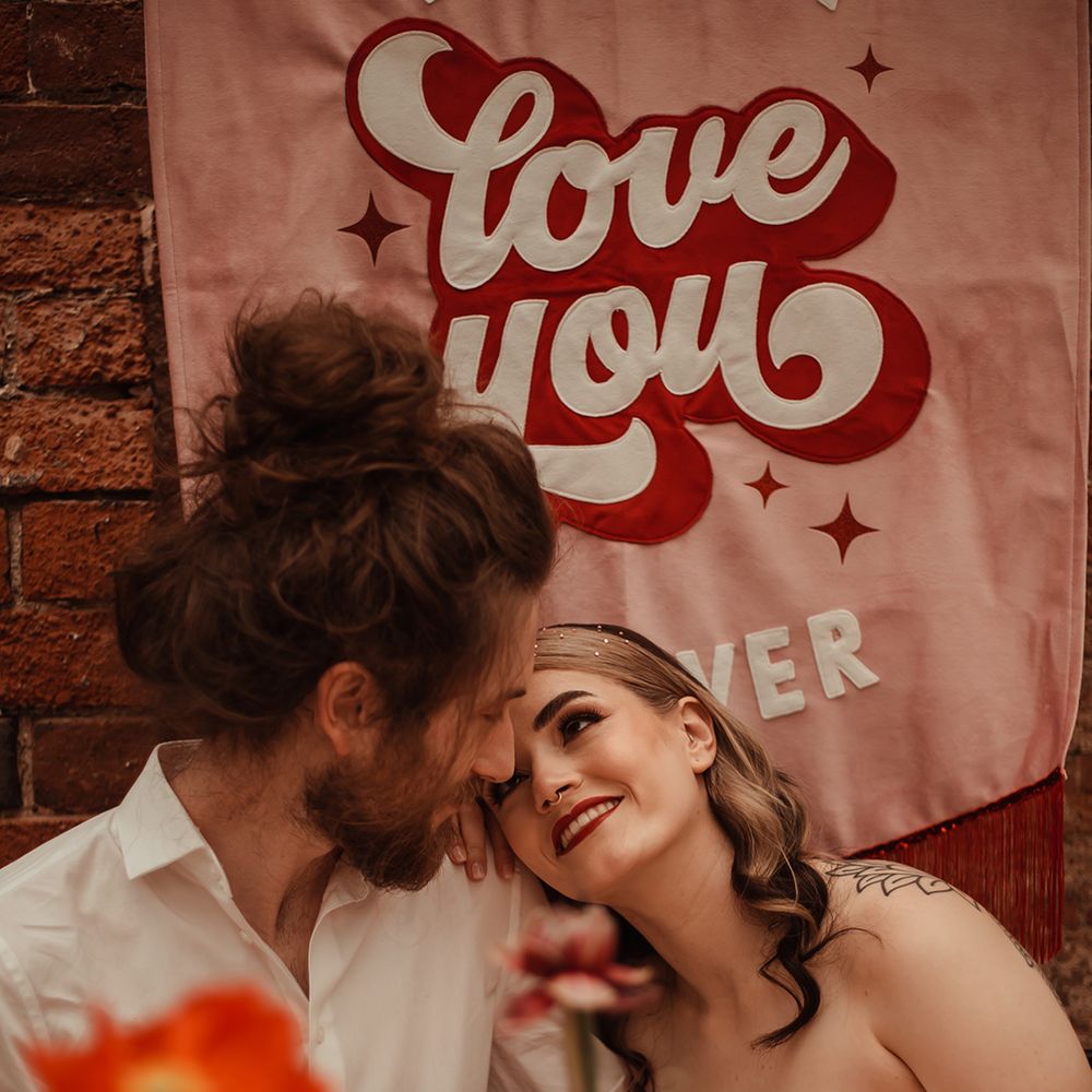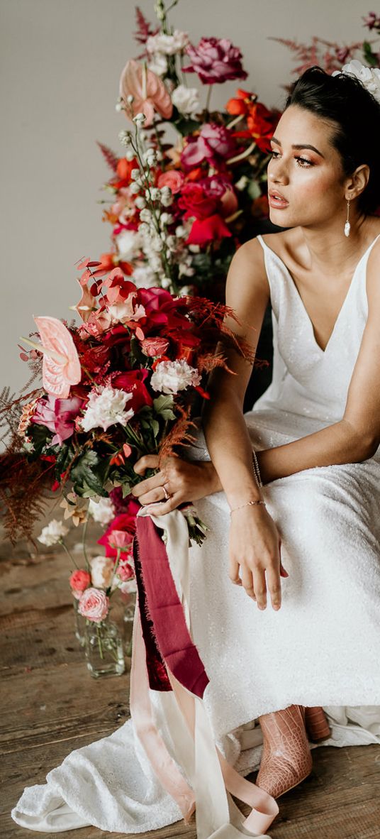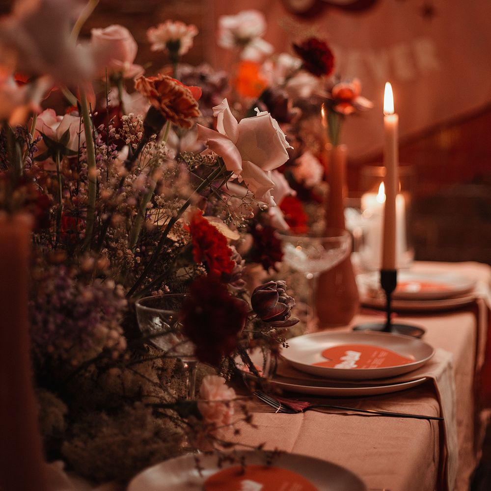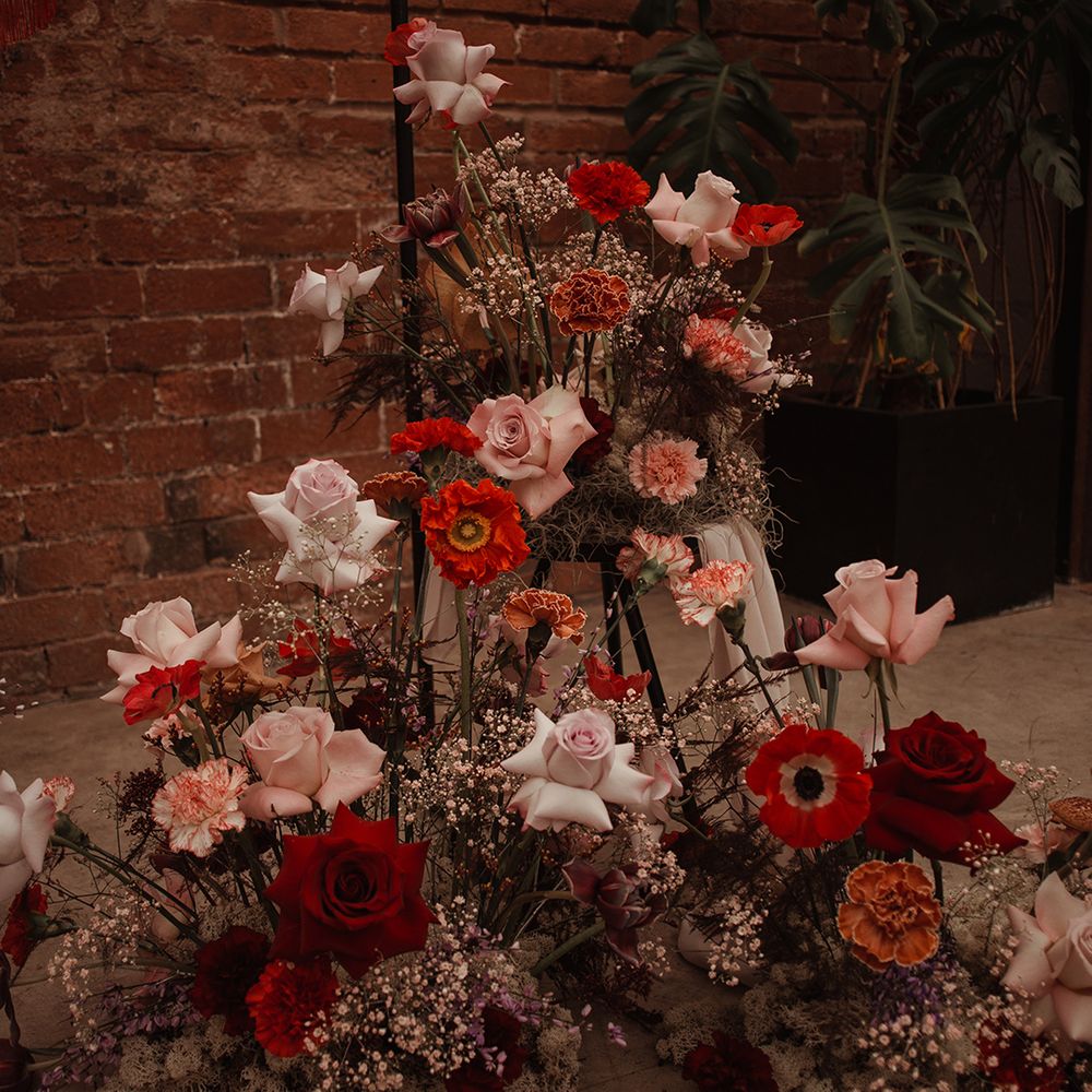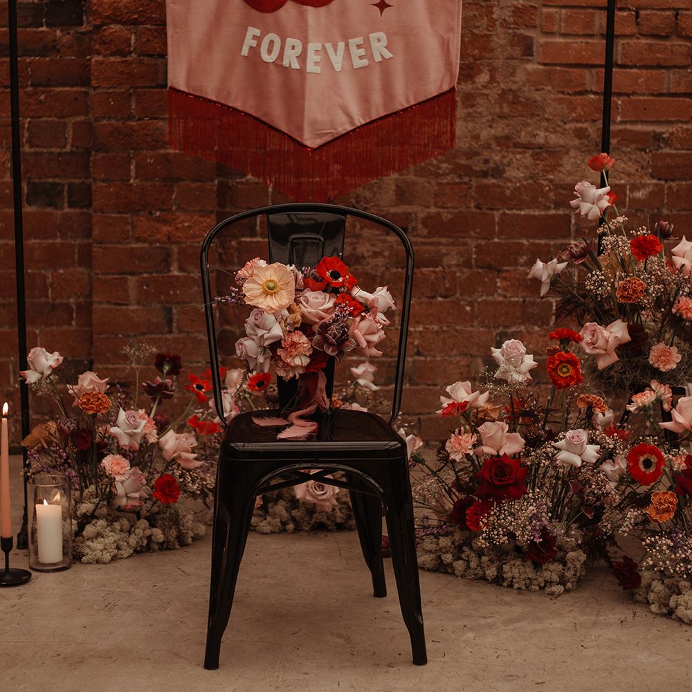 We wanted bright pinks and reds throughout the shoot, with heart-shaped accents. We created a sustainable meadow-style arrangement. The colours were a mix of light and shade, with bright red colour pops and softer pink and lilac tones.