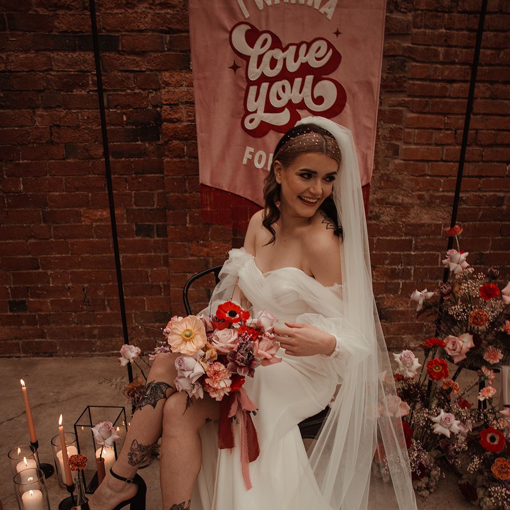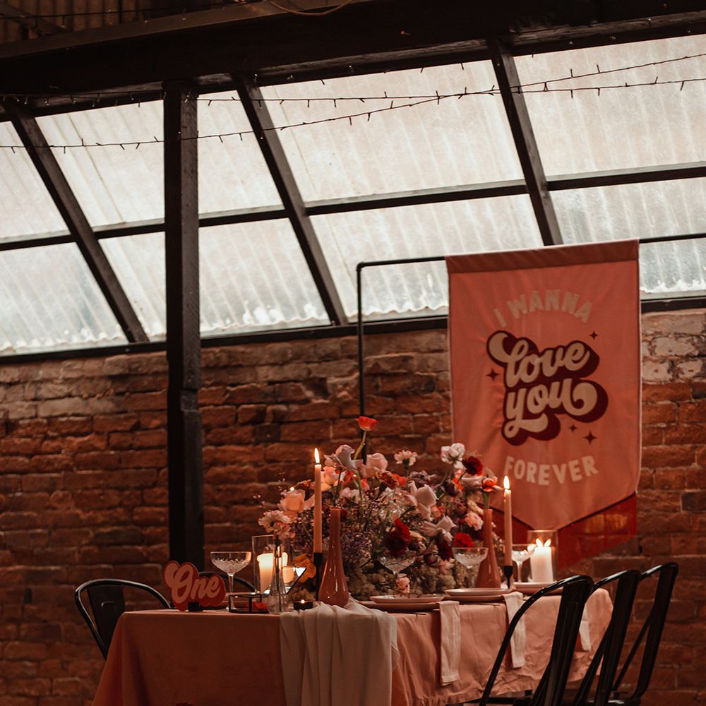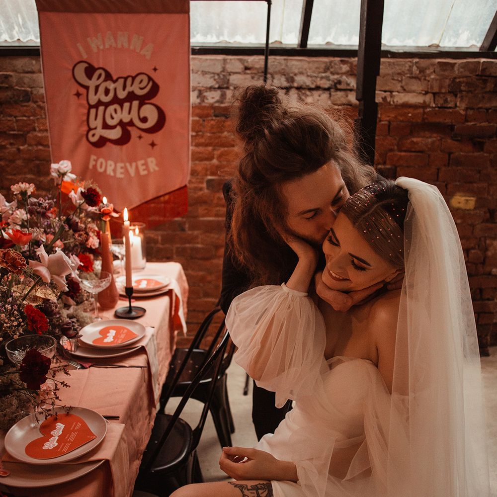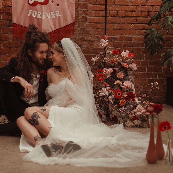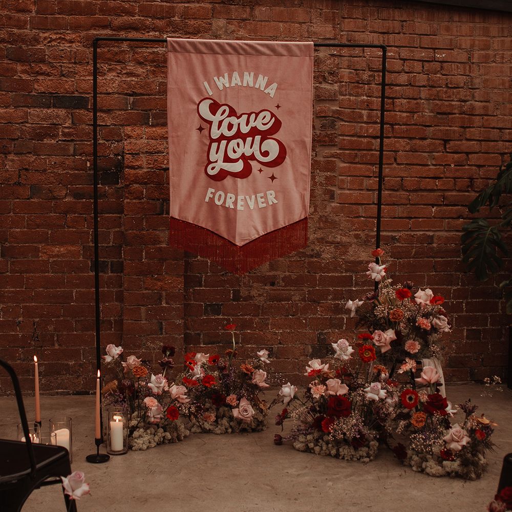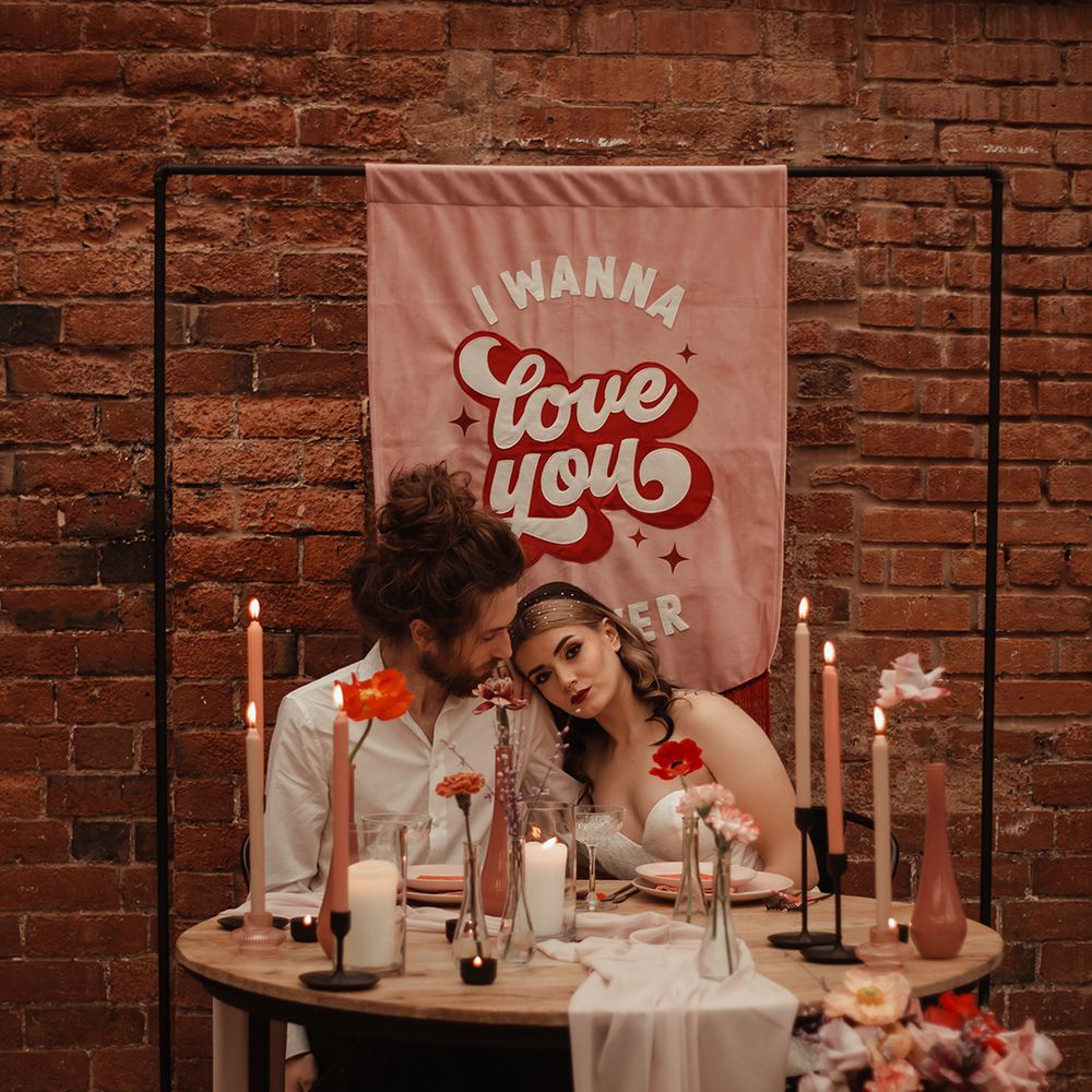 We wanted bright pinks and reds throughout the shoot, with heart-shaped accents. We created a sustainable meadow-style arrangement. The colours were a mix of light and shade, with bright red colour pops and softer pink and lilac tones.