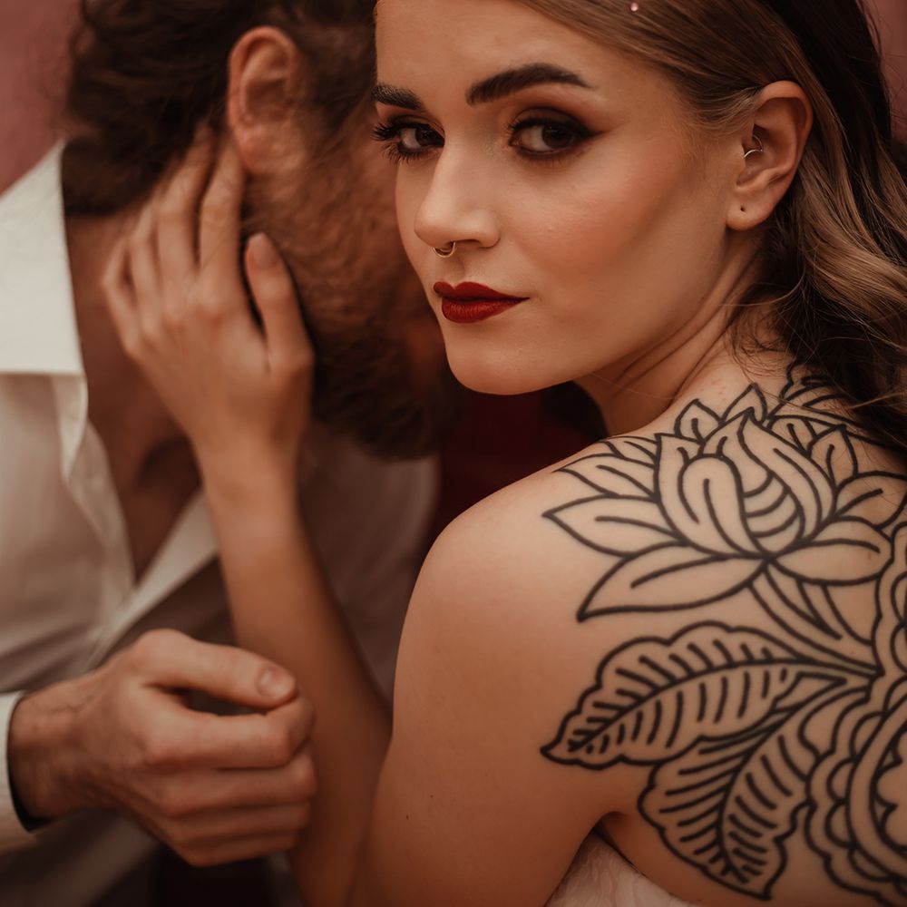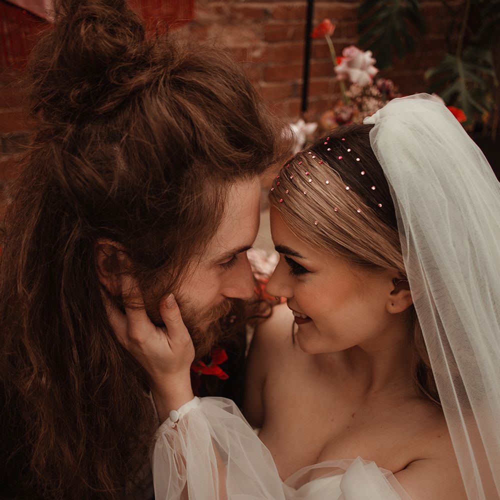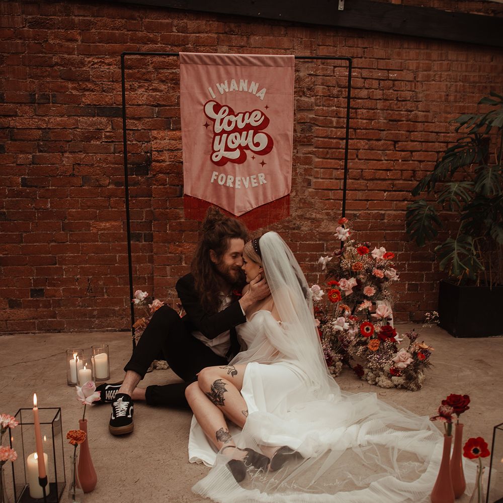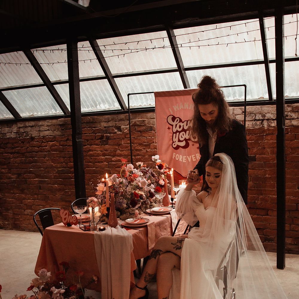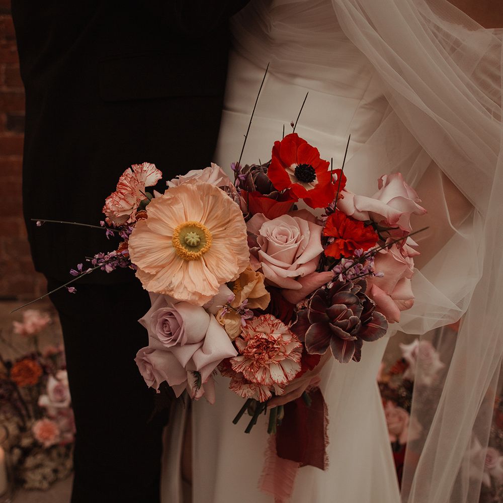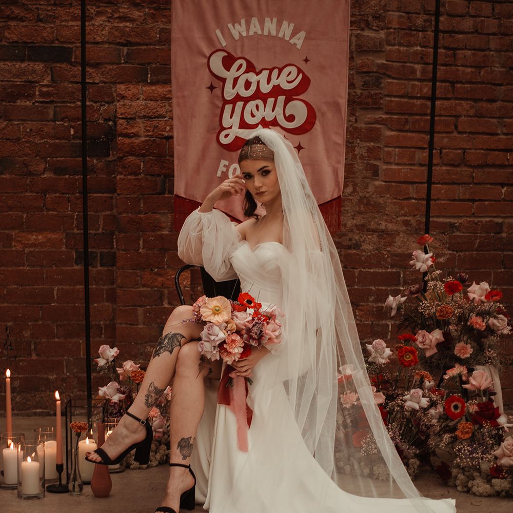 We wanted bright pinks and reds throughout the shoot, with heart-shaped accents. We created a sustainable meadow-style arrangement. The colours were a mix of light and shade, with bright red colour pops and softer pink and lilac tones.
