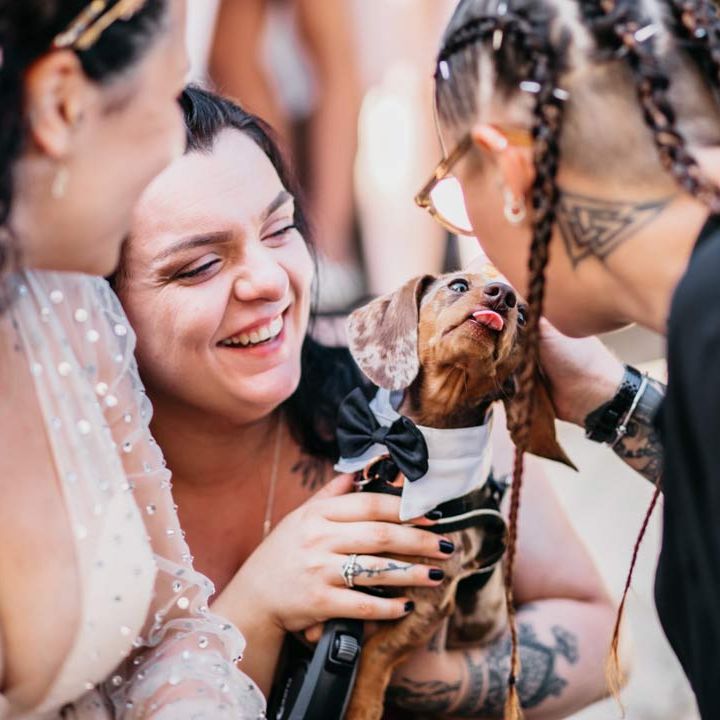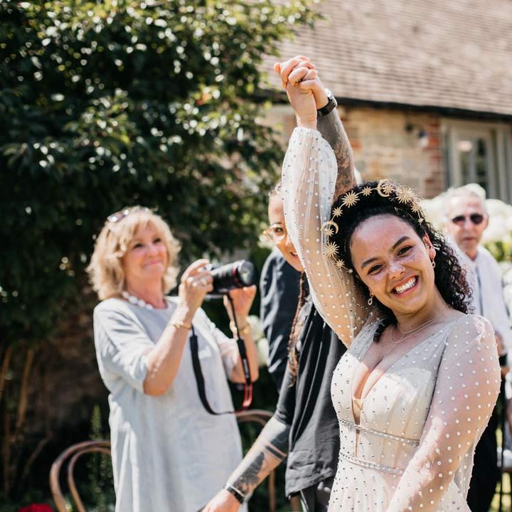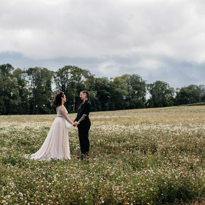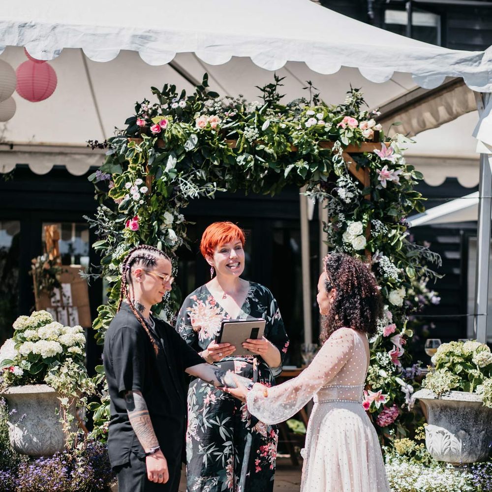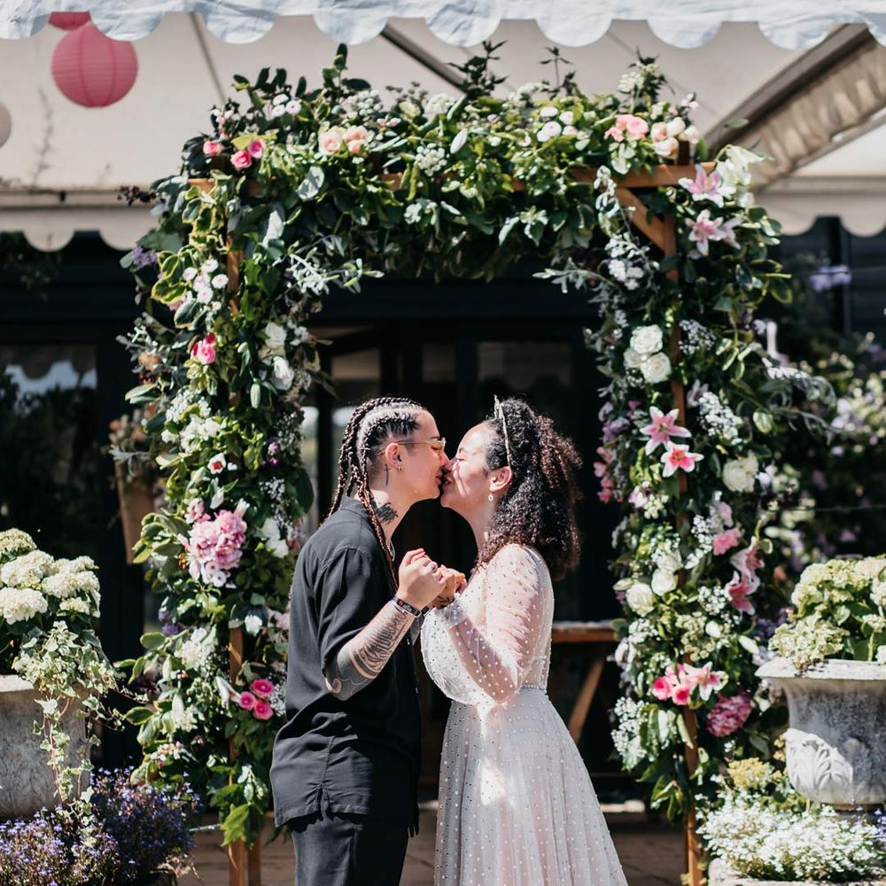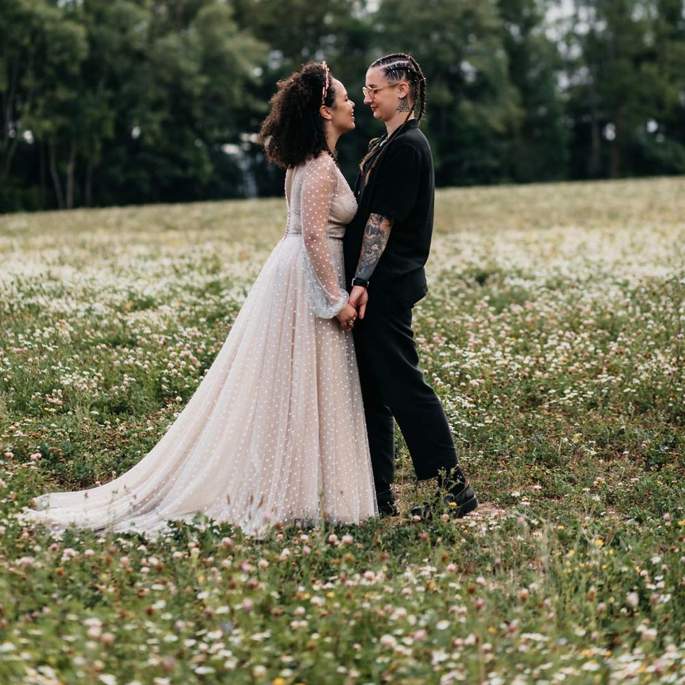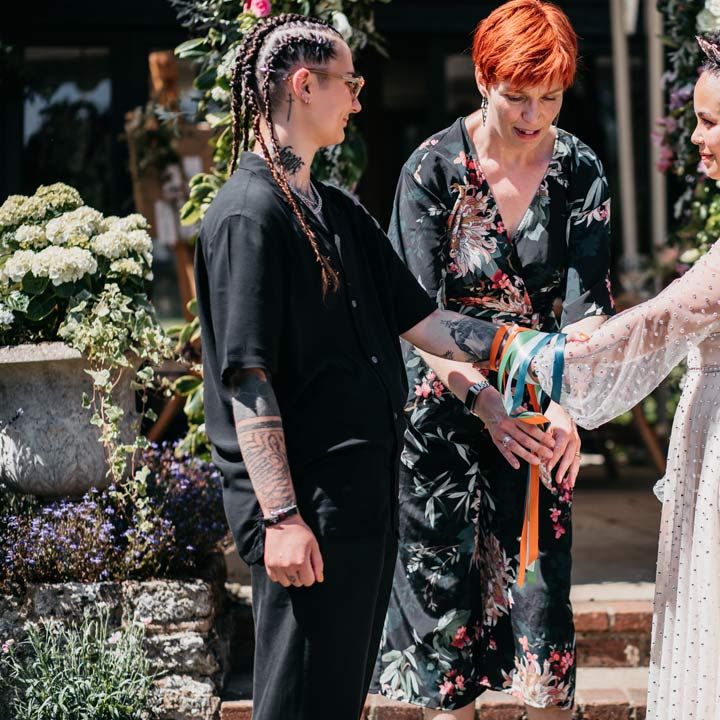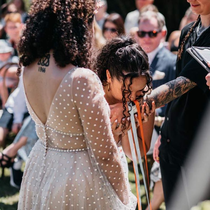 Despite their origins dating back over two millennia, handfasting ceremonies have experienced a resurgence in popularity. Today, couples are actively seeking meaningful ways to infuse symbolism into their unions. Derived from ancient Celtic customs, a handfasting ceremony stands as a poignant emblem of the intertwining of two lives. This symbolism is visually embodied by the binding of the couple's hands using a cord, reminiscent of the familiar phrase "tying the knot." Once the hands are joined, spoken words reverberate, encapsulating sentiments of commitment and unity. Interestingly, the creators initially designed this ritual for engagements, rather than weddings, to signify the forthcoming union and a willingness to remain together—a state that traditionally lasted for about a year. Wanting to really celebrate the beauty of queer love, Torria & Allegra went for an at-home handfasting ceremony - a Norse tradition. They also intertwined their love of flowers into their Viking themed wedding. The couple decided to have a simple, colourful, botanical, rustic vibe. The bridal outfits tied their theme together seamlessly. Torria rocked a gorgeous Willowby by Watters sheer dress with an incredible gold bridal crown, and Allegra's long braids were certainly Viking-esque. The entire day was meaningful, special, and filled to the brim with love.