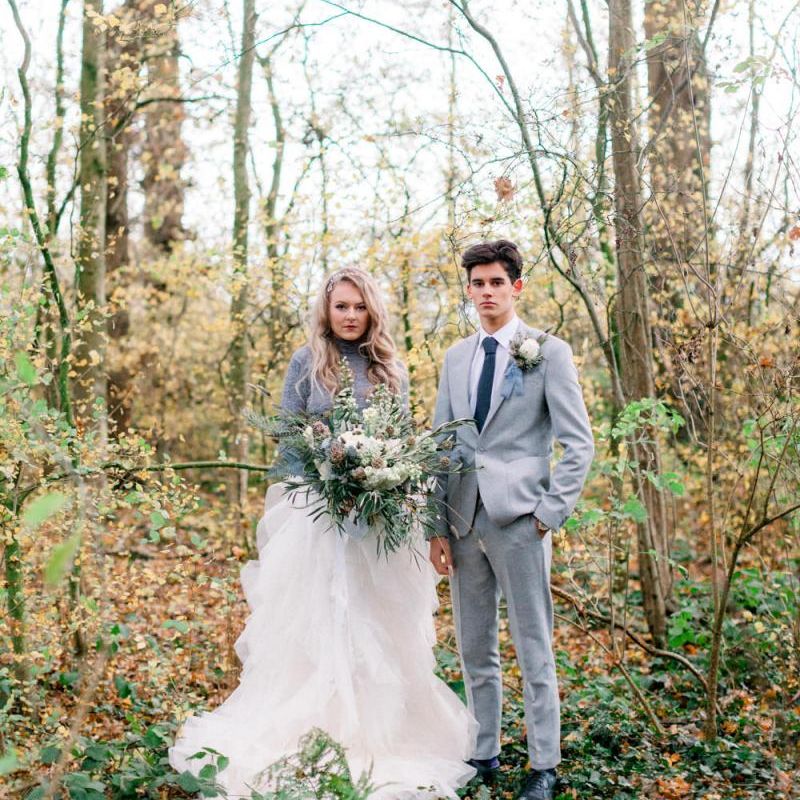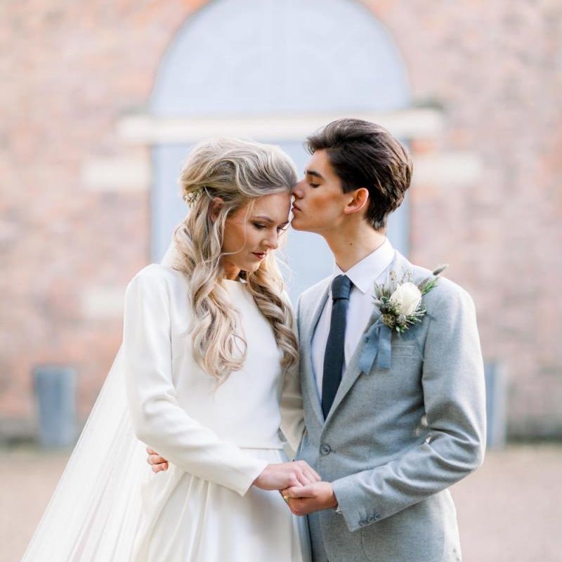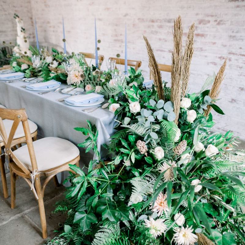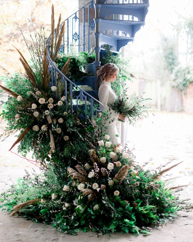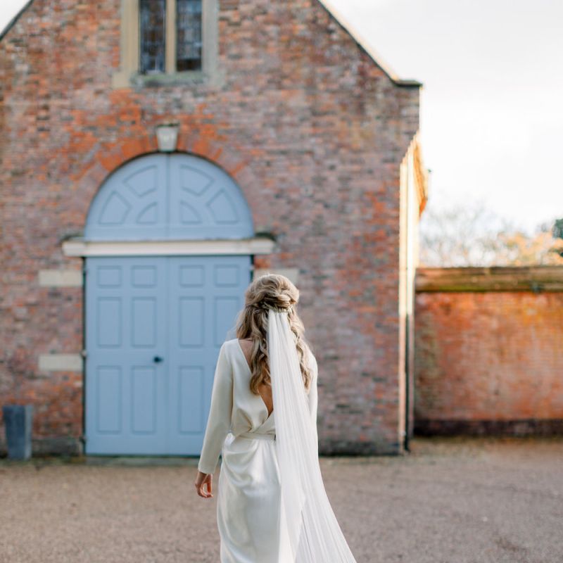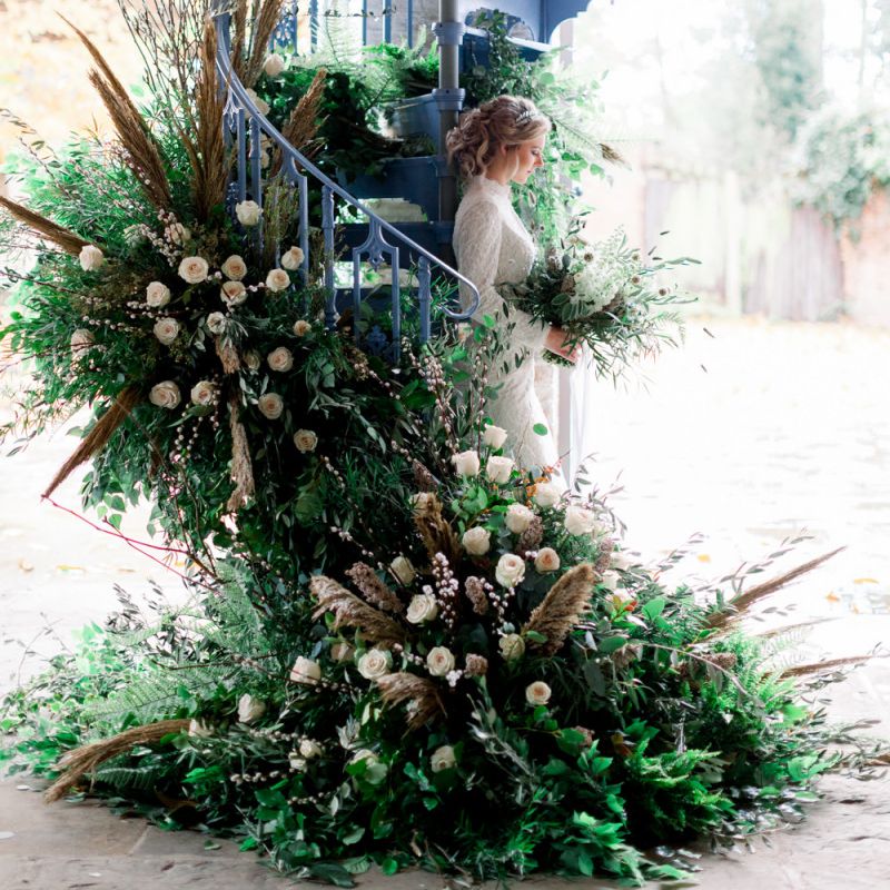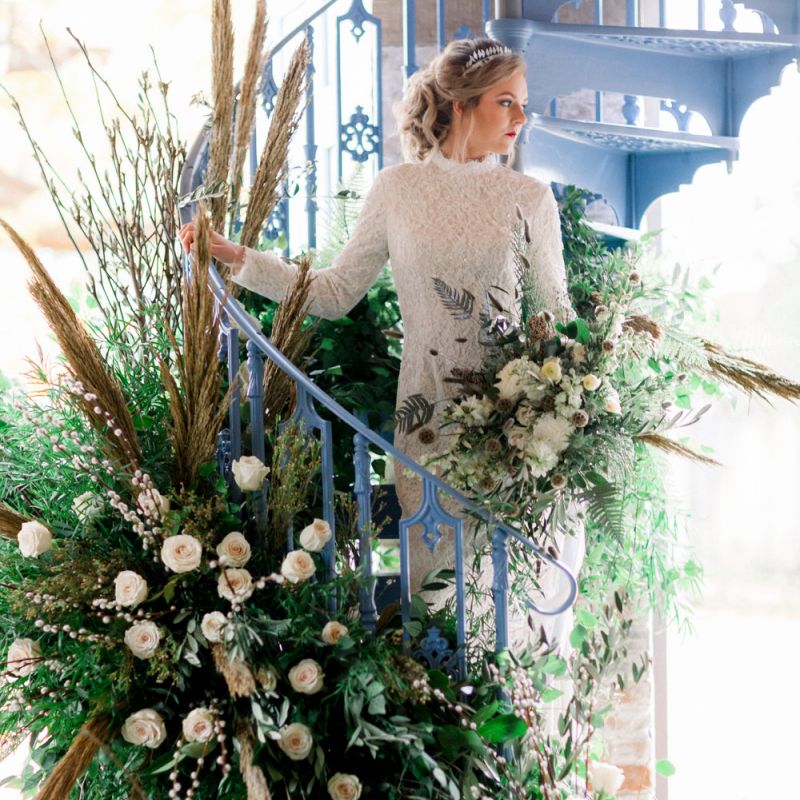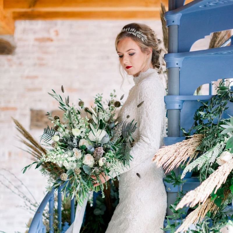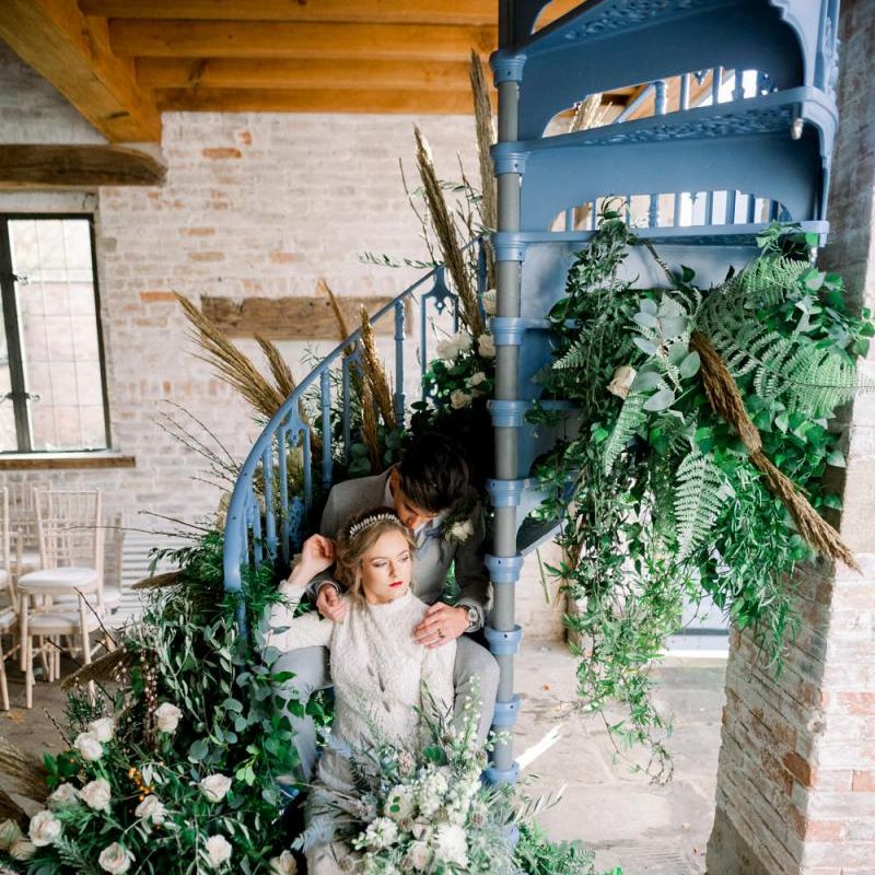 A group of talented wedding creatives headed for a beautiful styled shoot at the Cheshire wedding venue Dorfold Hall, a firm favourite among couples and suppliers alike. Capturing the magic and beauty that Winter has to offer was a major priority, and inspiration was taken from the beautiful shade of pale blue used on the Coach House doors and spiral staircase. This formed the basis for the cool colour palette, blues, greens, whites and pops of pale peach were used in the flowers, table set up and cake.