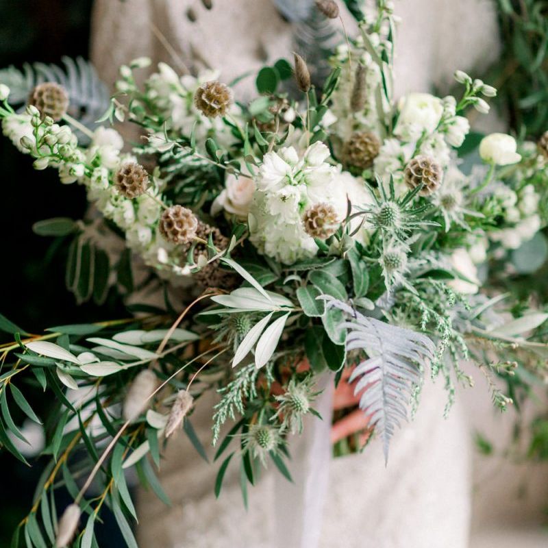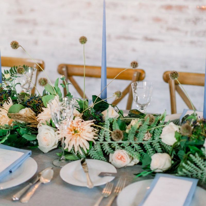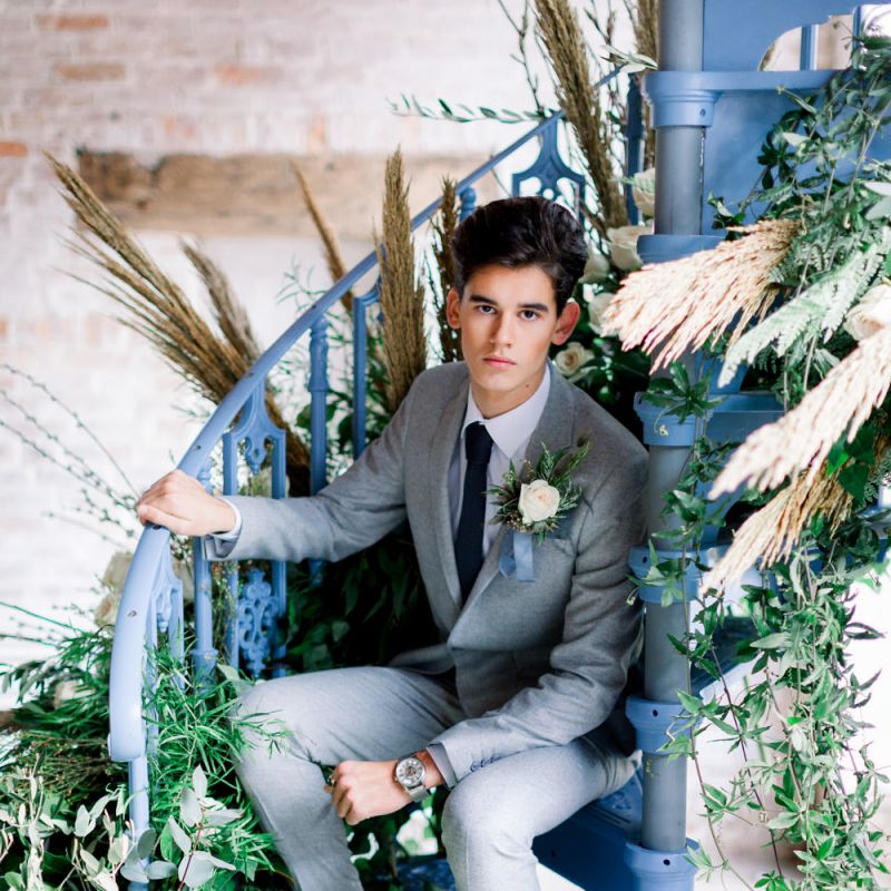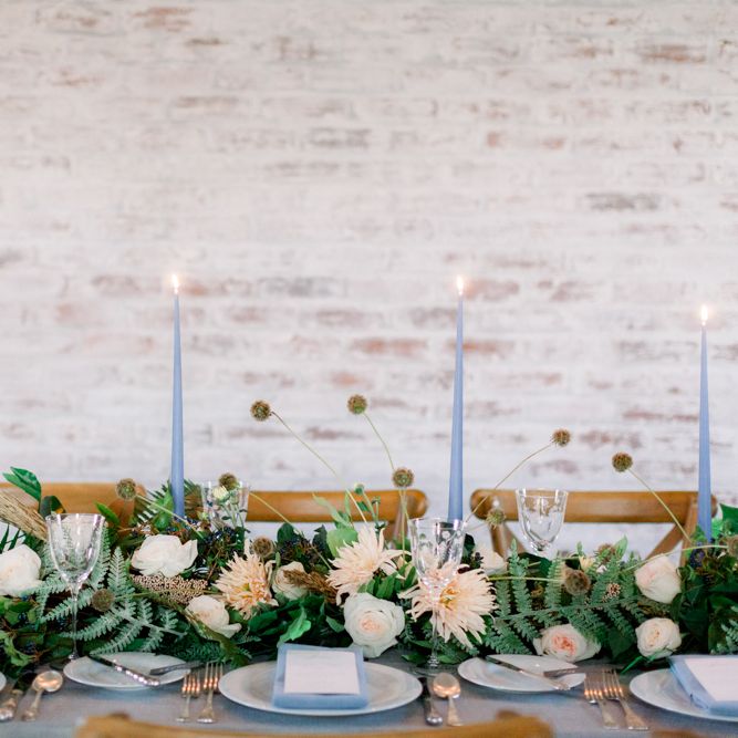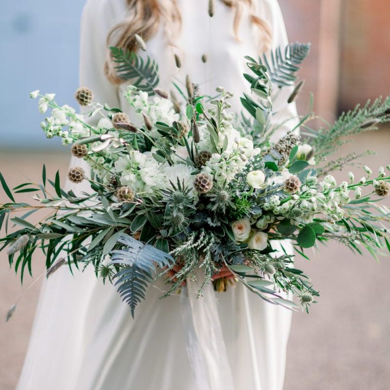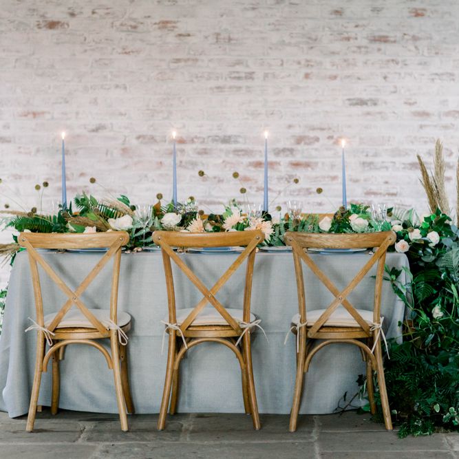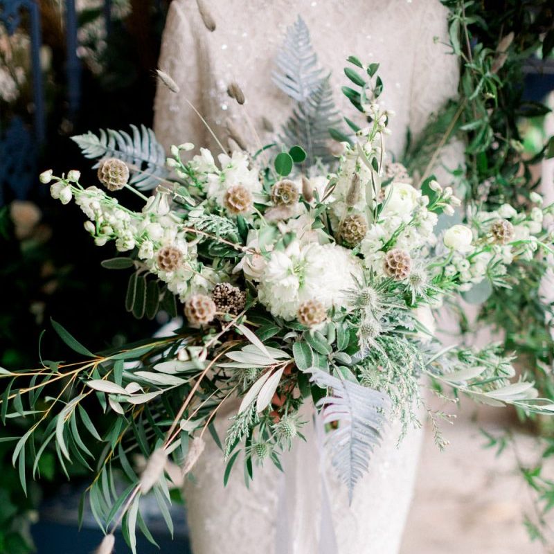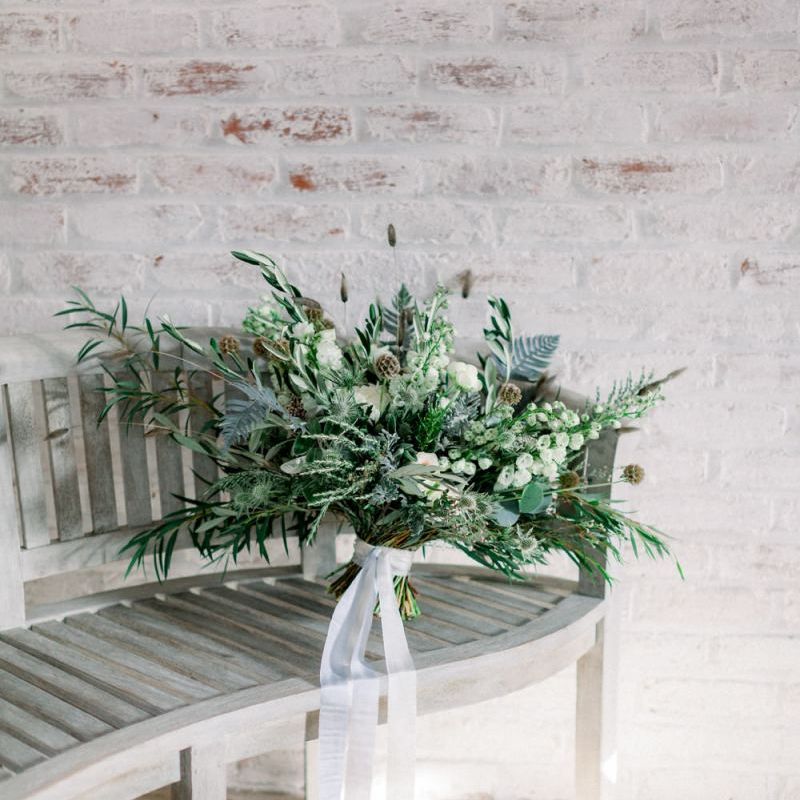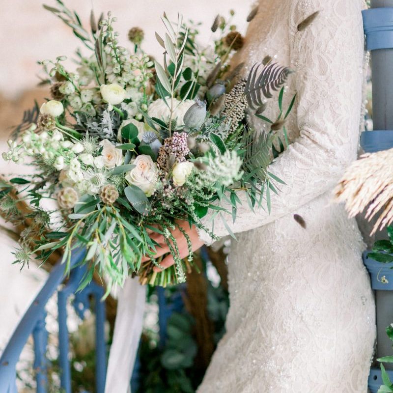 A group of talented wedding creatives headed for a beautiful styled shoot at the Cheshire wedding venue Dorfold Hall, a firm favourite among couples and suppliers alike. Capturing the magic and beauty that Winter has to offer was a major priority, and inspiration was taken from the beautiful shade of pale blue used on the Coach House doors and spiral staircase. This formed the basis for the cool colour palette, blues, greens, whites and pops of pale peach were used in the flowers, table set up and cake.