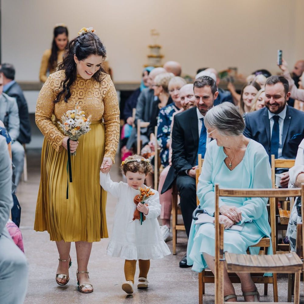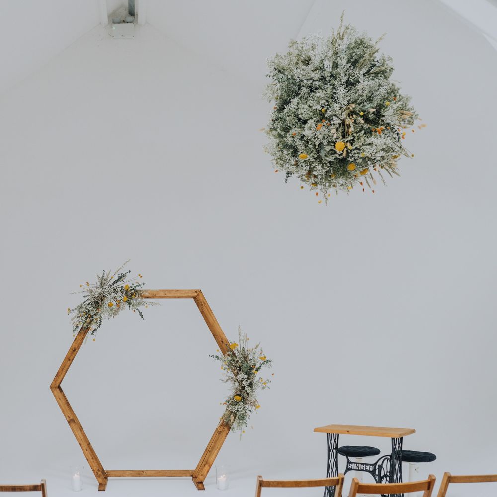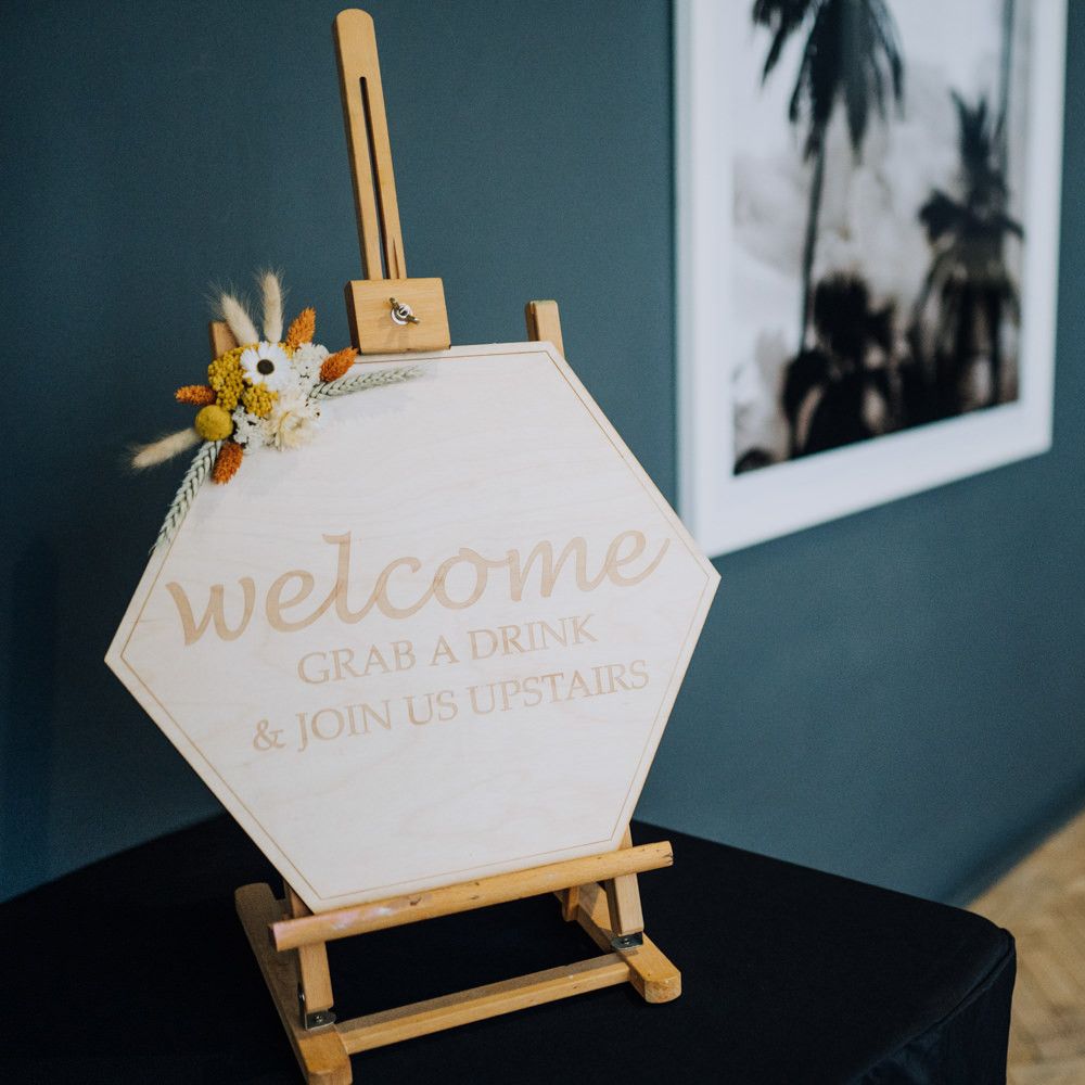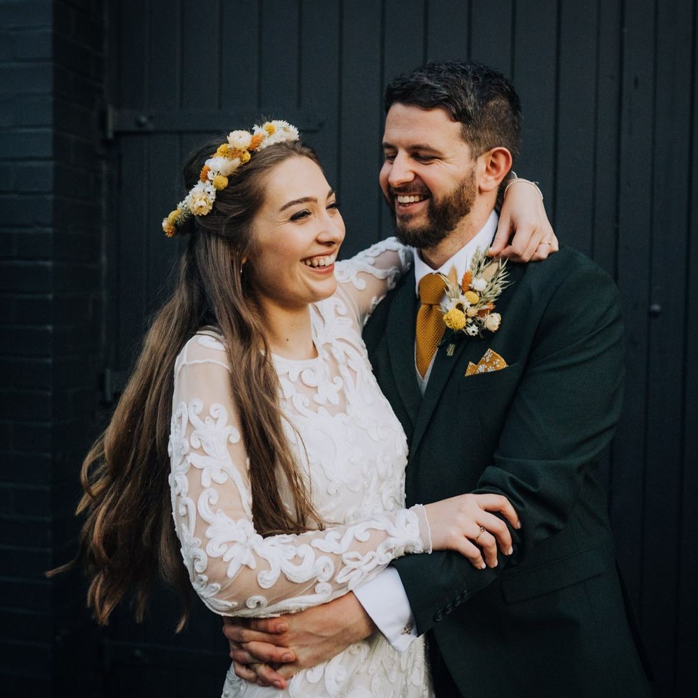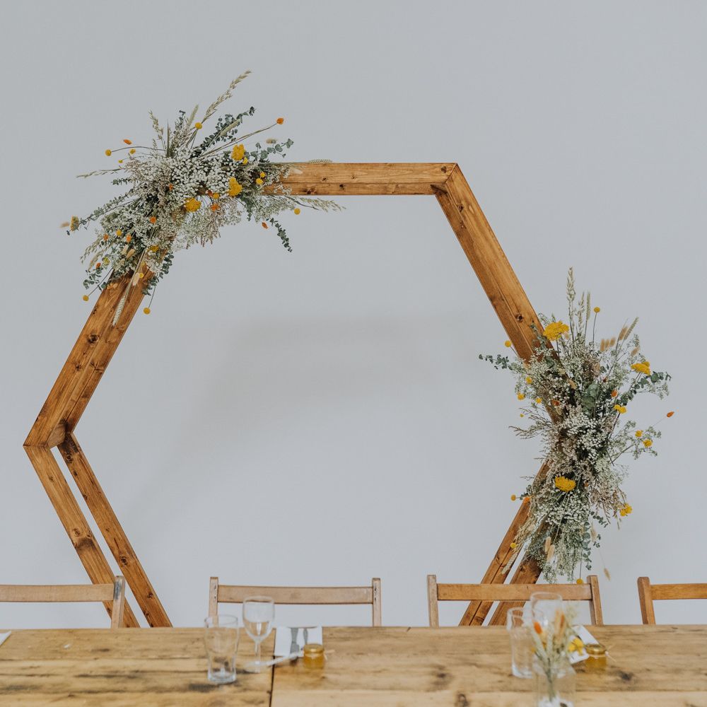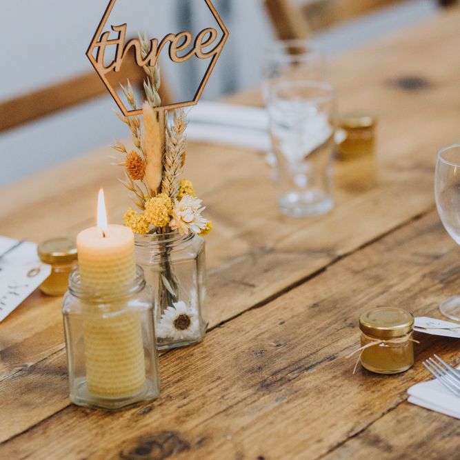 We wanted to create a personal, autumnal themed, eco-conscious wedding day. The honeybee theme naturally crept in as Chloe is a beekeeper and it really matched the earthy, organic aesthetic. Honey bottled in recycled jars as favours, doubled up as guest place-names thanks to a talented bridesmaids' calligraphy skills! We chose to stay local so that as many friends and family as possible could attend to celebrate and party with us. The DIY approach was something we were really looking forward to, as we are both very creative and practical people. We are also lucky enough to have an abundance of family & friends who wanted to chip in and help us, in any way possible.