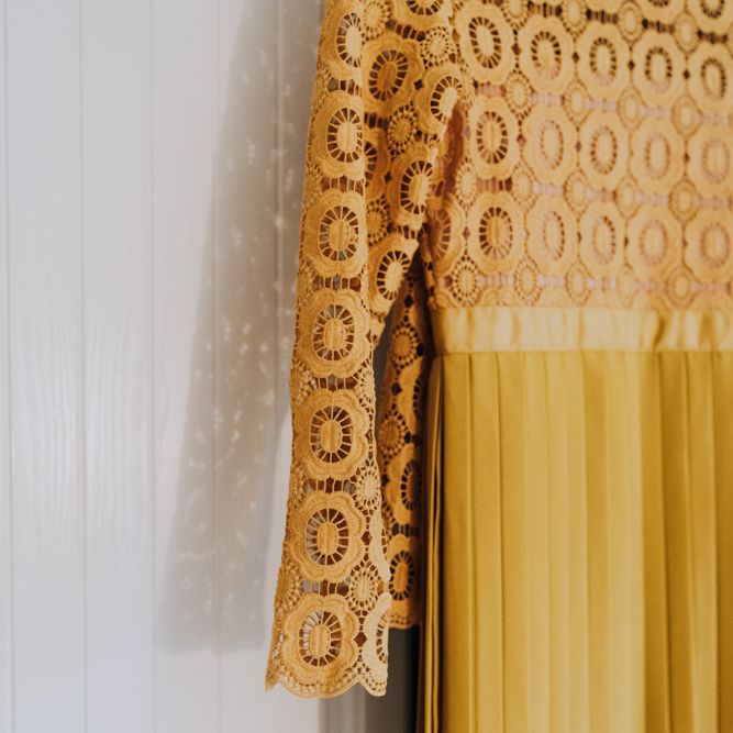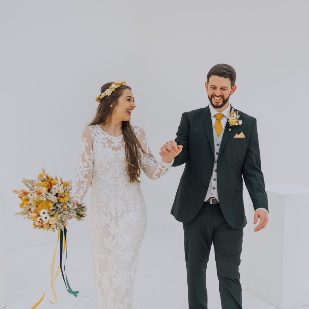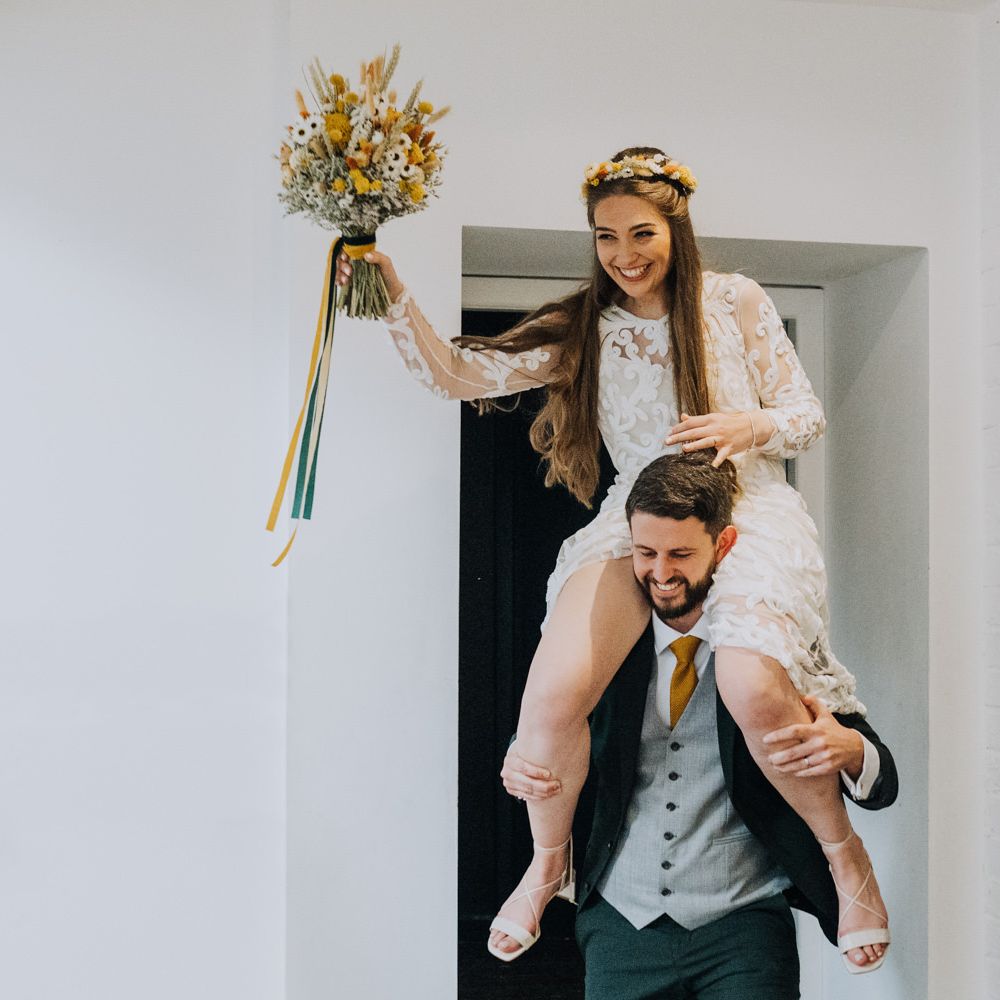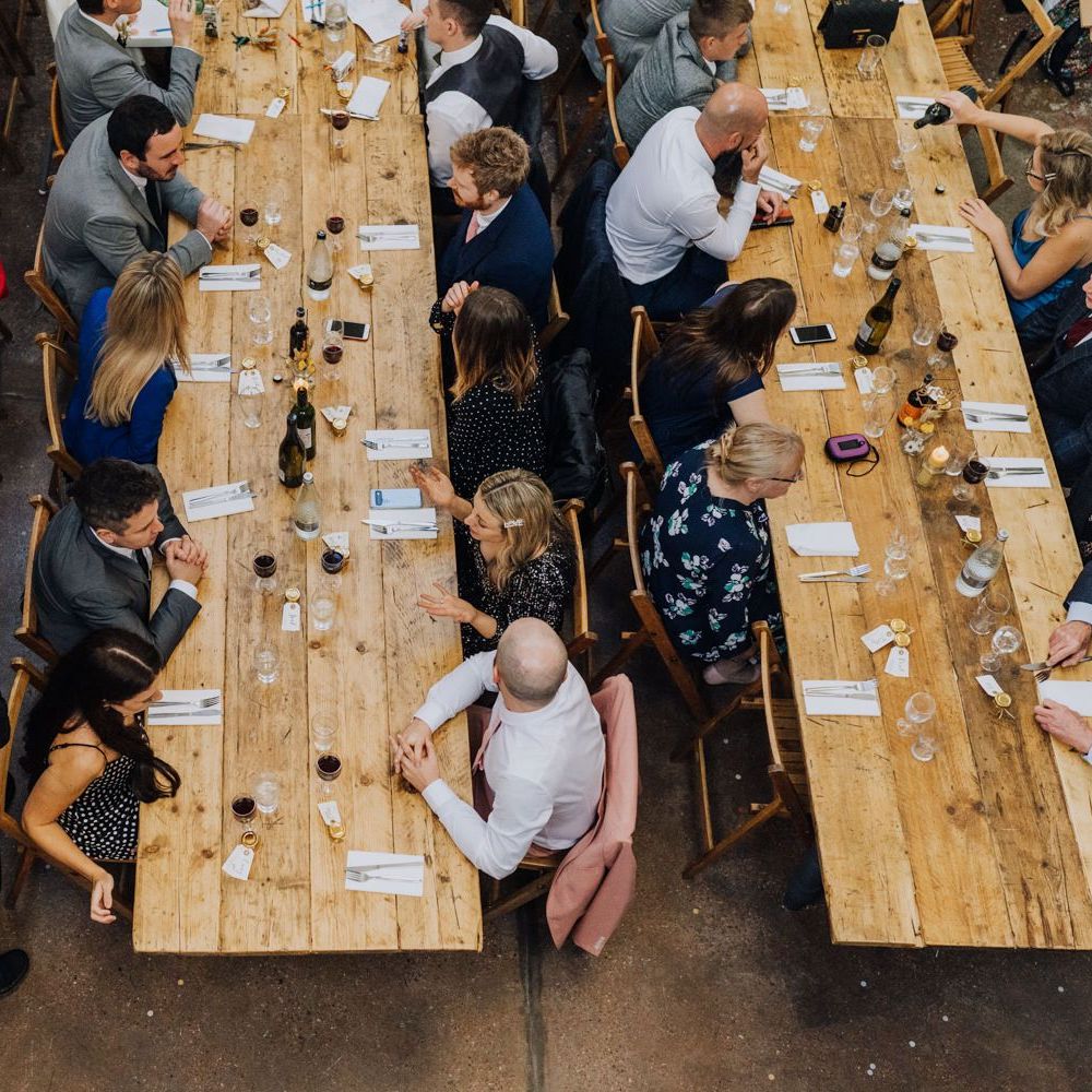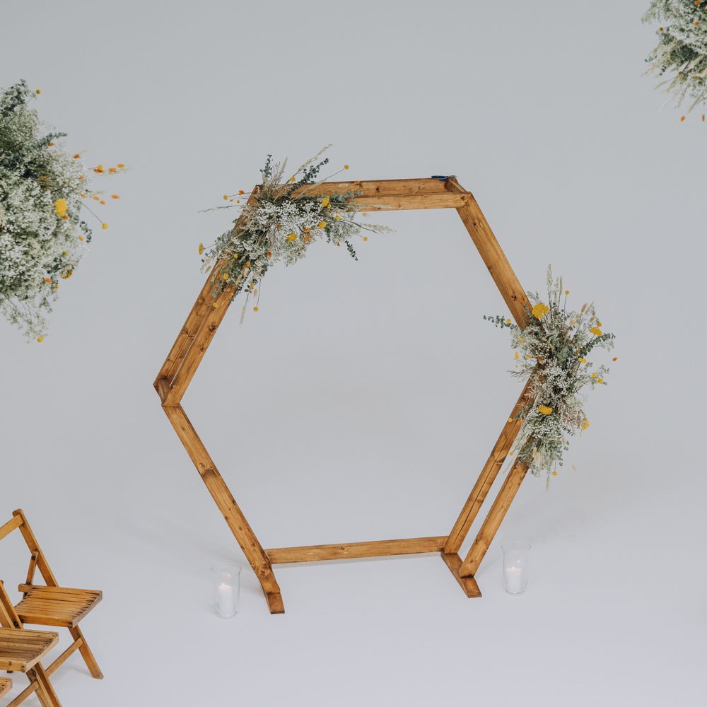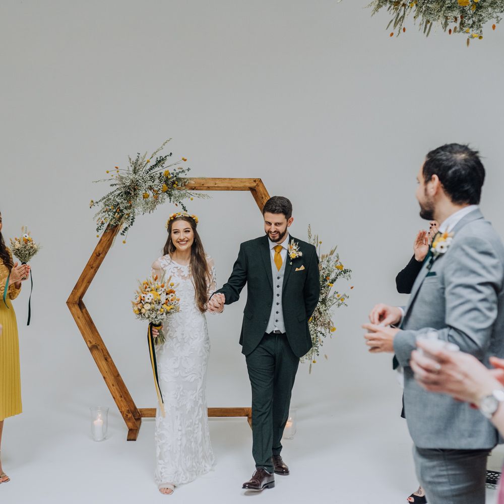 We wanted to create a personal, autumnal themed, eco-conscious wedding day. The honeybee theme naturally crept in as Chloe is a beekeeper and it really matched the earthy, organic aesthetic. Honey bottled in recycled jars as favours, doubled up as guest place-names thanks to a talented bridesmaids' calligraphy skills! We chose to stay local so that as many friends and family as possible could attend to celebrate and party with us. The DIY approach was something we were really looking forward to, as we are both very creative and practical people. We are also lucky enough to have an abundance of family & friends who wanted to chip in and help us, in any way possible.