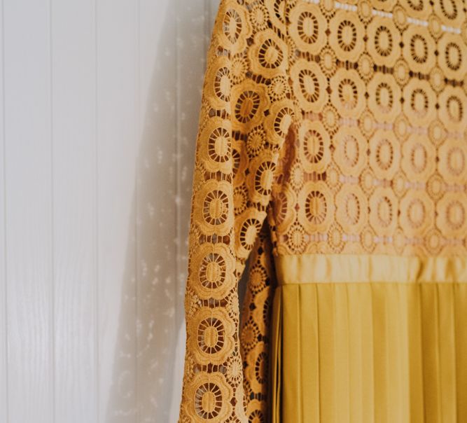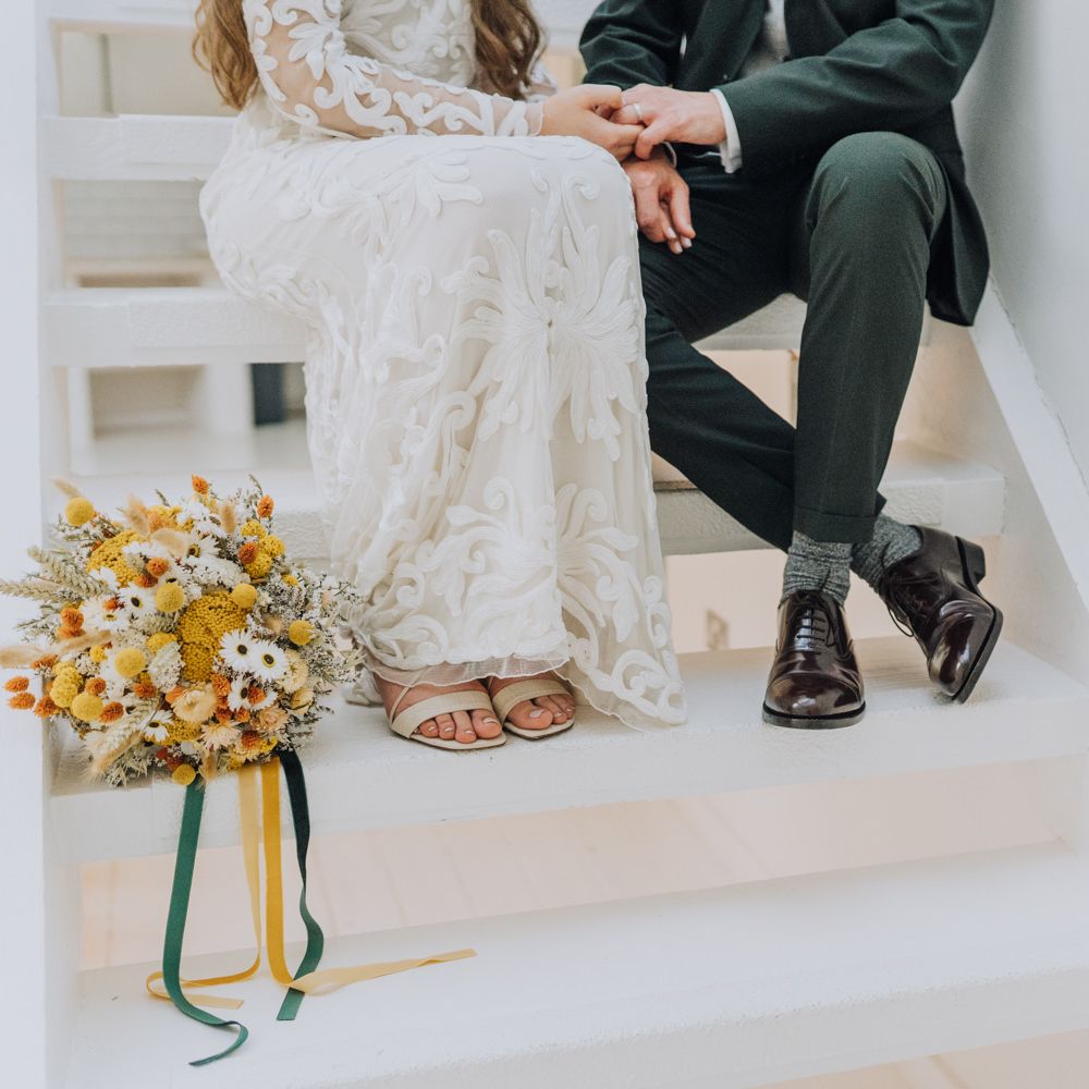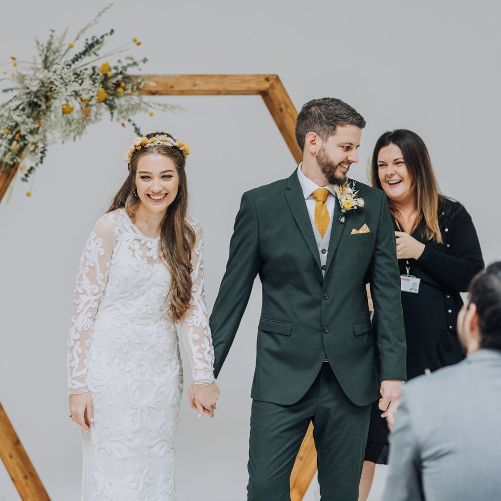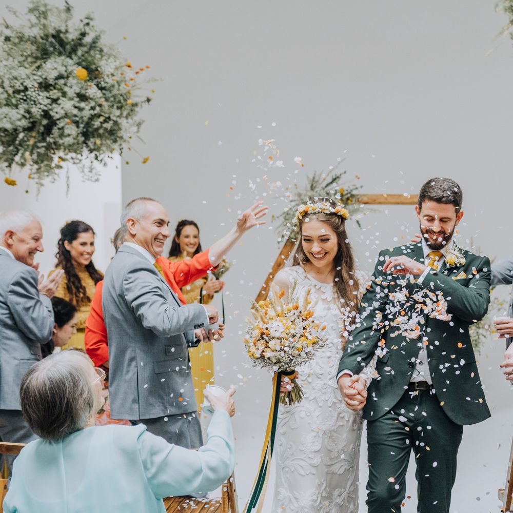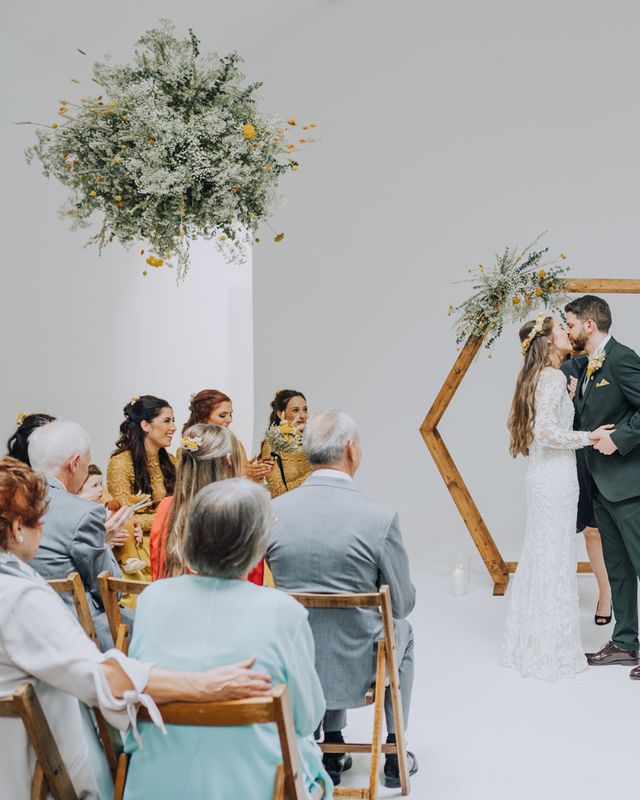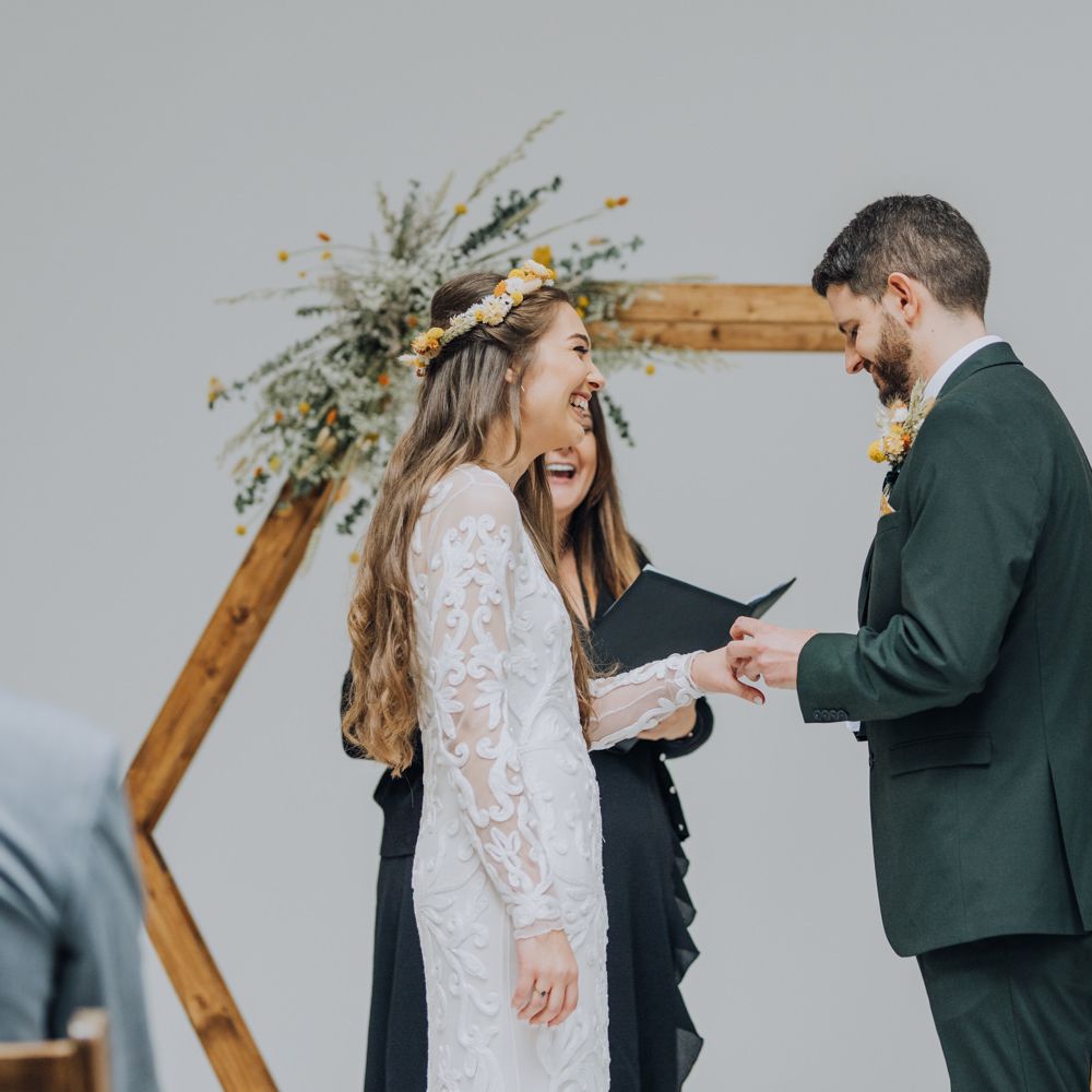 We wanted to create a personal, autumnal themed, eco-conscious wedding day. The honeybee theme naturally crept in as Chloe is a beekeeper and it really matched the earthy, organic aesthetic. Honey bottled in recycled jars as favours, doubled up as guest place-names thanks to a talented bridesmaids' calligraphy skills! We chose to stay local so that as many friends and family as possible could attend to celebrate and party with us. The DIY approach was something we were really looking forward to, as we are both very creative and practical people. We are also lucky enough to have an abundance of family & friends who wanted to chip in and help us, in any way possible.