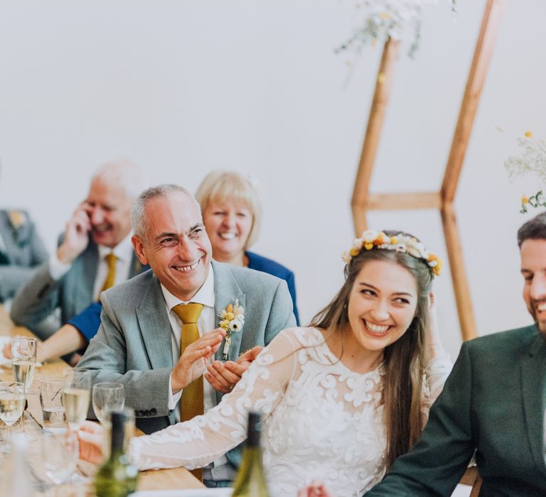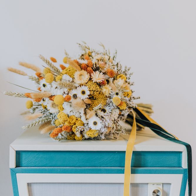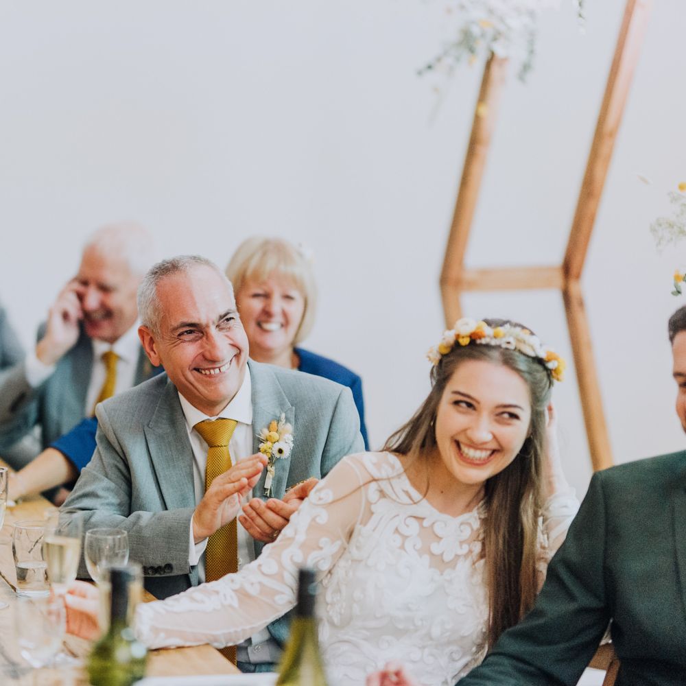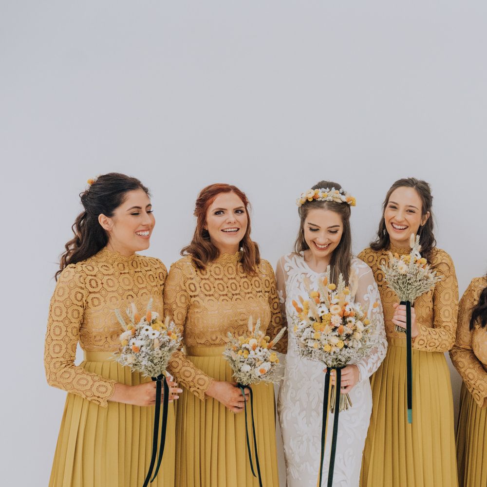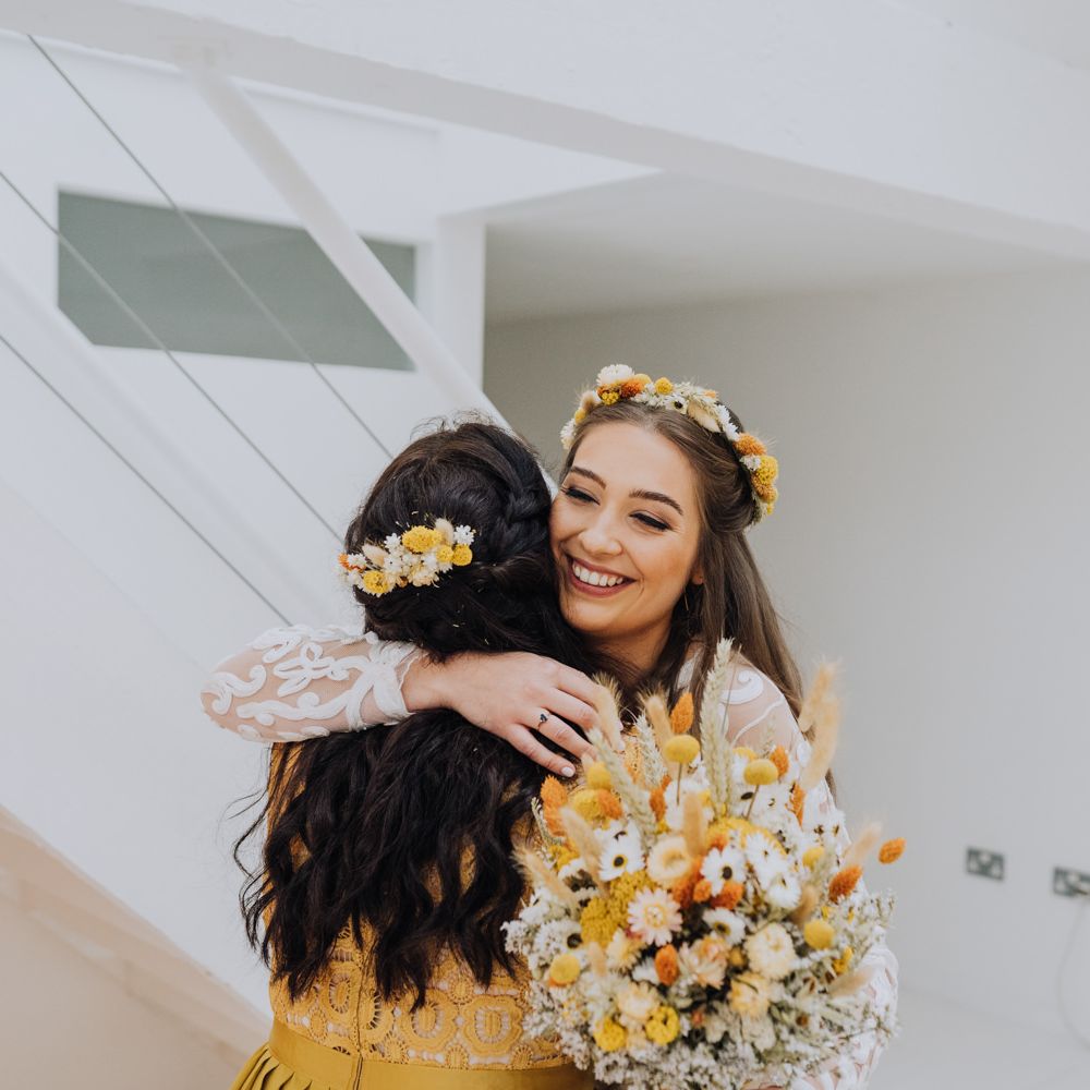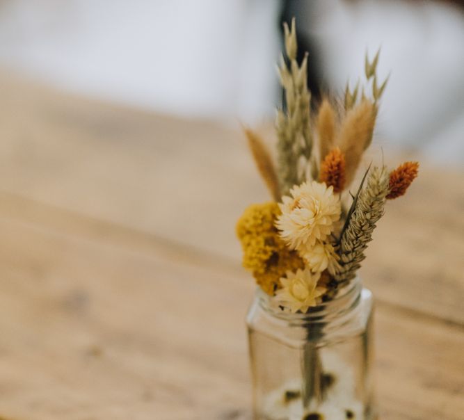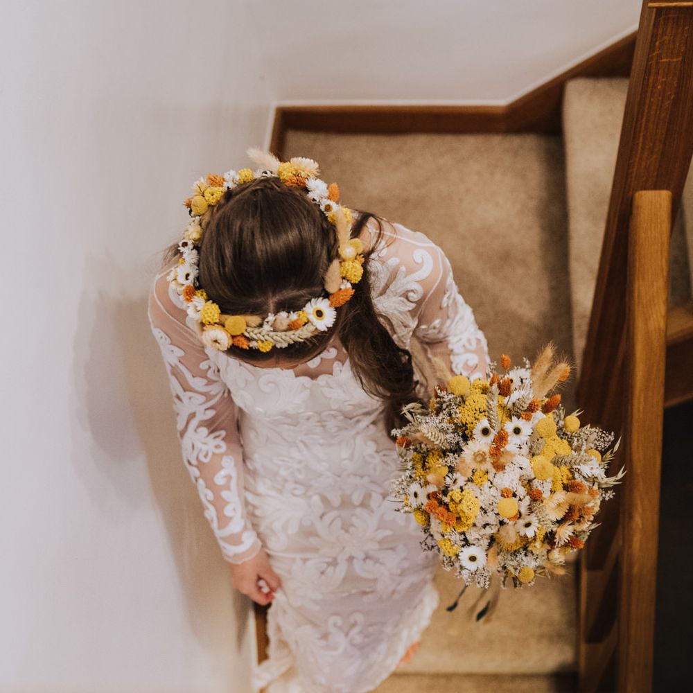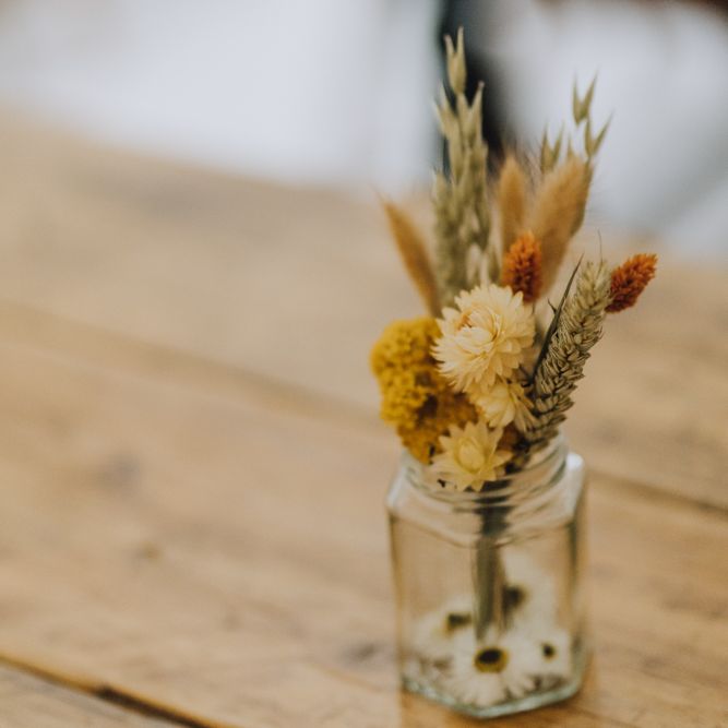 All the preparation and hard work coming together to make our perfect day. What made our wedding unique was how much we took on ourselves. You can plan all the individual little touches, but it’s only on the day when you see it all come together, it gives you the biggest sense of achievement. We probably broke every rule in the floristry book (florists look away now!) but we set out to make 7 bouquets, a bridal crown, 6 hair pieces, 2 flower girl crowns, 7 buttonholes, 2 lapel corsages, 4 cake wreaths and 12 table decoration jars. Using dried flowers enabled us to prepare these in the months prior to the wedding, although it meant a lot of late nights after work!