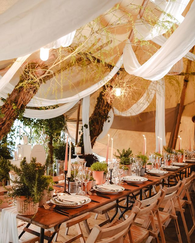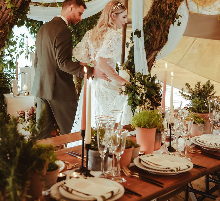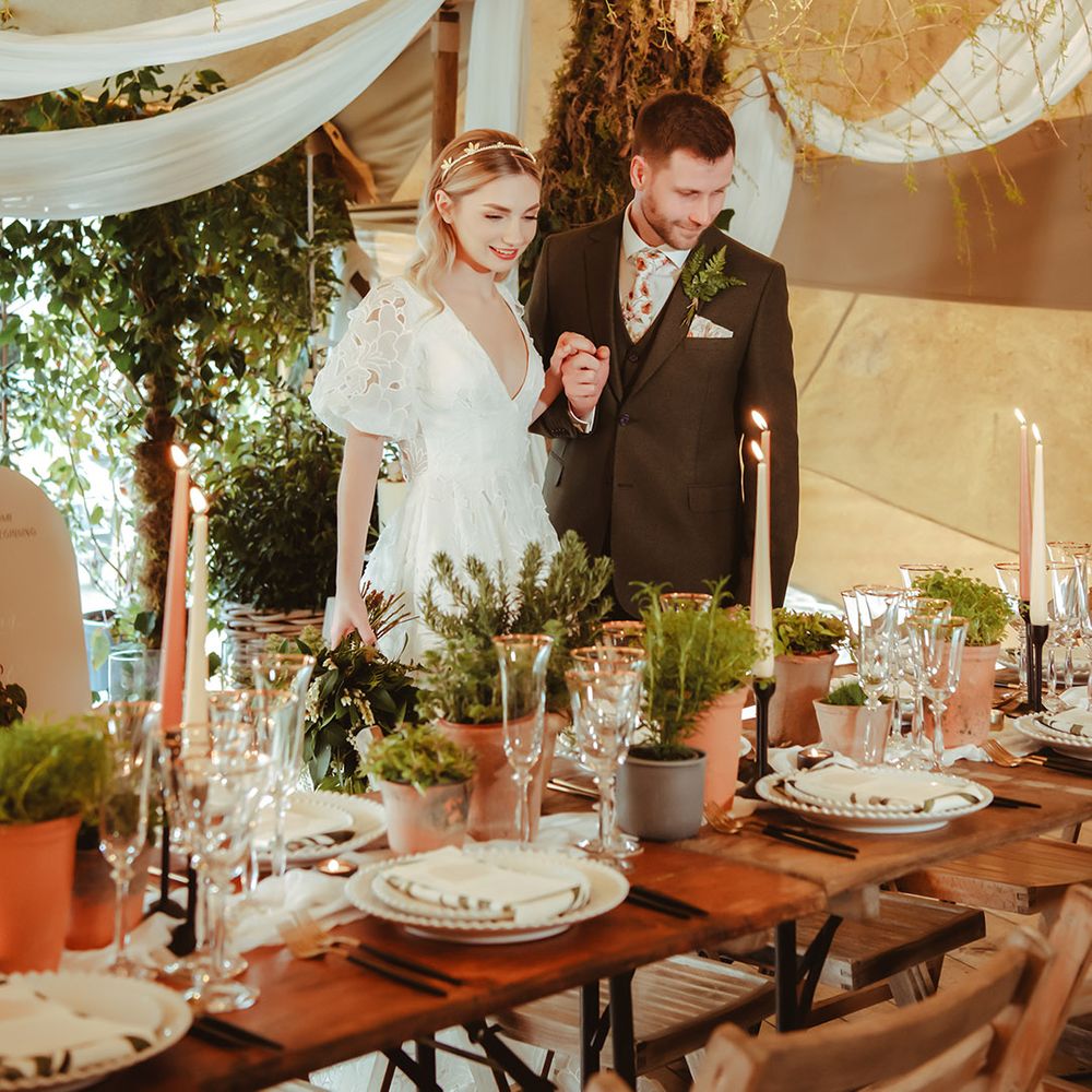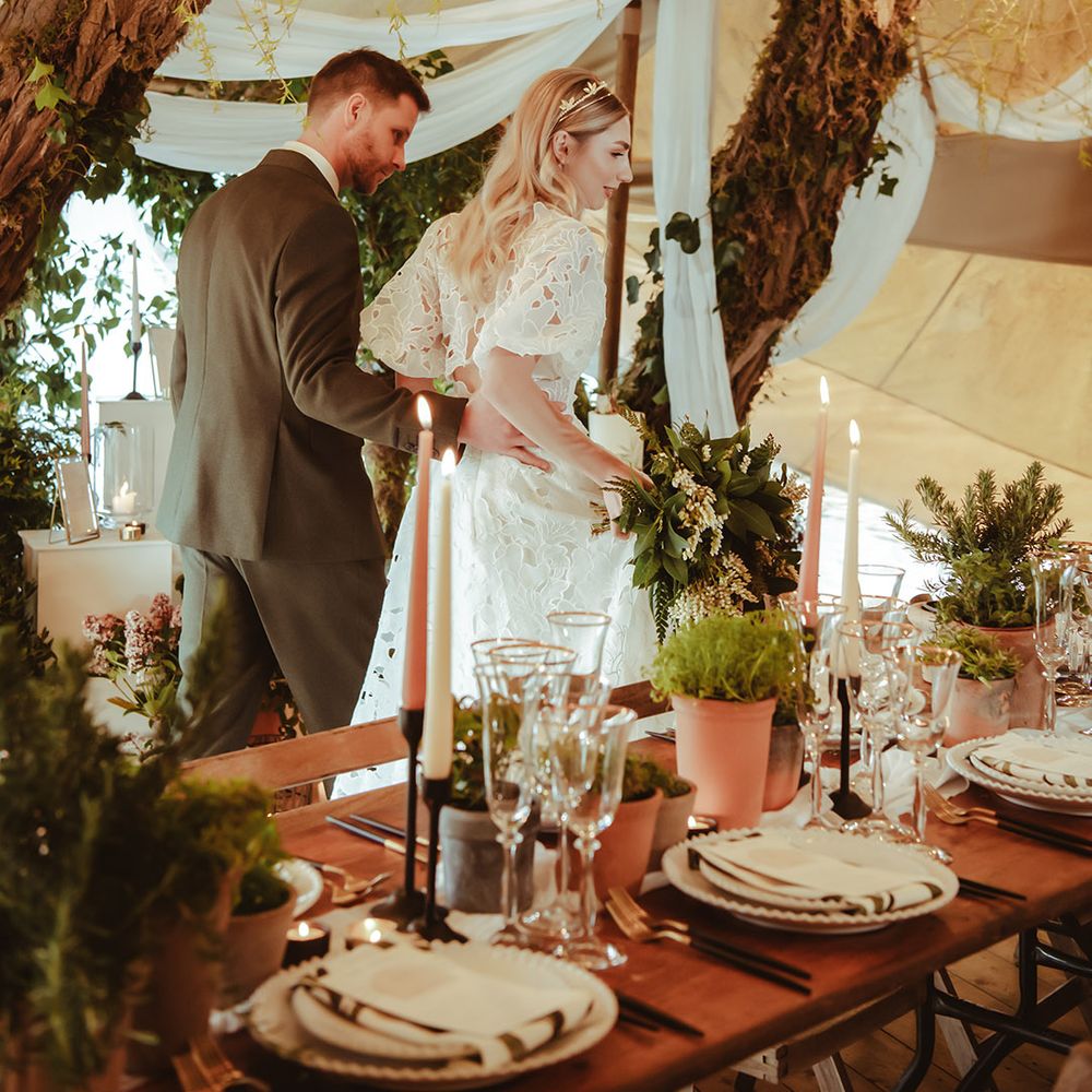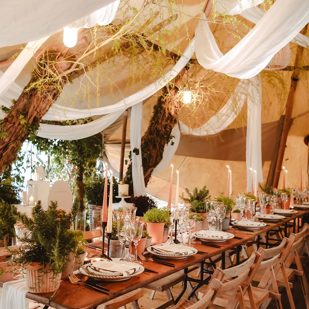 The plants and planters were all returned to their original homes outside the tipi, and in the polytunnels, like we'd never been there. All crockery, cutlery, glassware, candle holders, plinths, draping etc were all hire items, returned to their owners to be washed and used again. Plus, all suppliers involved in this shoot were locally based, to reduce fuel consumption.