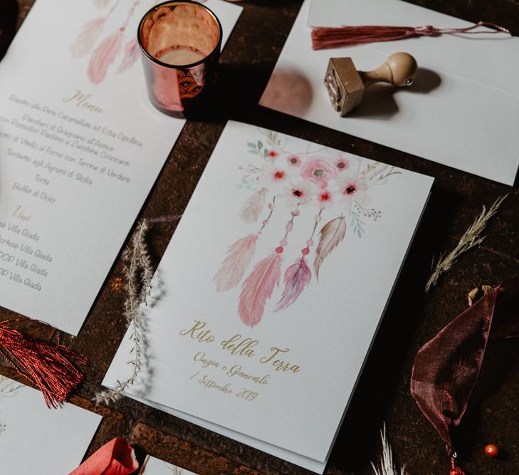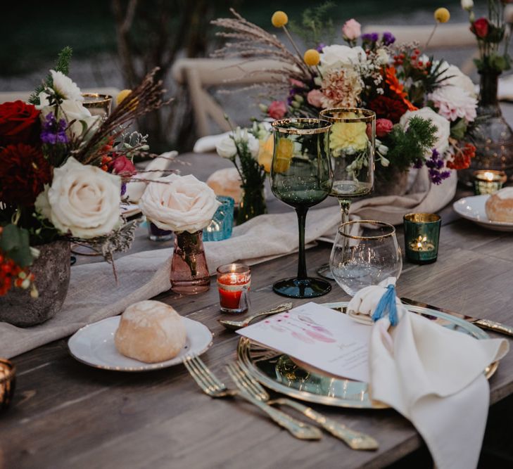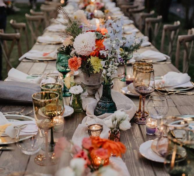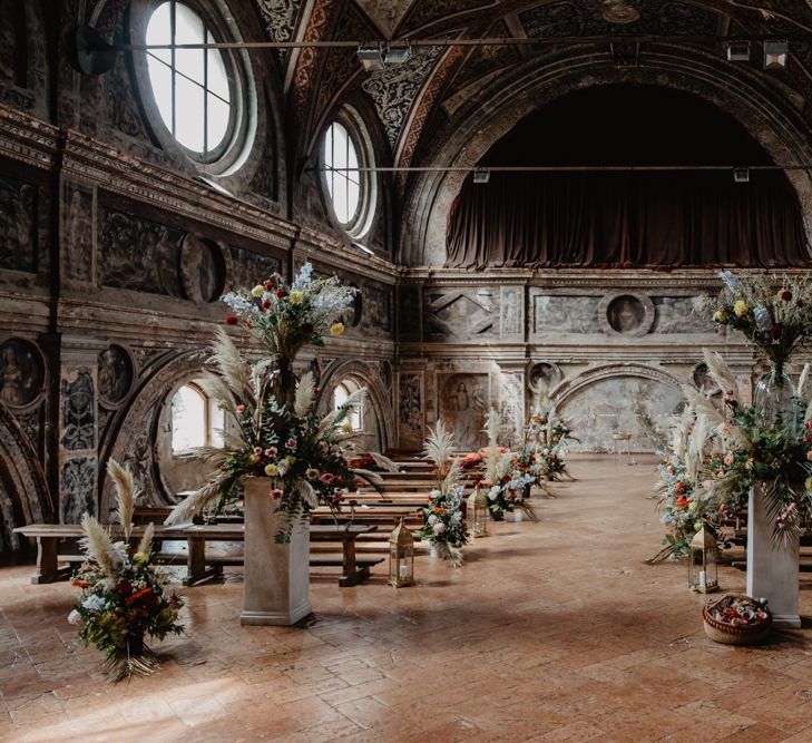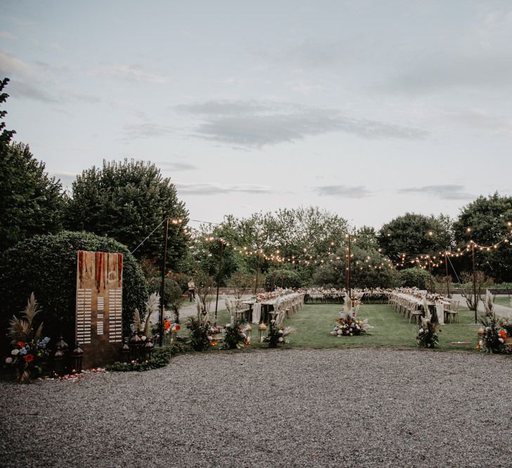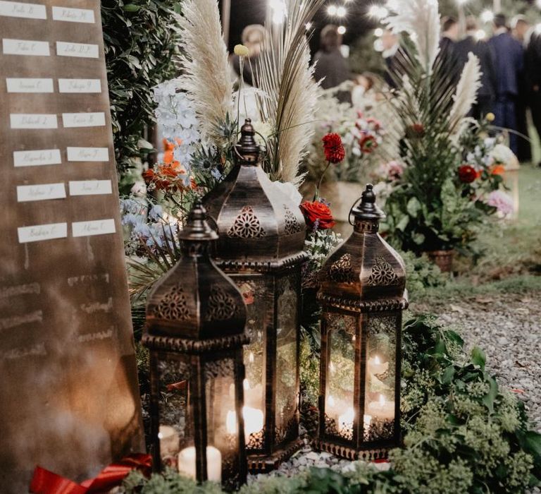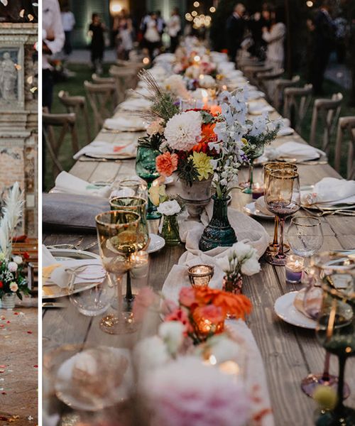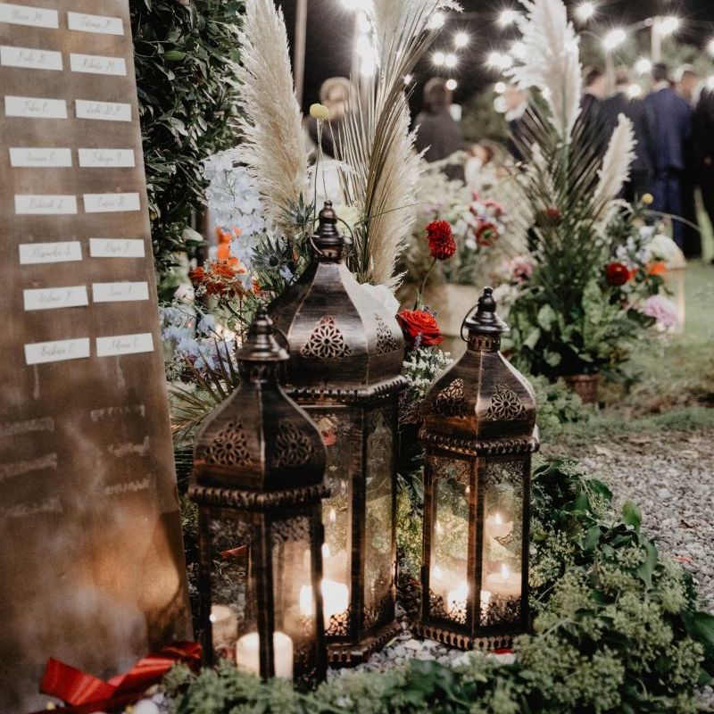This wedding was special because it was inspired by the Byzantine and Norman Empire. The venue was a private house built on a cloistered convent with a very strong Byzantine Style so we decided to keep the style and replicate it in every design element to create harmony and give guests the impression of traveling between time and space (space because Byzantine and Norman Empire buildings are typical of Sicily, south Italy, instead we were close to Milan, in the very north Italy). Everything was super colourful, from blown glass to tassels, from flowers and pampas to handmade wicker baskets, to intertwined woods to the lights atmosphere created by the arabesque lanterns.