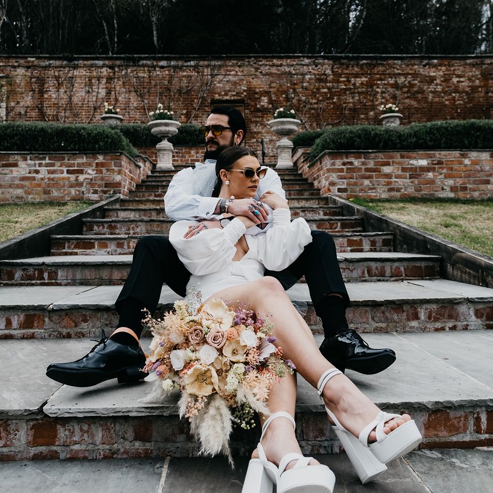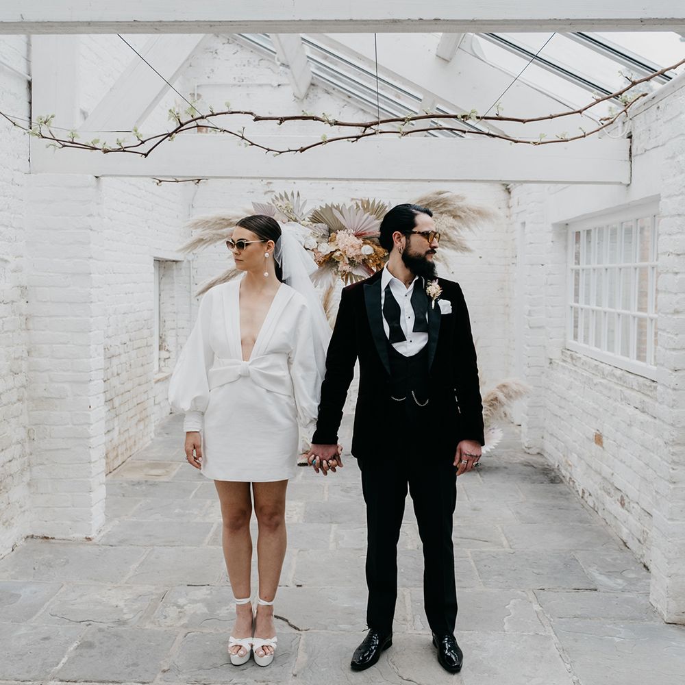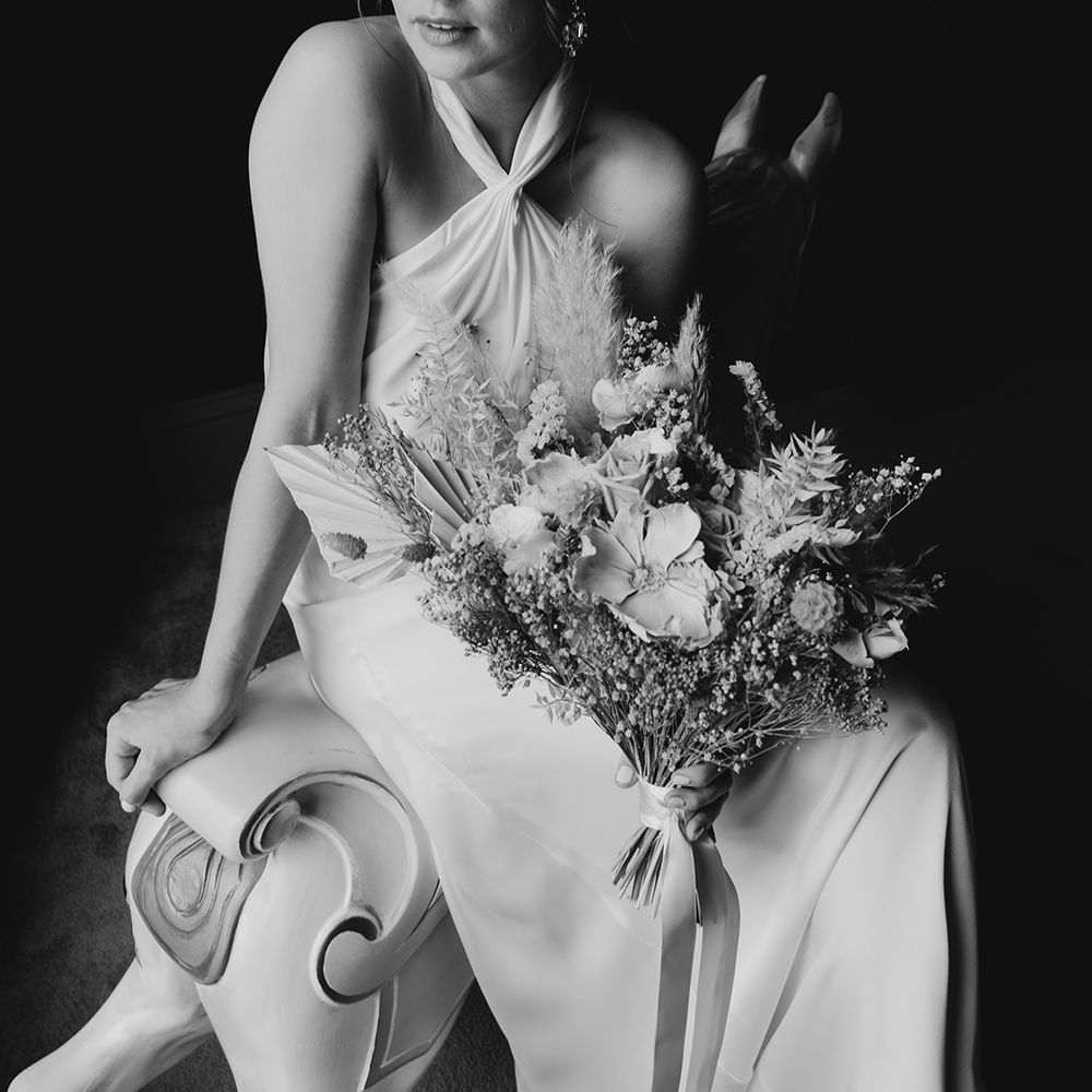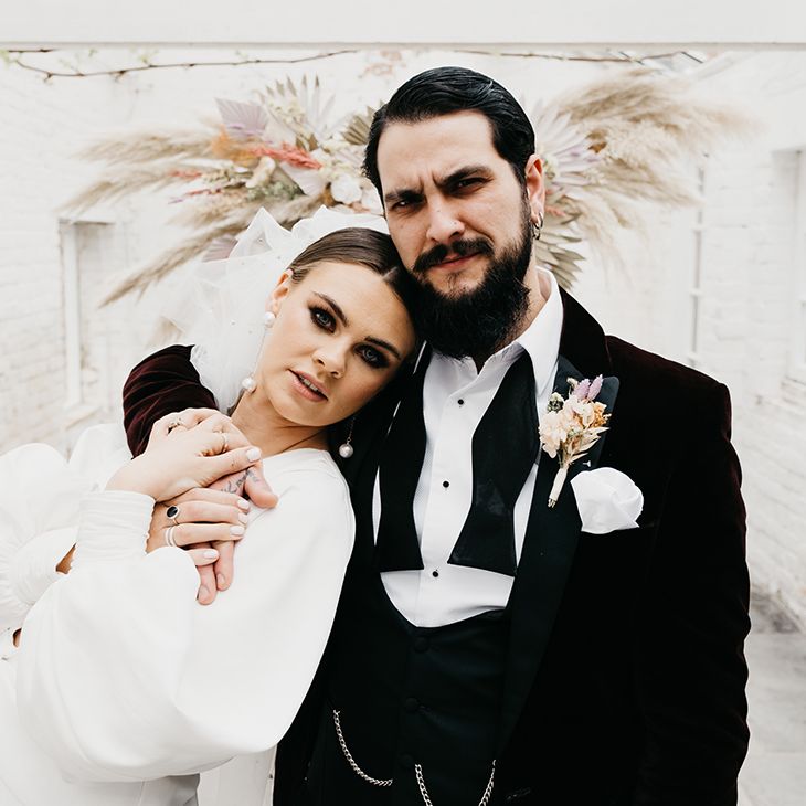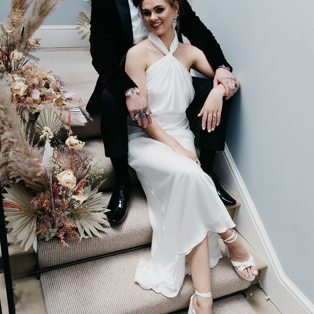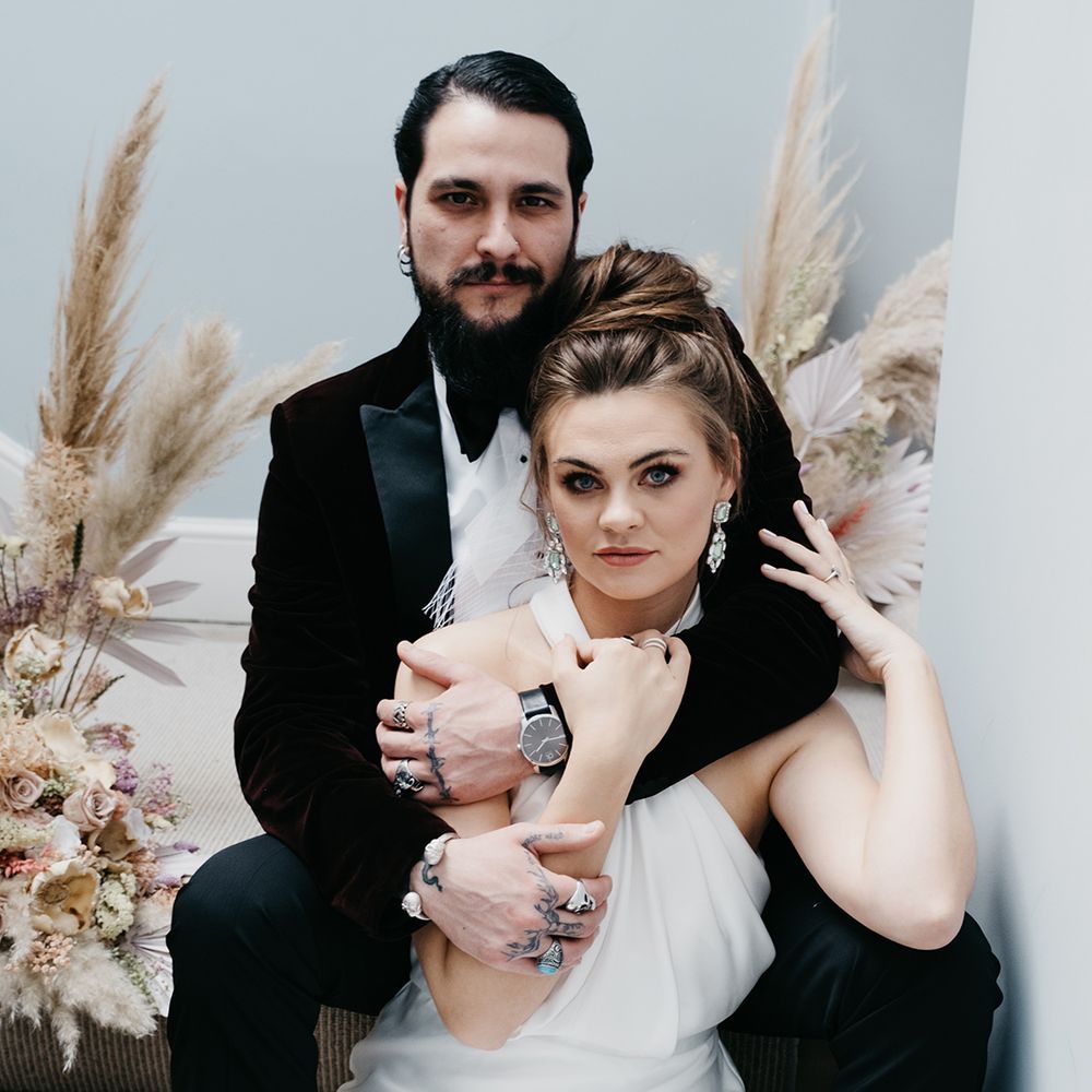 As with the inspiration, for the fashion, we wanted to showcase two sides to our inspiration shoot. The first outfit was a softer feminine look, with a long silky gown and beautiful back detail. Then we choose a fun short wedding dress, with killer heels and a bow veil. Makeup focused on a sultry dark eye and natural pretty lip. Our guy was dressed in a darker look with a velvet blazer, untied bow tie, waistcoat, watch chain and lots of statement jewellery.