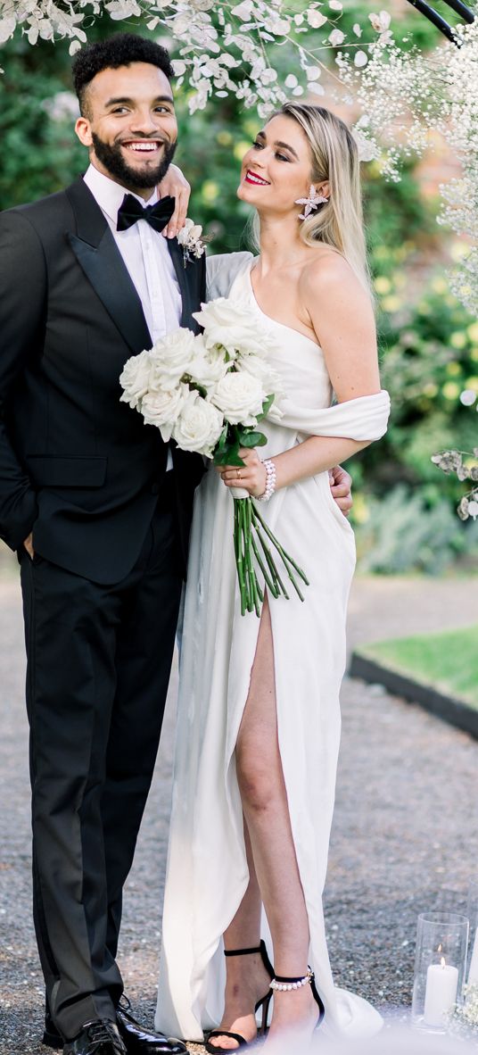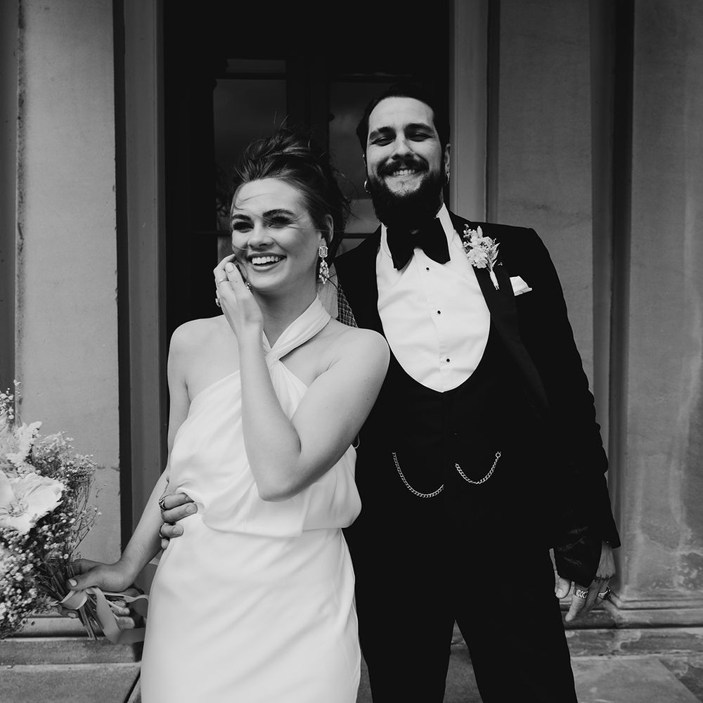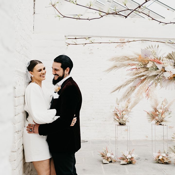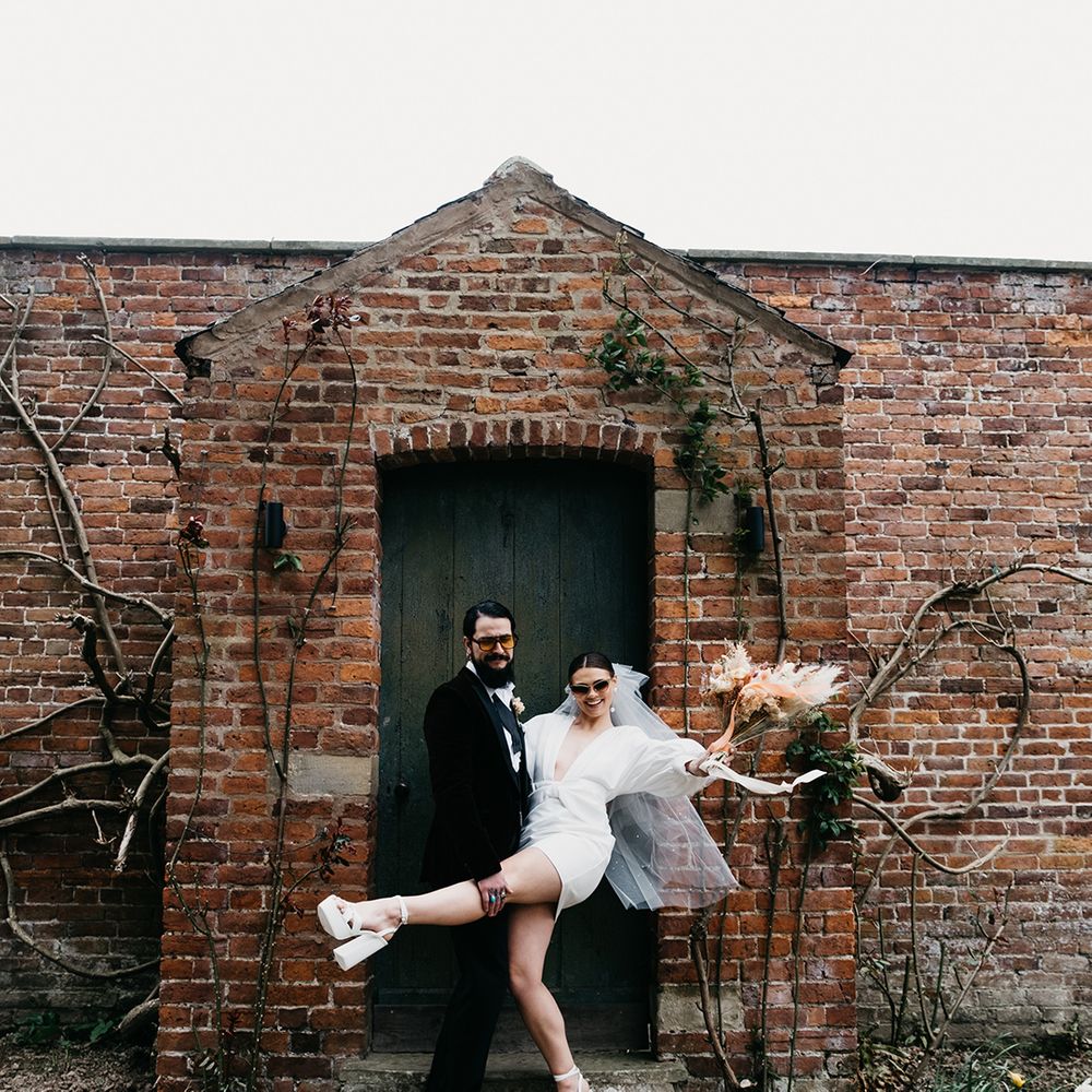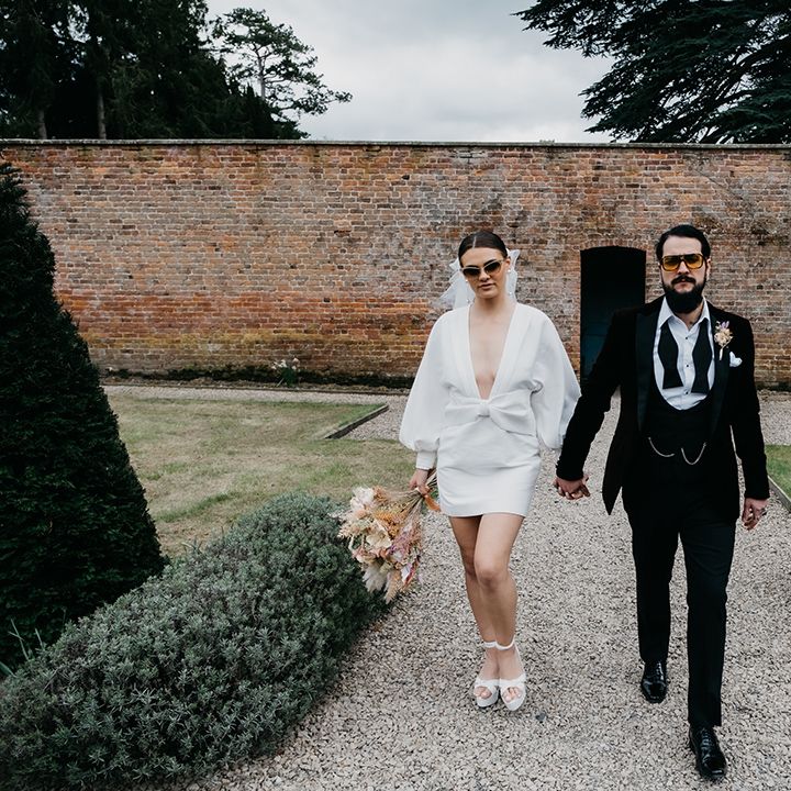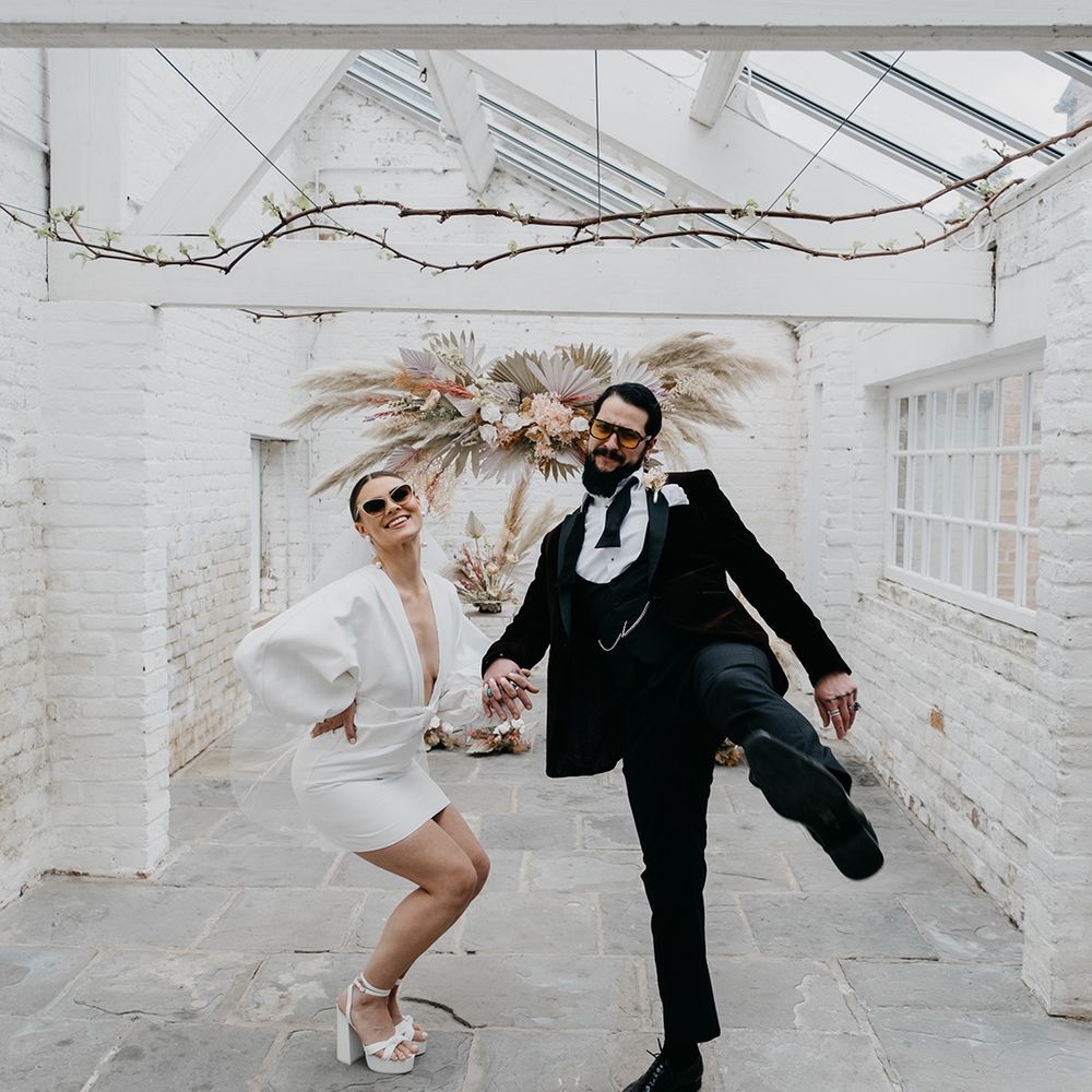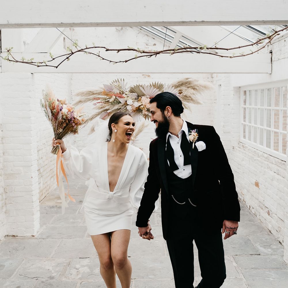 As with the inspiration, for the fashion, we wanted to showcase two sides to our inspiration shoot. The first outfit was a softer feminine look, with a long silky gown and beautiful back detail. Then we choose a fun short wedding dress, with killer heels and a bow veil. Makeup focused on a sultry dark eye and natural pretty lip. Our guy was dressed in a darker look with a velvet blazer, untied bow tie, waistcoat, watch chain and lots of statement jewellery.