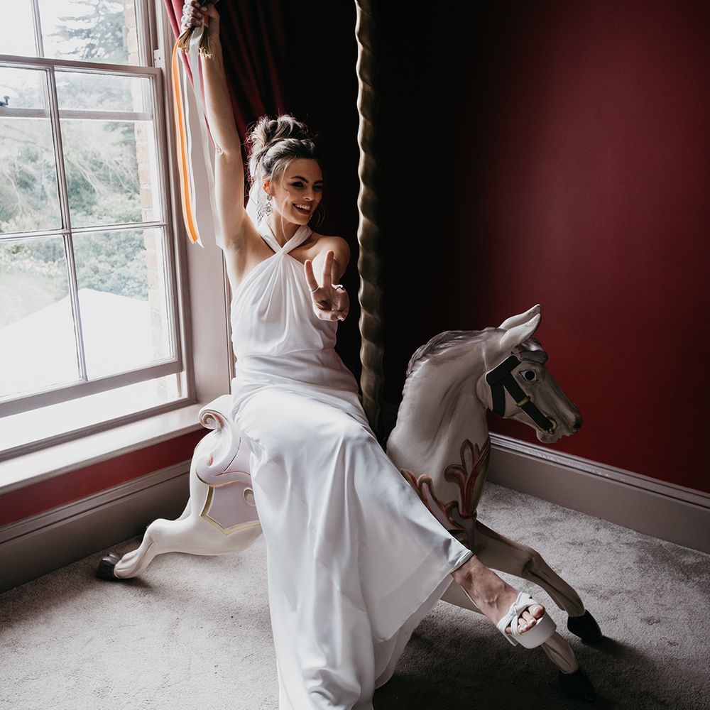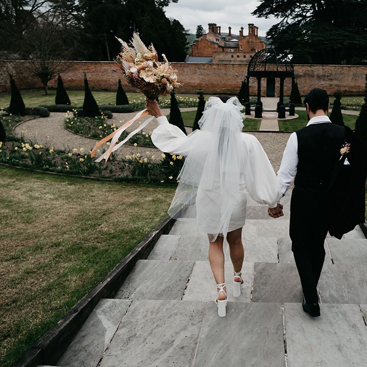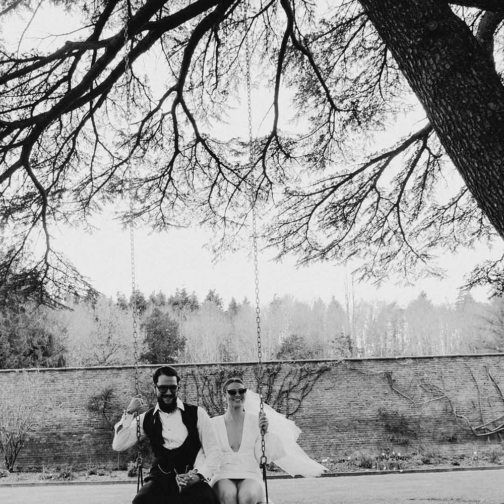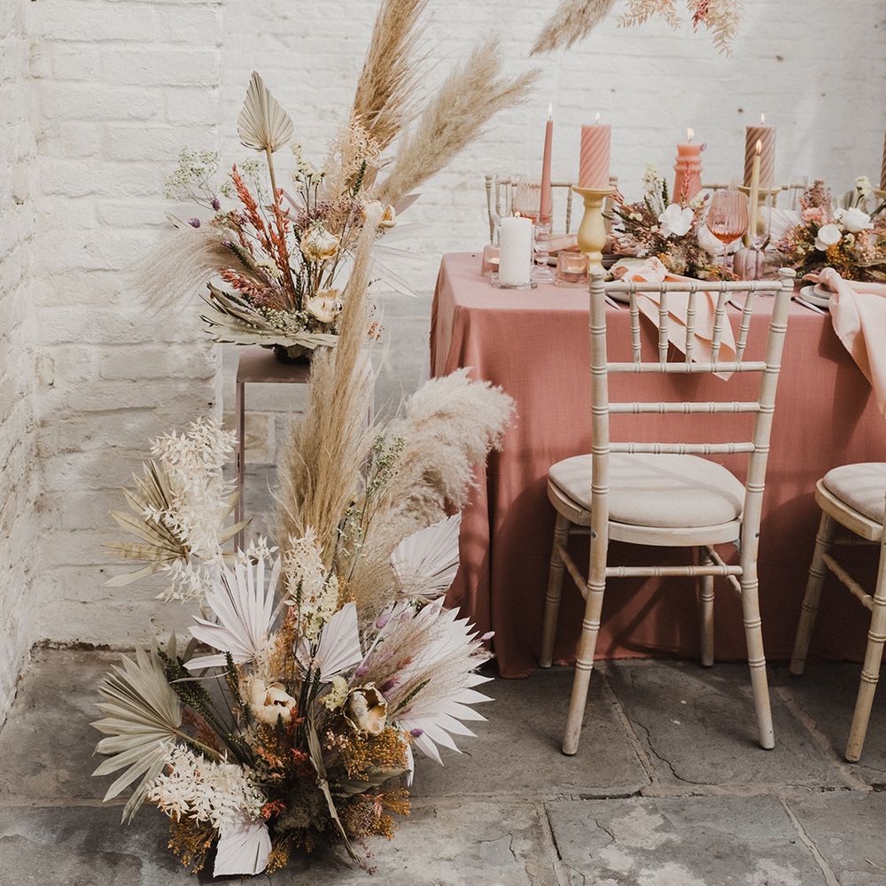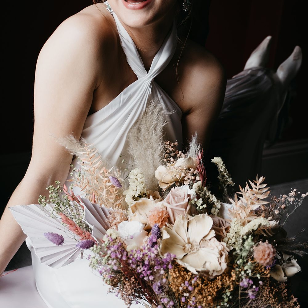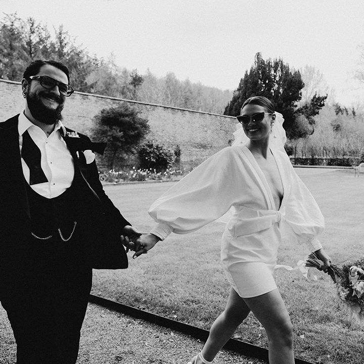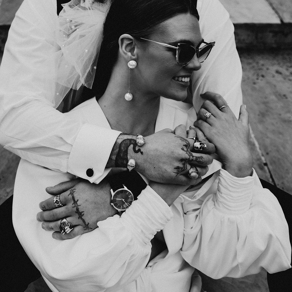 As with the inspiration, for the fashion, we wanted to showcase two sides to our inspiration shoot. The first outfit was a softer feminine look, with a long silky gown and beautiful back detail. Then we choose a fun short wedding dress, with killer heels and a bow veil. Makeup focused on a sultry dark eye and natural pretty lip. Our guy was dressed in a darker look with a velvet blazer, untied bow tie, waistcoat, watch chain and lots of statement jewellery.