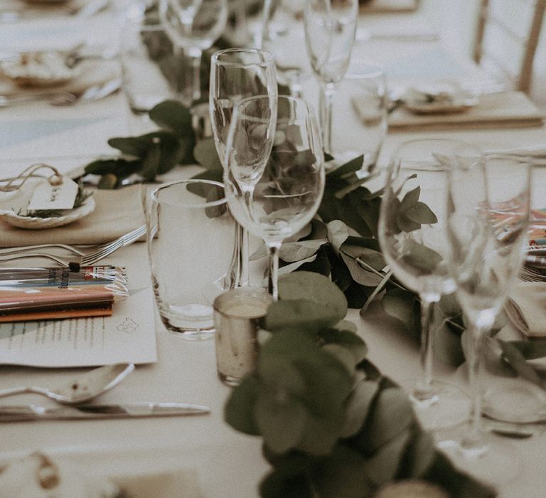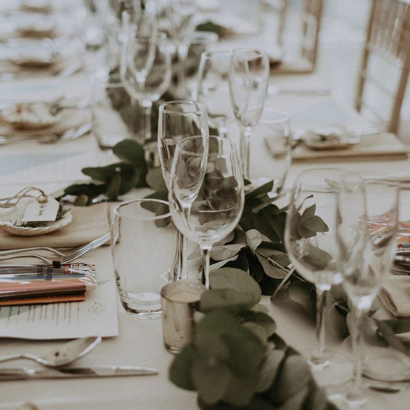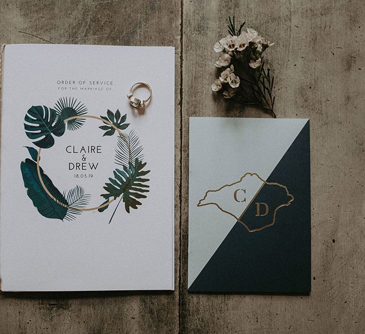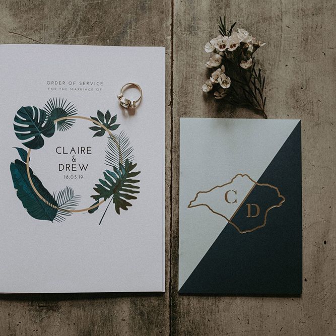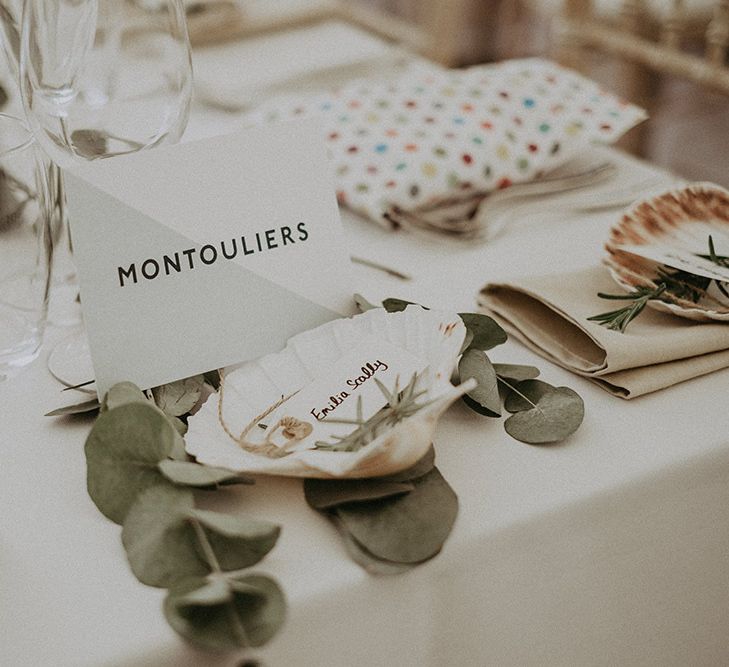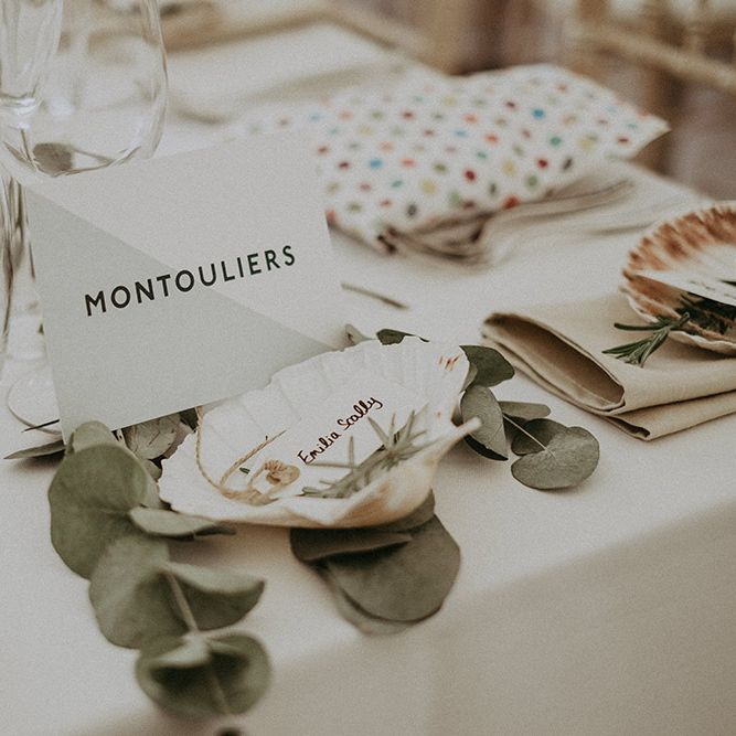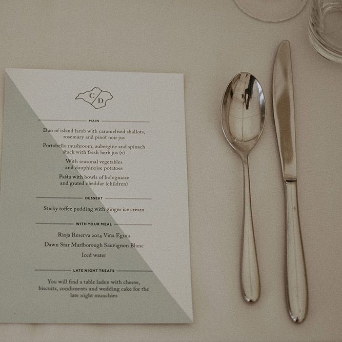 So much of our styling was influenced by my brother in law, who co-owns and runs Bison Bison graphic design. We shared our vision with him – ocean colours, island motifs and clean, modern design. Using our ideas he created the most beautiful wedding invitations for us along with the seating plan, food and bar menus. For the tables we used Bison Bison’s menu and matched it with a scallop shell, a sprig of rosemary and simple kraft paper luggage tags, handwritten for place names.