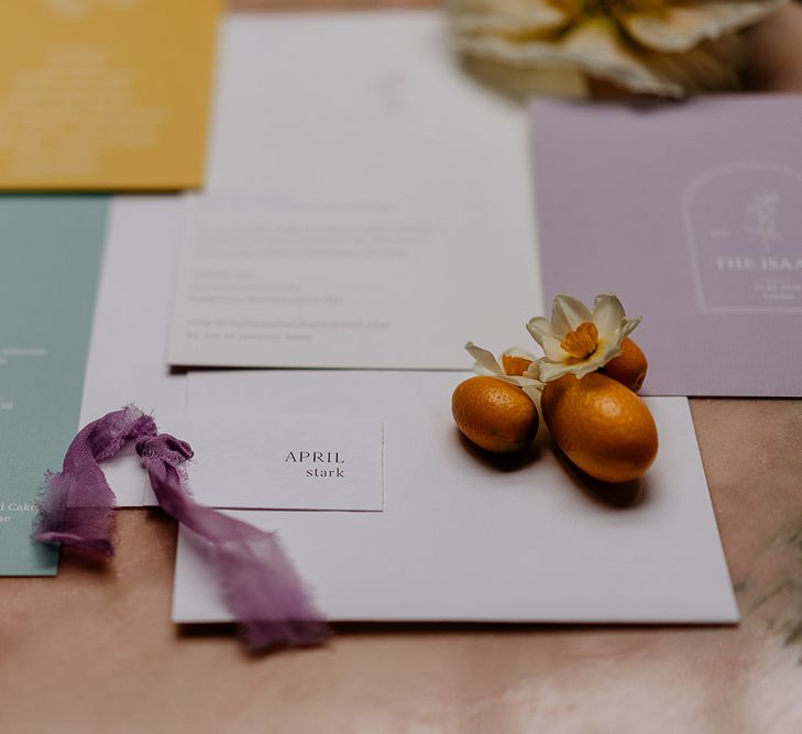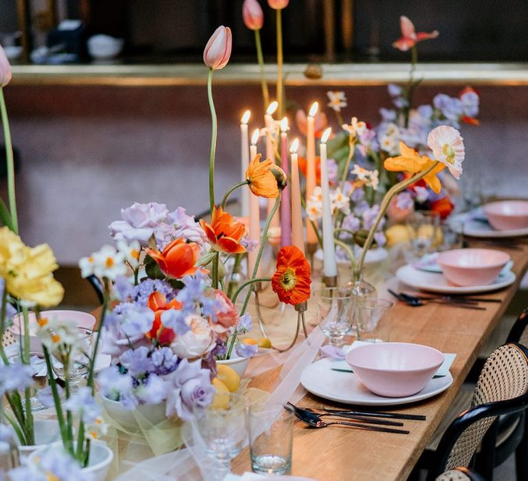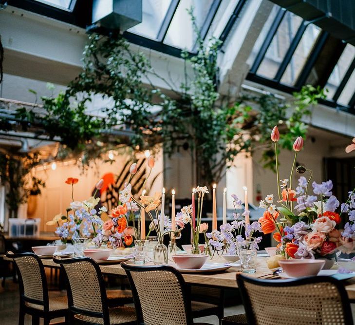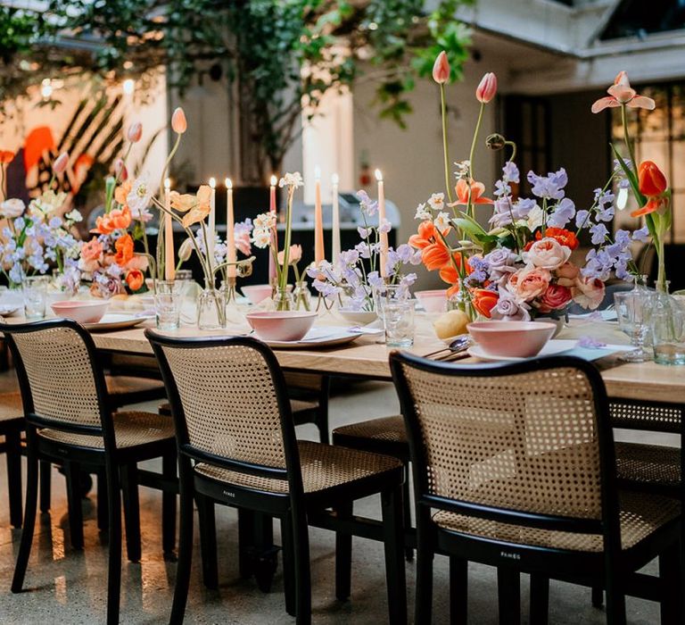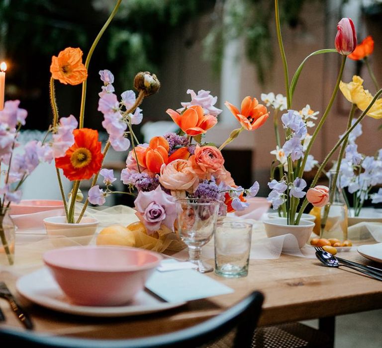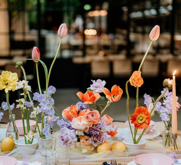 Spring is the season full of hope & excitement for what the year will bring, and the shoot reflects that in the pastel colour palette used across florals, stationery, makeup, cake & bridal accessories. The aim was to create a tablescape that focused on colour and texture, playing with heights in a more modern and Japanese inspired floral design style to create shapes and floral dense moments. We wanted to draw the eye to varying heights to give the table movement, in a playful way as opposed to traditional centrepieces. We also used tulle table runners for a soft but fresh feel.