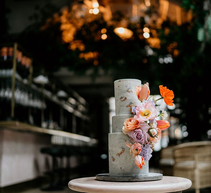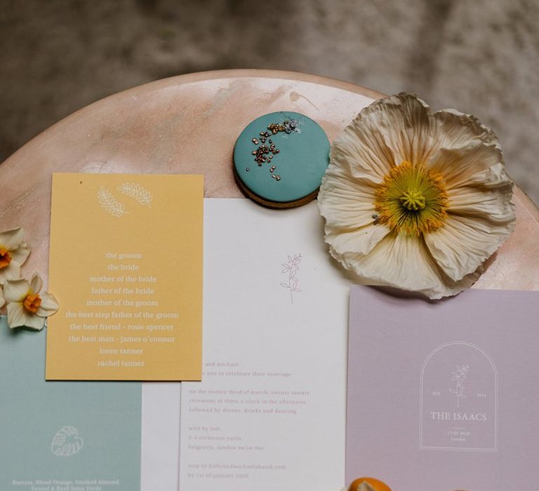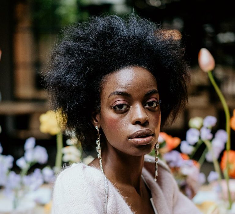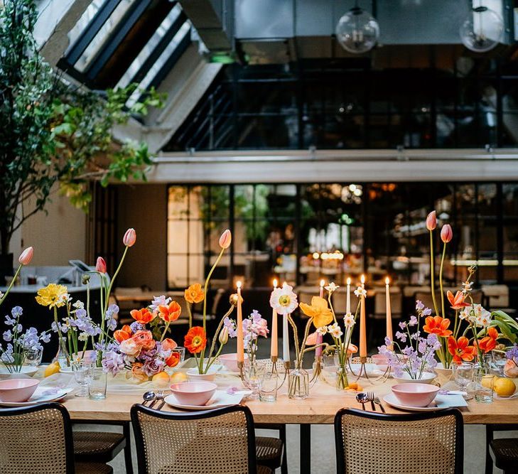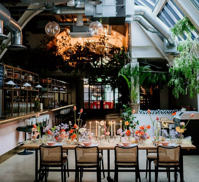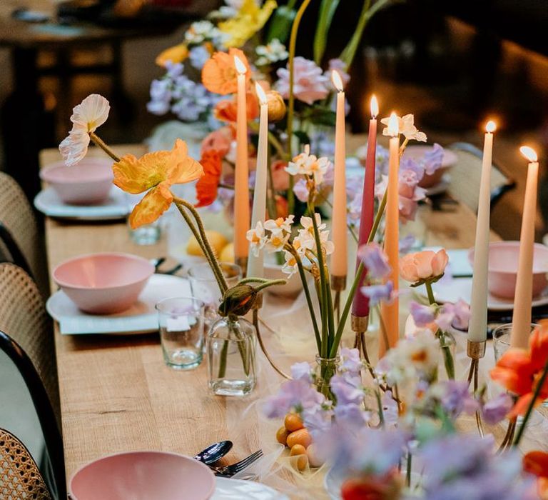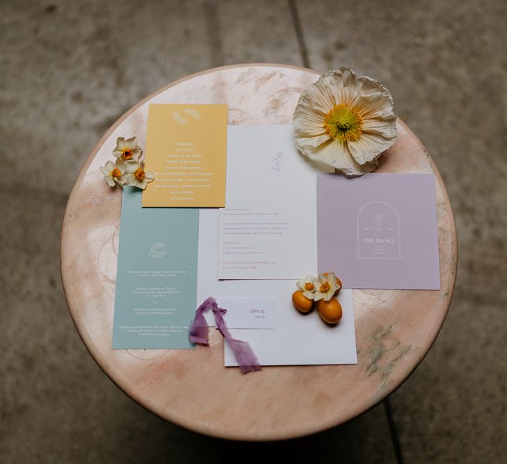 Spring is the season full of hope & excitement for what the year will bring, and the shoot reflects that in the pastel colour palette used across florals, stationery, makeup, cake & bridal accessories. The aim was to create a tablescape that focused on colour and texture, playing with heights in a more modern and Japanese inspired floral design style to create shapes and floral dense moments. We wanted to draw the eye to varying heights to give the table movement, in a playful way as opposed to traditional centrepieces. We also used tulle table runners for a soft but fresh feel.