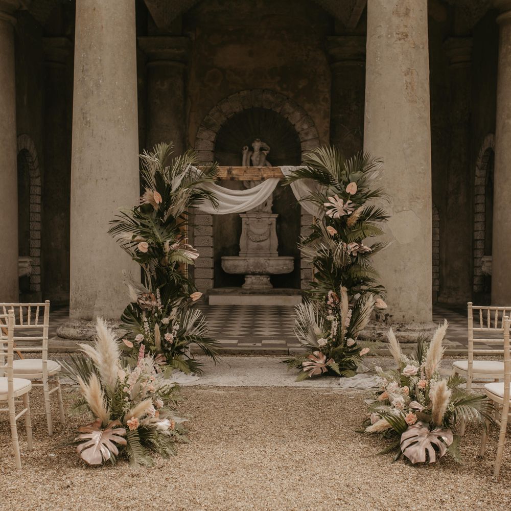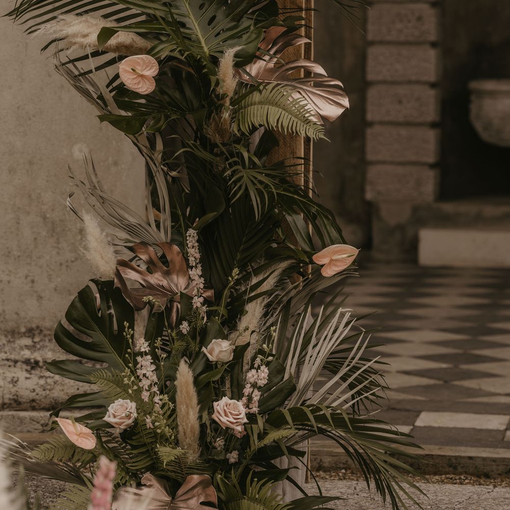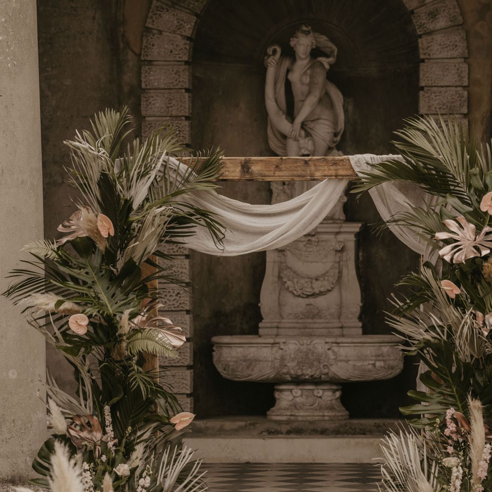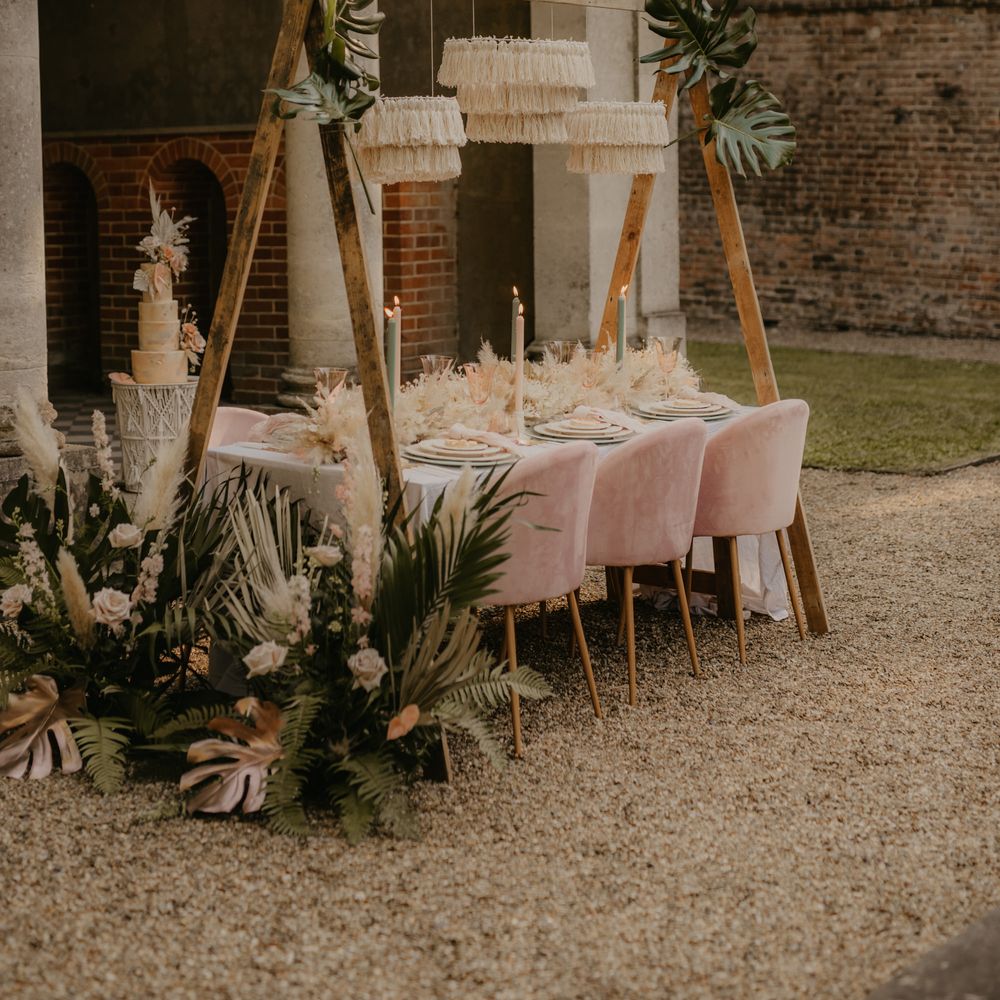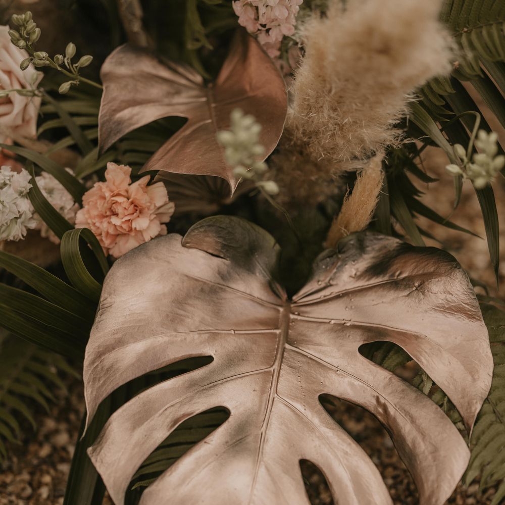 Love from Another World was inspired by a destination wedding myself and Russell unfortunately couldn't attend due to the coronavirus pandemic. I really wanted to create a shoot that represented what a wedding is all about - love. The ceremony section was super important to me. We chose to go with a beautiful arch covered in monstera leaves, fresh and dried palms finished with a gorgeous drape. The tropical vibes carried on throughout this shoot, showing couples how to create their own destination wedding in the UK.