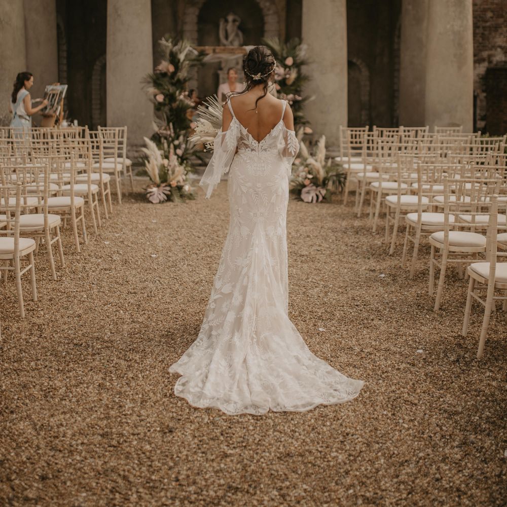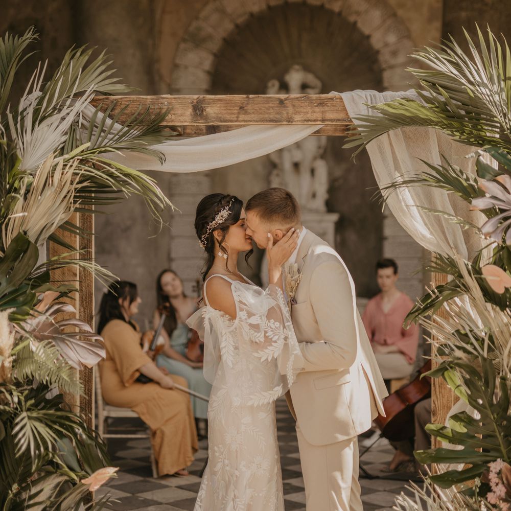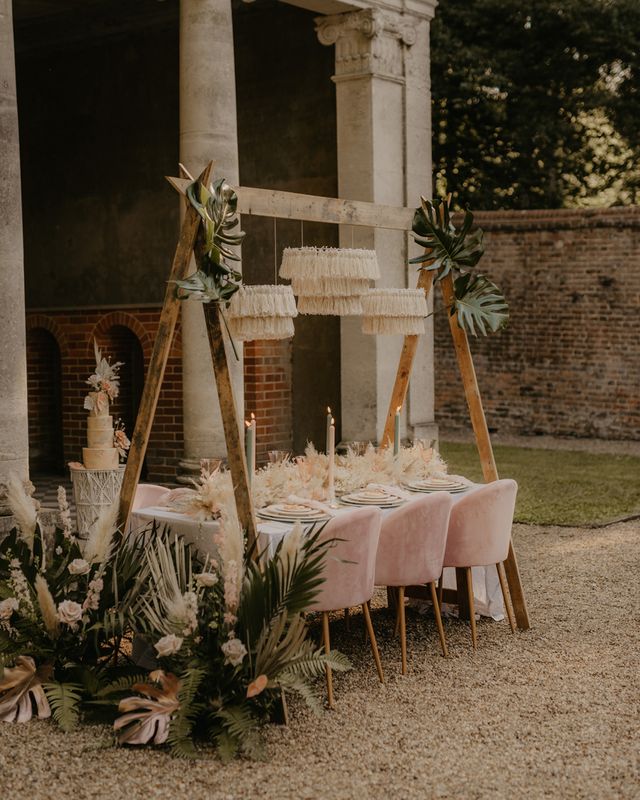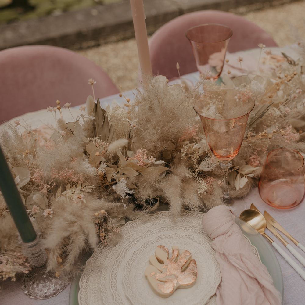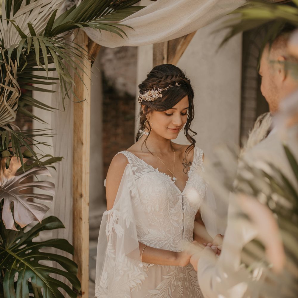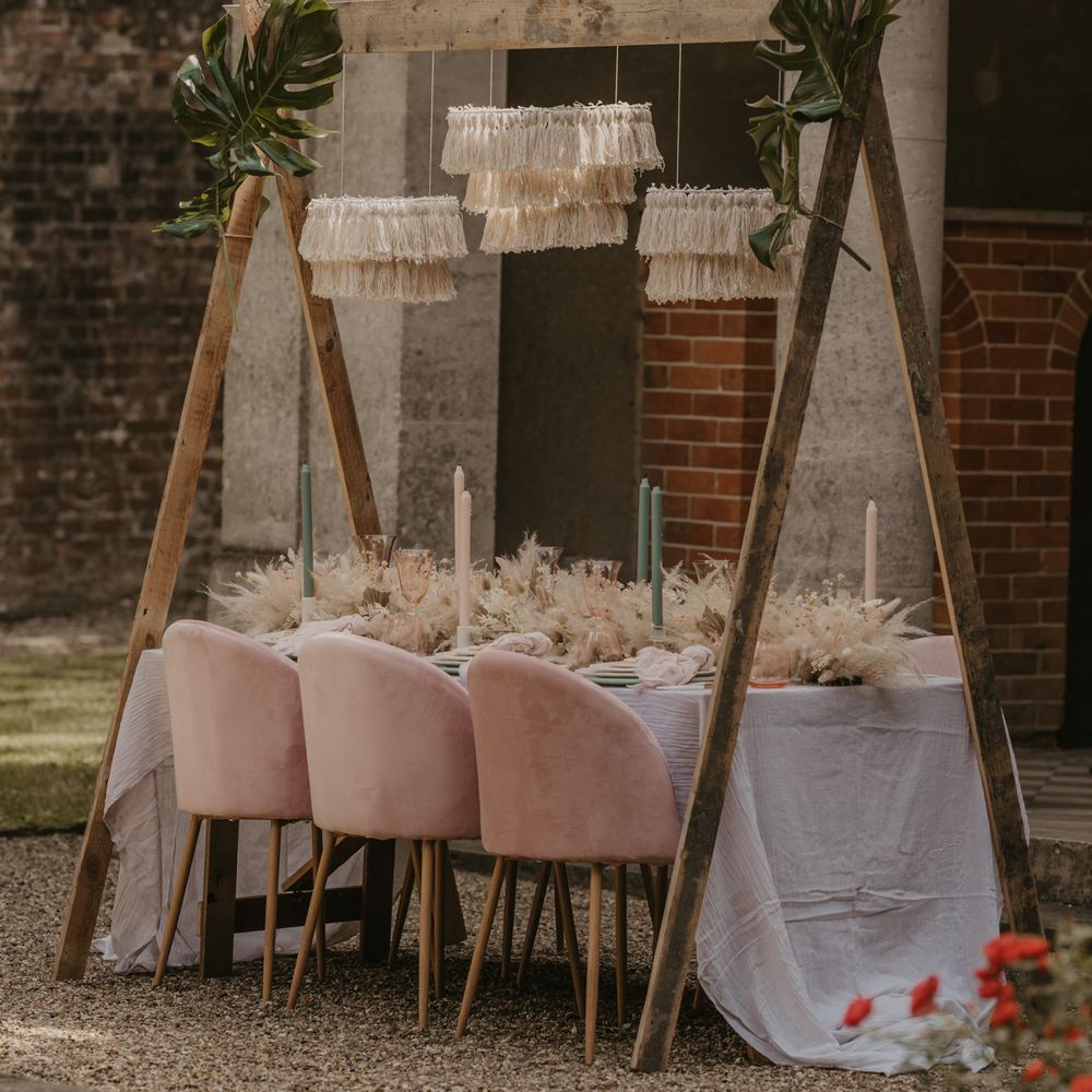 Love from Another World was inspired by a destination wedding myself and Russell unfortunately couldn't attend due to the coronavirus pandemic. I really wanted to create a shoot that represented what a wedding is all about - love. The ceremony section was super important to me. We chose to go with a beautiful arch covered in monstera leaves, fresh and dried palms finished with a gorgeous drape. The tropical vibes carried on throughout this shoot, showing couples how to create their own destination wedding in the UK.
