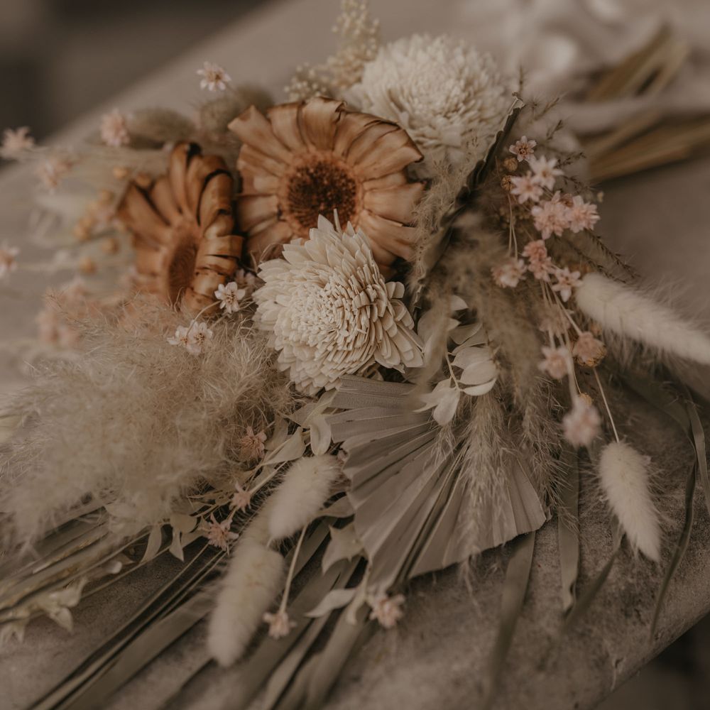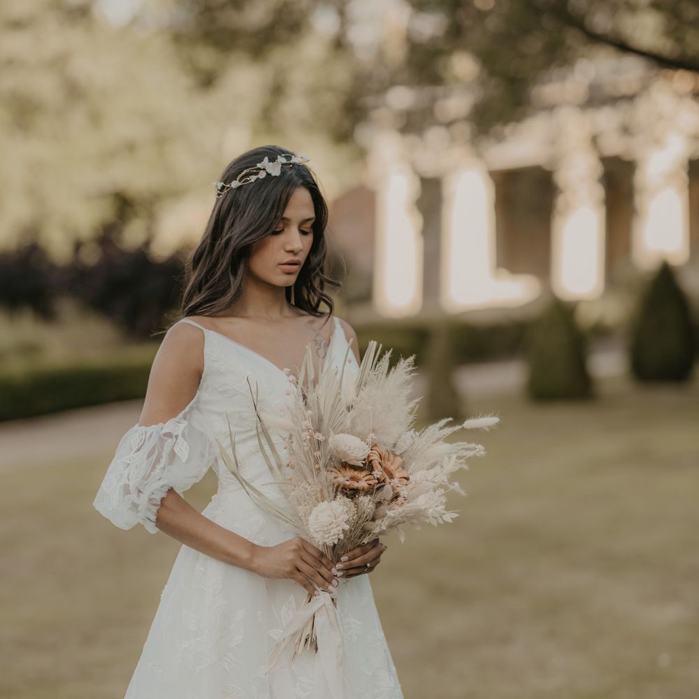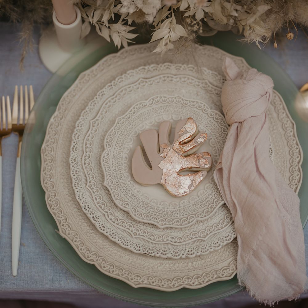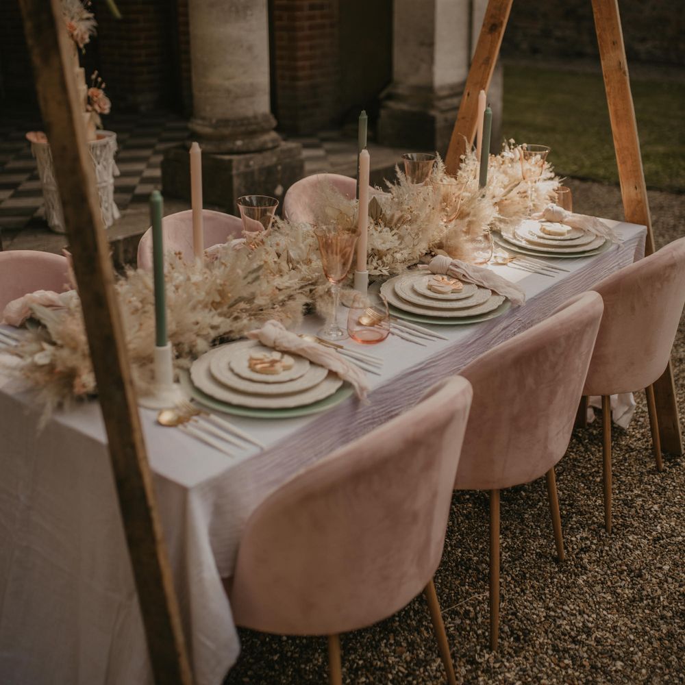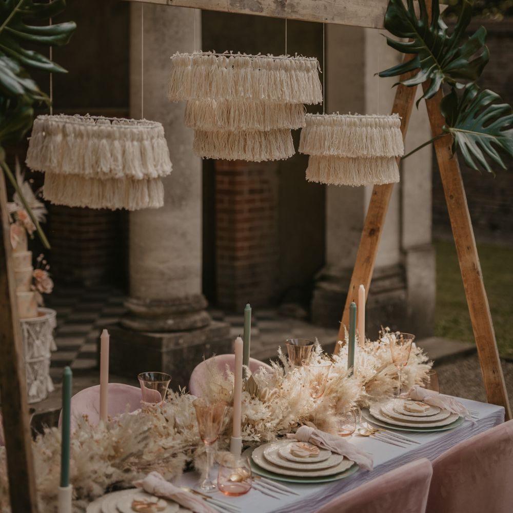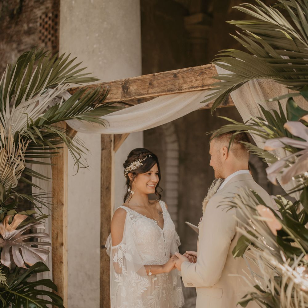Love from Another World was inspired by a destination wedding myself and Russell unfortunately couldn't attend due to the coronavirus pandemic. I really wanted to create a shoot that represented what a wedding is all about - love. The ceremony section was super important to me. We chose to go with a beautiful arch covered in monstera leaves, fresh and dried palms finished with a gorgeous drape. The tropical vibes carried on throughout this shoot, showing couples how to create their own destination wedding in the UK.