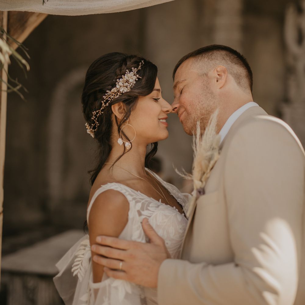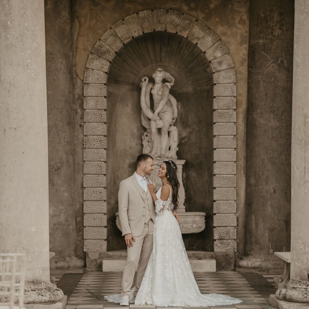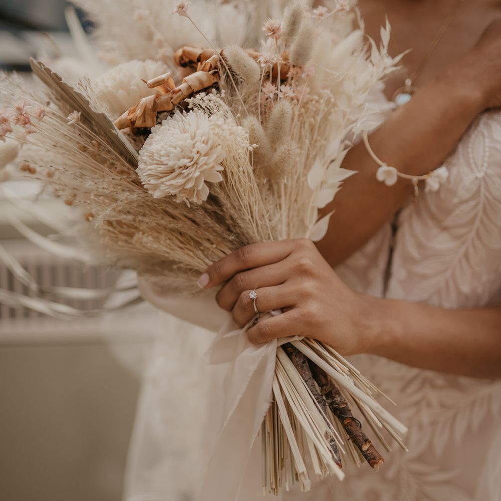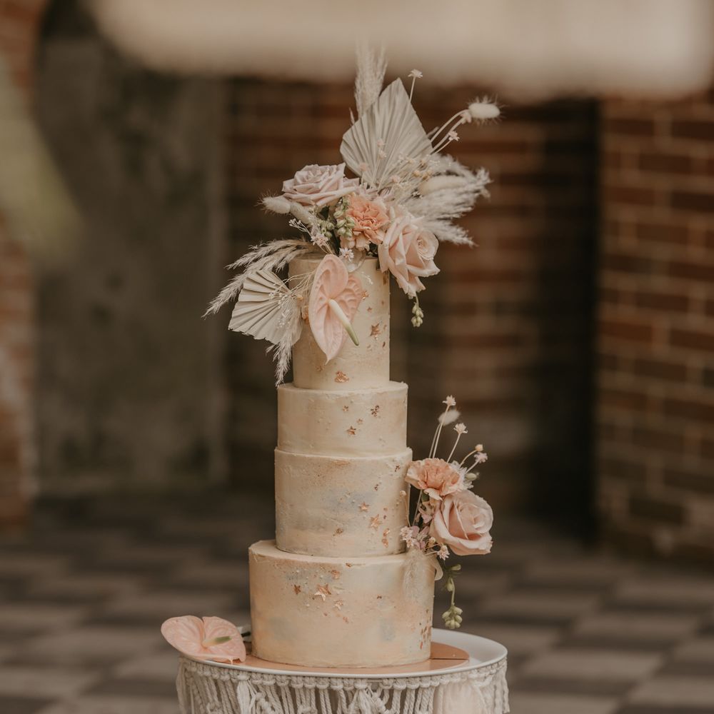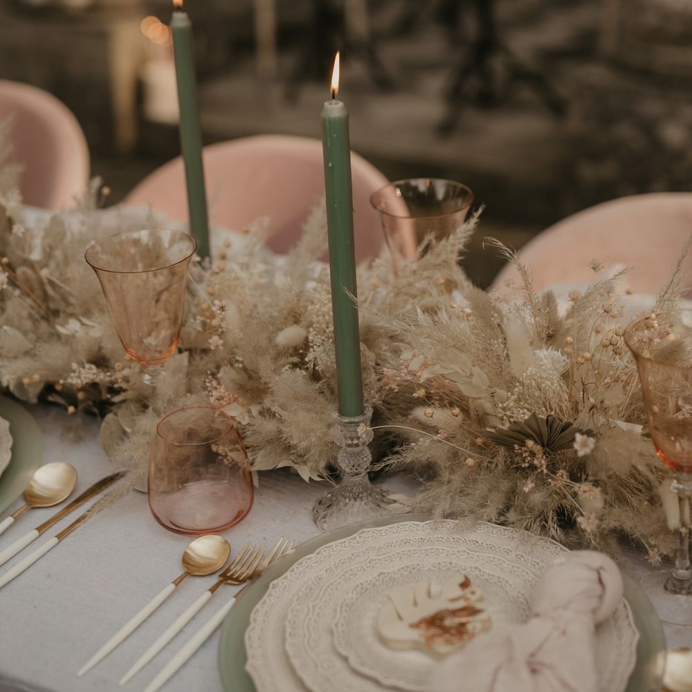 Love from Another World was inspired by a destination wedding myself and Russell unfortunately couldn't attend due to the coronavirus pandemic. I really wanted to create a shoot that represented what a wedding is all about - love. The ceremony section was super important to me. We chose to go with a beautiful arch covered in monstera leaves, fresh and dried palms finished with a gorgeous drape. The tropical vibes carried on throughout this shoot, showing couples how to create their own destination wedding in the UK.