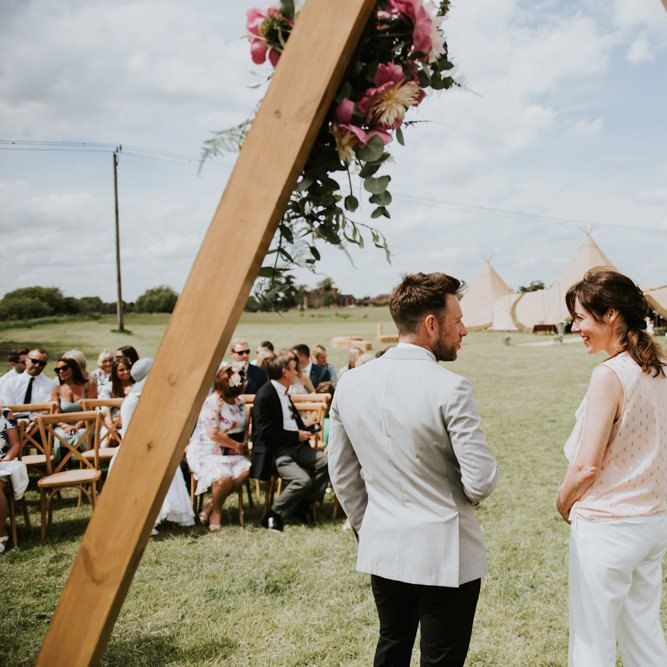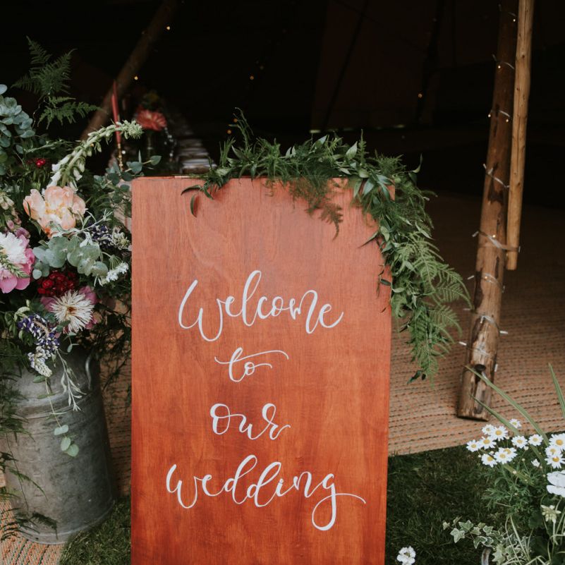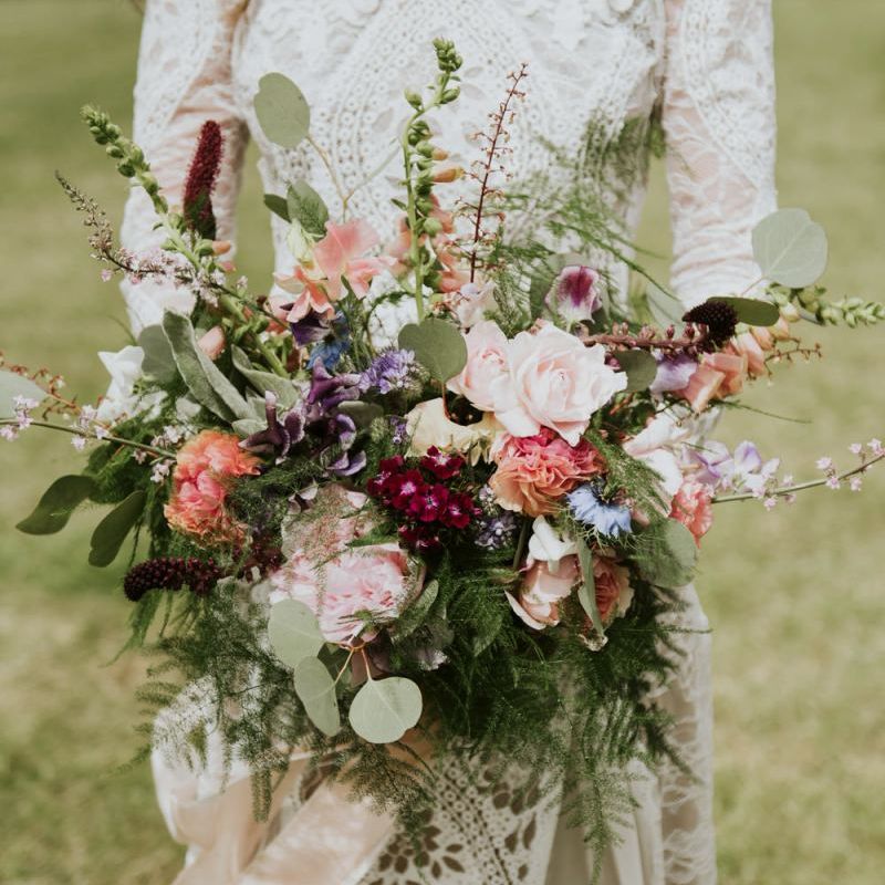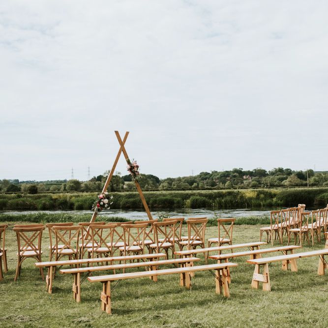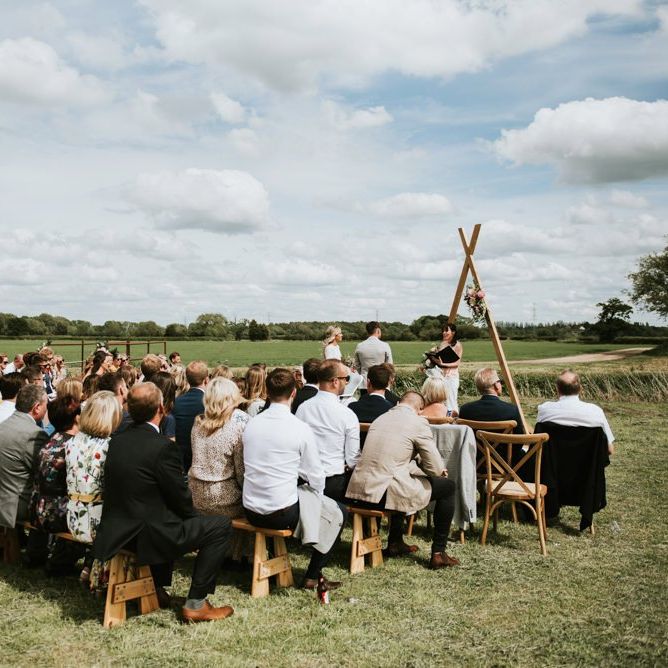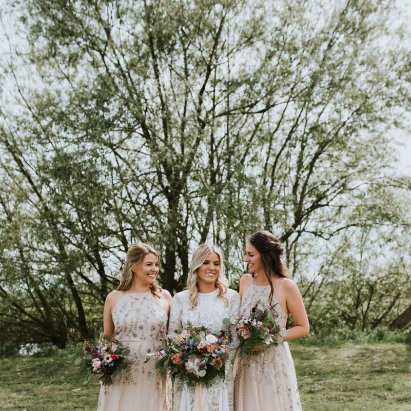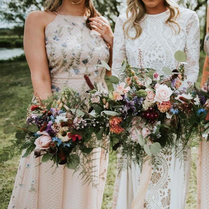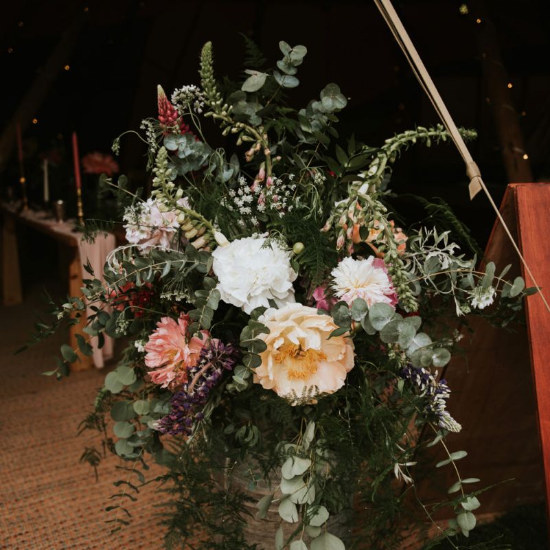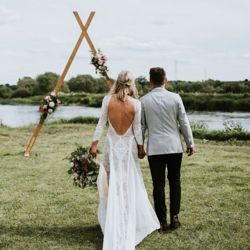 I would say the general vibe for the day was a relaxed and fun day. We wanted to have all our friends and family together eating and drinking great food and drinks and hopefully having a lovely time! The inspiration for the styling was the English countryside, mixed with a bit of boho. The flowers were seasonal British flowers grown in our florist’s cutting garden and the venue was a field by the River Trent, so we wanted the styling to be wild and natural so that it was keeping with our surroundings.