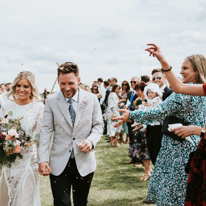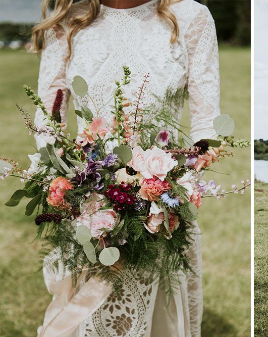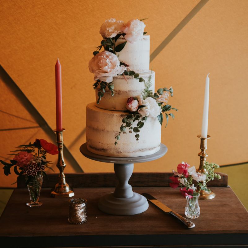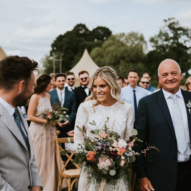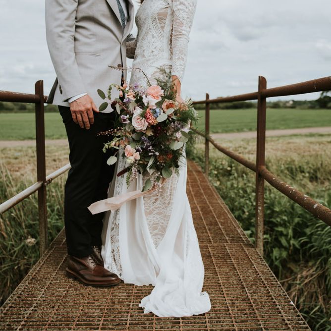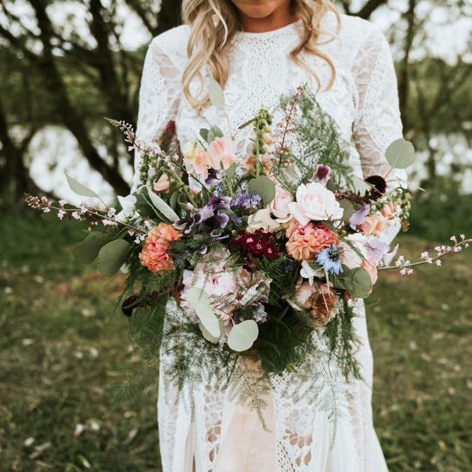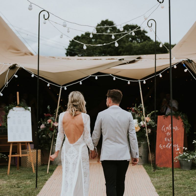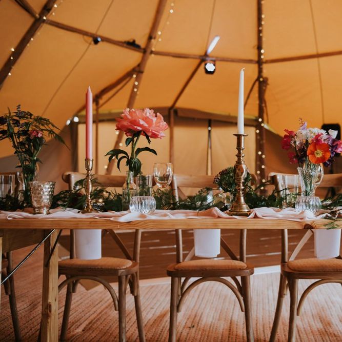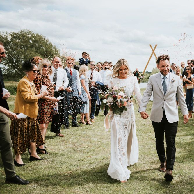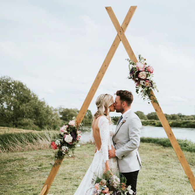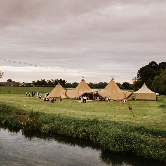 I would say the general vibe for the day was a relaxed and fun day. We wanted to have all our friends and family together eating and drinking great food and drinks and hopefully having a lovely time! The inspiration for the styling was the English countryside, mixed with a bit of boho. The flowers were seasonal British flowers grown in our florist’s cutting garden and the venue was a field by the River Trent, so we wanted the styling to be wild and natural so that it was keeping with our surroundings.