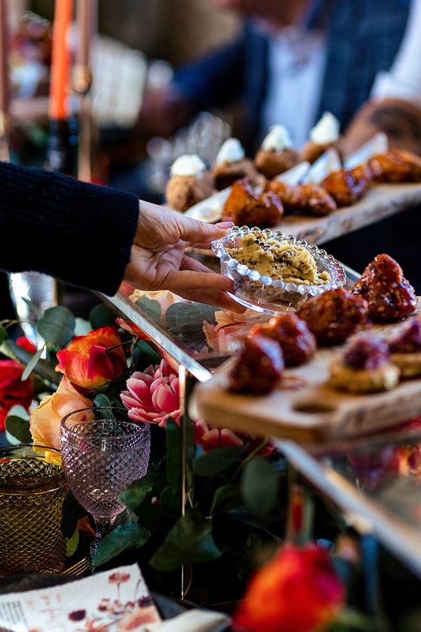 A: Work with your caterer to design stations that complement your décor, using cohesive colours, signage, and serving ware to tie everything together.