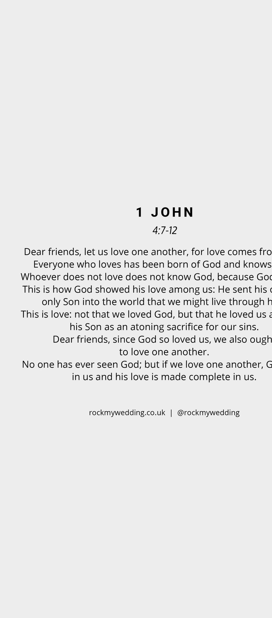 Choose love with this beautiful religious wedding reading from the Bible. If 1 John 4:7-12 is the reading for you, download a copy you can print and take straight to your ceremony.