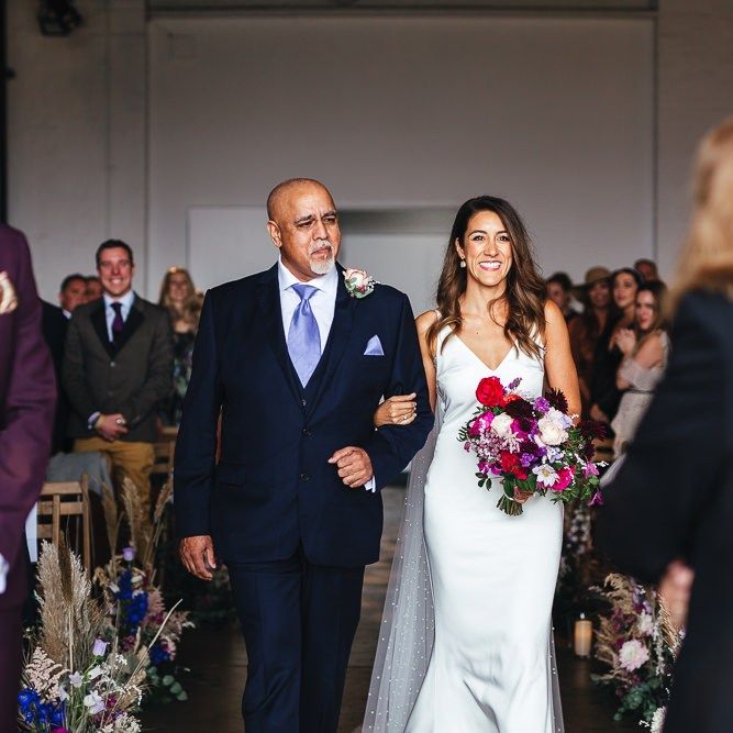 We're not traditional people so an off the shelf wedding was never going to be for us, which is why Trinity Buoy Wharf was the perfect location. Each detail was personal and hand-selected by us. It was incredibly time-consuming and probably more expensive but, with the help of our amazing wedding planners at Occasion Queens and the incredible Sachin at Veer, it resulted in something that was truly ours. On the fourth trip to Hobbycraft in a week, you wonder if you should’ve handed it all off to someone else, but when it all came together, it was worth it. Our favourite moments of the day were just after the first dance, from that point on I could truly relax and let my hair down. Everything had gone to plan so it was time for dancing and drinks with all my favourite people in the world. For Ben, it was Stealing a glimpse as I came down the aisle. It was all real then. We were actually gonna do this.