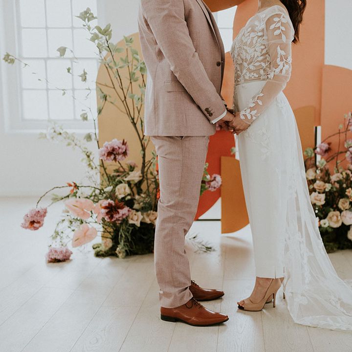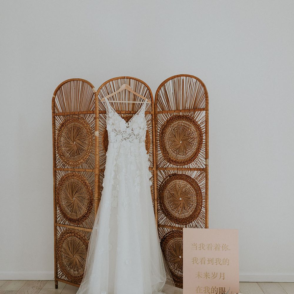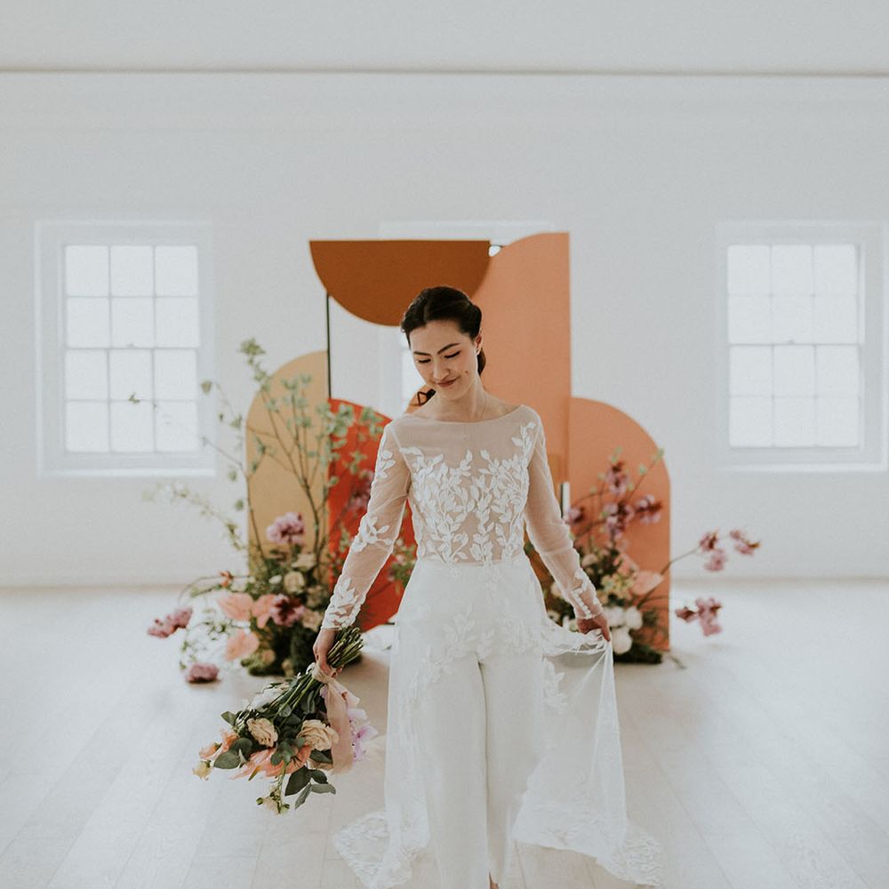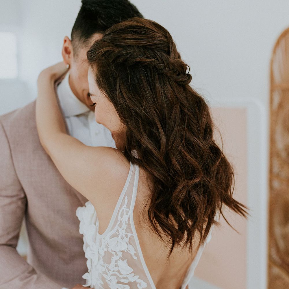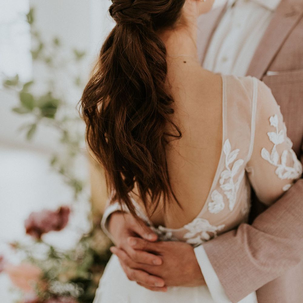 We had two wonderful outfits supplied by Love Spell Design. First was a 3D floral appliqué wedding dress with an embroidered bodice, perfect for the tea ceremony. Julie, our hair and makeup artist, created a soft and delicate makeup look and soft waves. For the second dinner party look, we chose an Ivy jumpsuit. Creating an alternative, modern yet feminine look. The sleek ponytail added a fun, and sophisticated vibe.