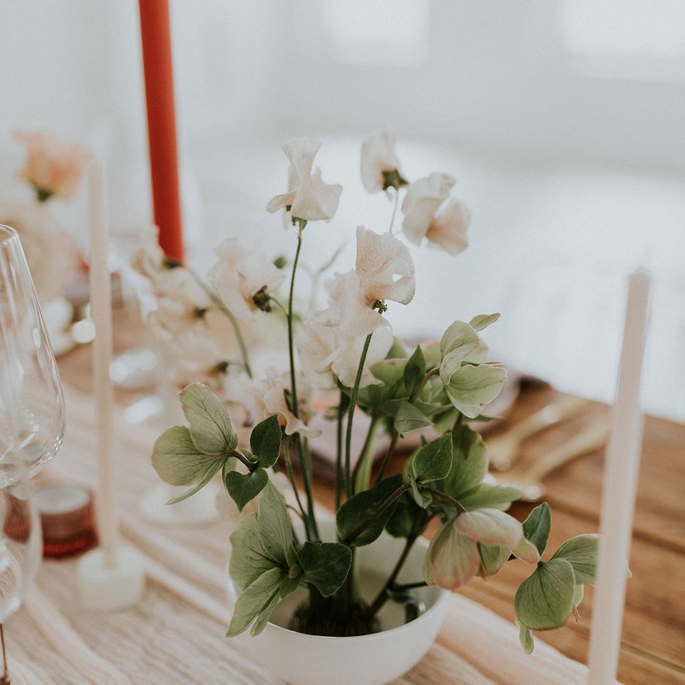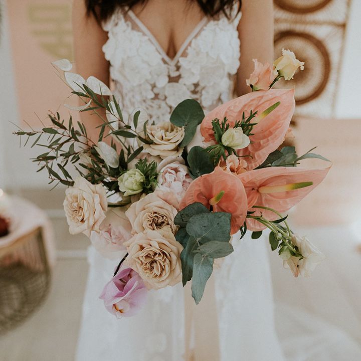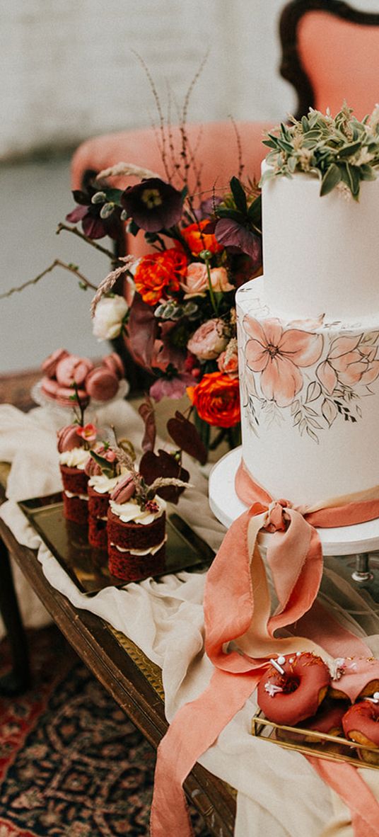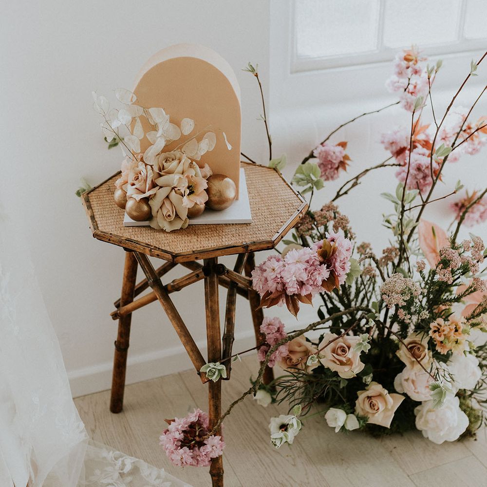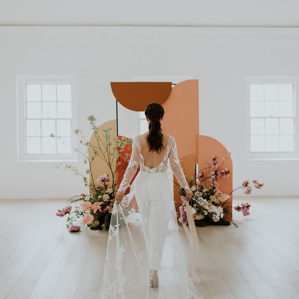 We had two wonderful outfits supplied by Love Spell Design. First was a 3D floral appliqué wedding dress with an embroidered bodice, perfect for the tea ceremony. Julie, our hair and makeup artist, created a soft and delicate makeup look and soft waves. For the second dinner party look, we chose an Ivy jumpsuit. Creating an alternative, modern yet feminine look. The sleek ponytail added a fun, and sophisticated vibe.