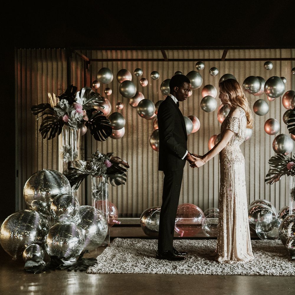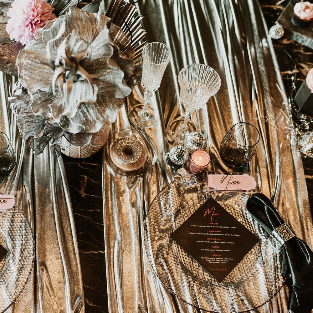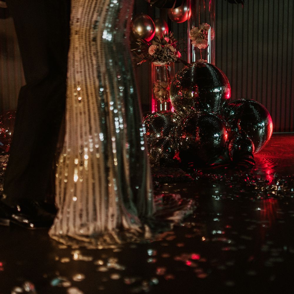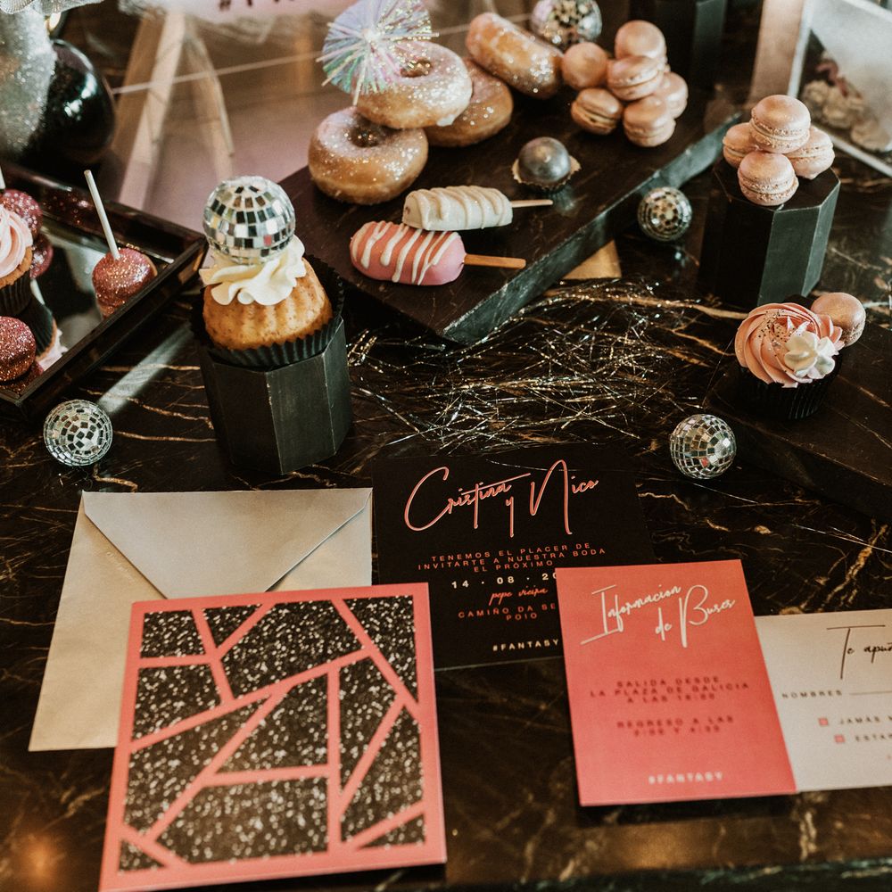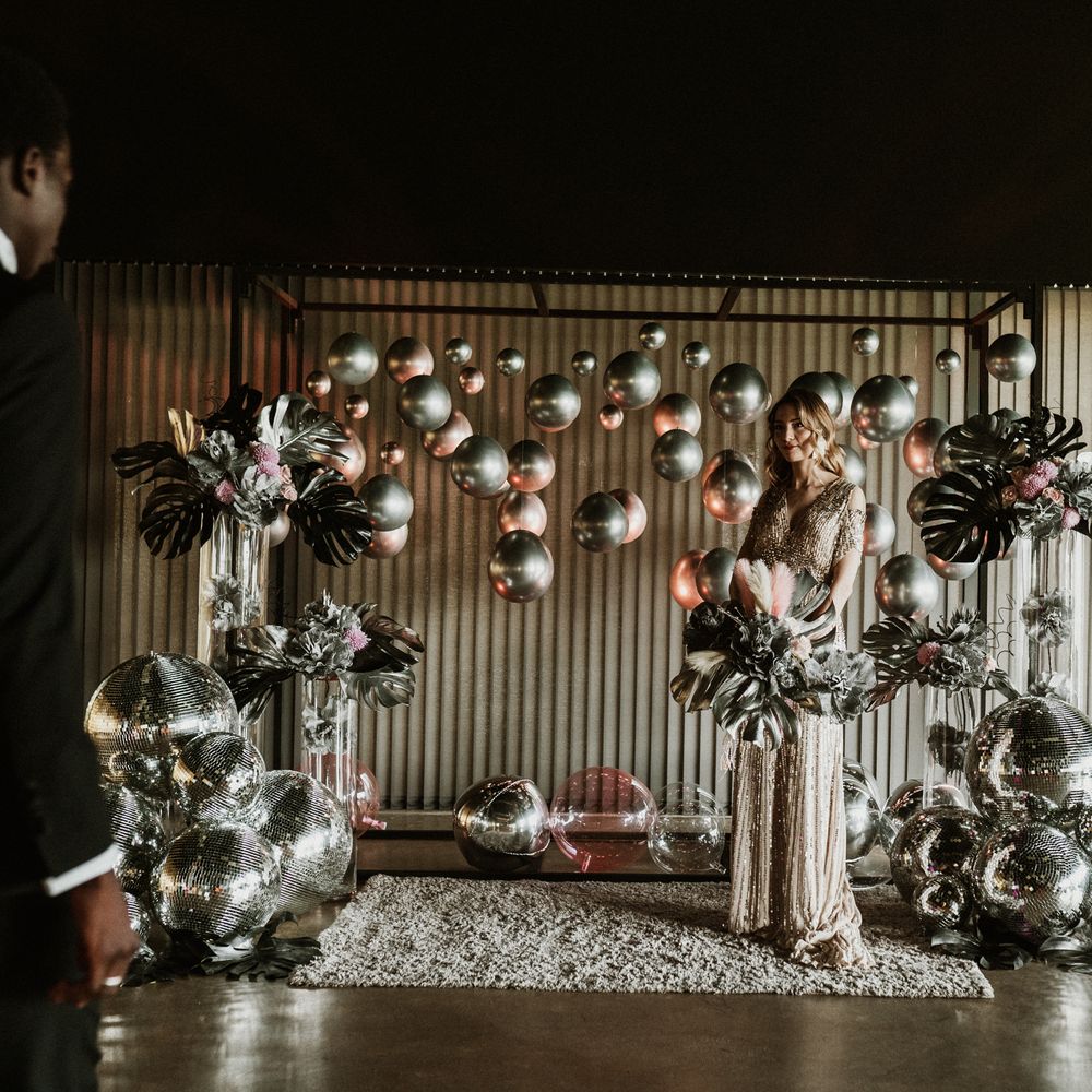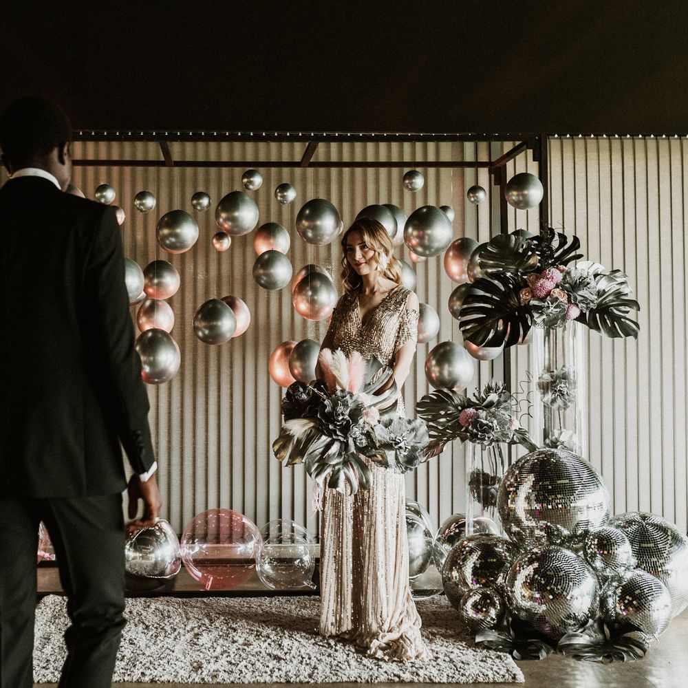 Fantasy wedding shoot inspired by the lights of disco balls, the glitter, the colour pink and the frenetic rhythm of the parties. It is a session with strength, character, full of optical illusions and sensations, transmits joy, elegance and is a tribute to many times and transcendental and relevant aesthetics such as art deco, the time of agitation social and the excesses along with the crazy 70's in which Saturday Night Fever made us dance non-stop. Something new, extraordinary, beautiful, simple, but with the ability to envelop you in a real fantasy.