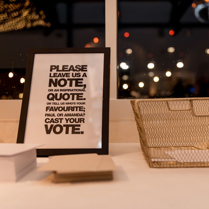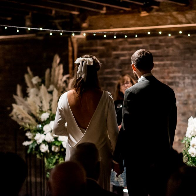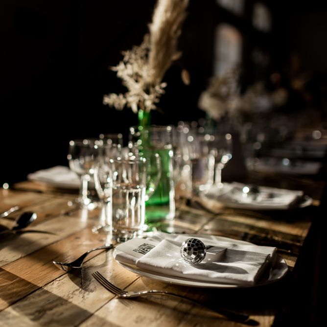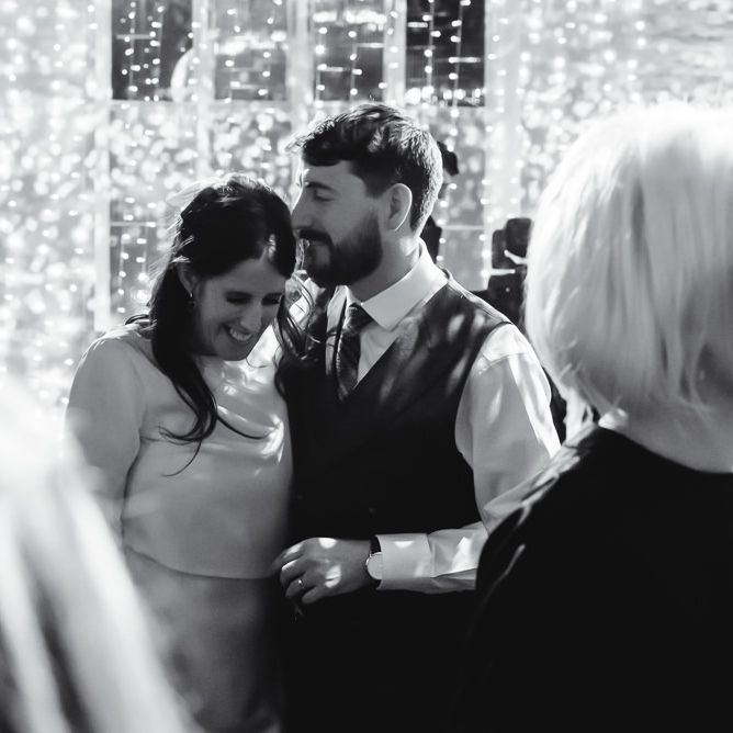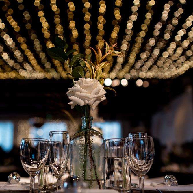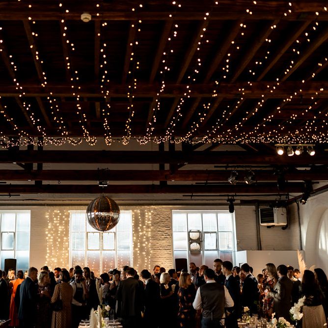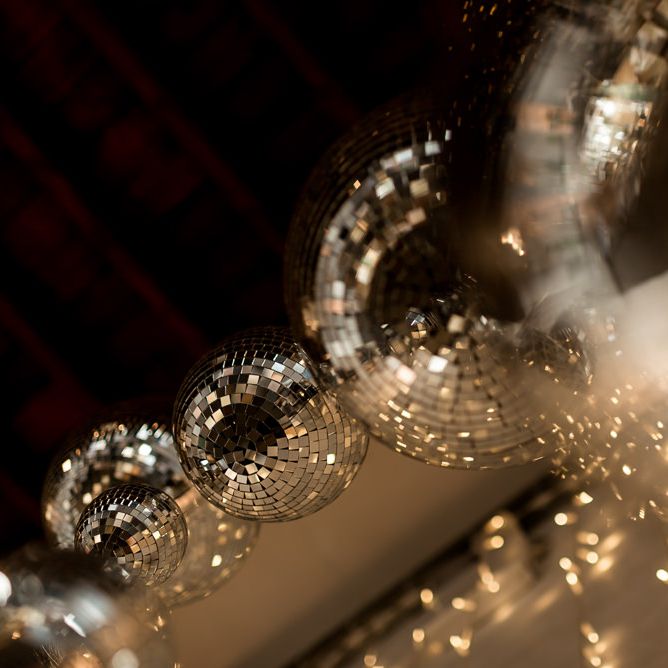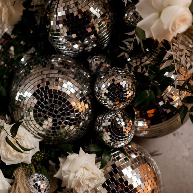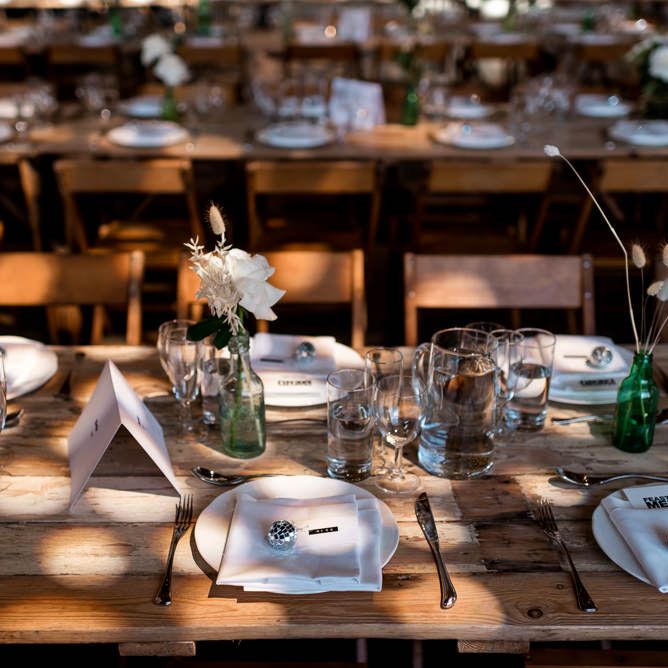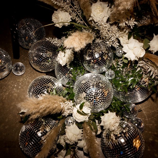 I wanted the day to feel chic, sparkly and special. We splashed out on the venue’s pea lights (after some heated debates!) which made the whole room twinkle. Then we added loads of disco balls, including a little one as each guest’s place setting, to help catch the lights. We kept all of our signage monochrome and simple (and designed by Paul to keep costs down), and our flowers were greens, whites, and neutrals. Jess did beautiful white roses for the bouquets and incredible pampas grass disco ball installations.