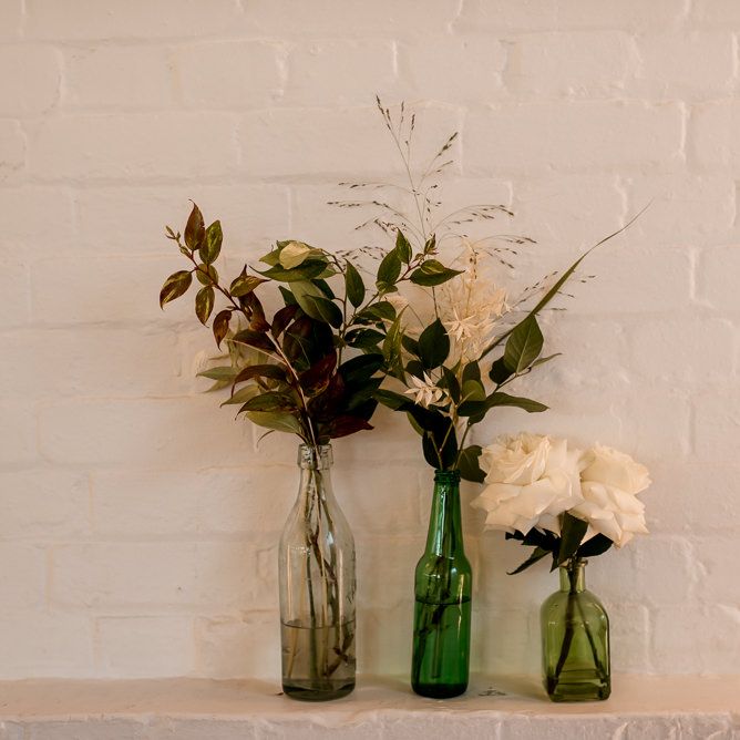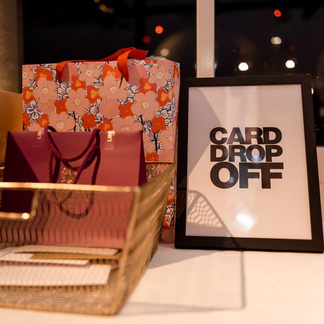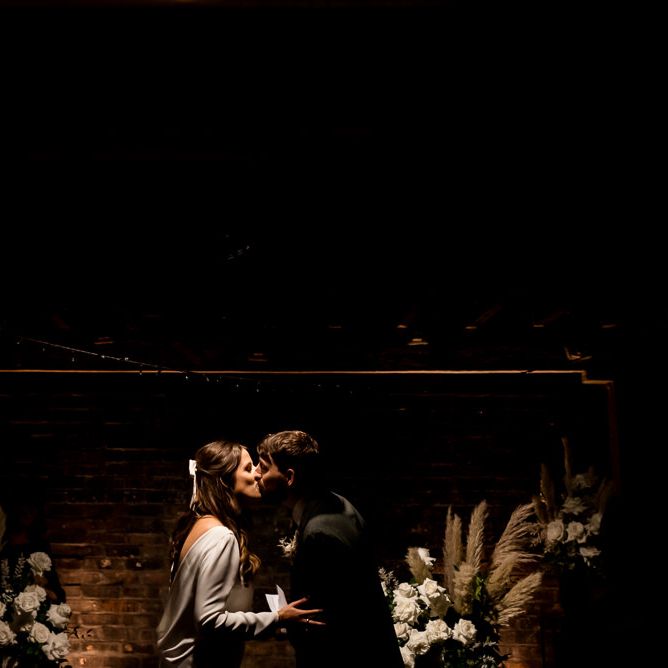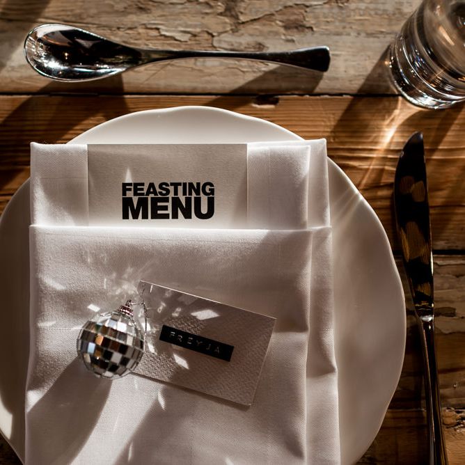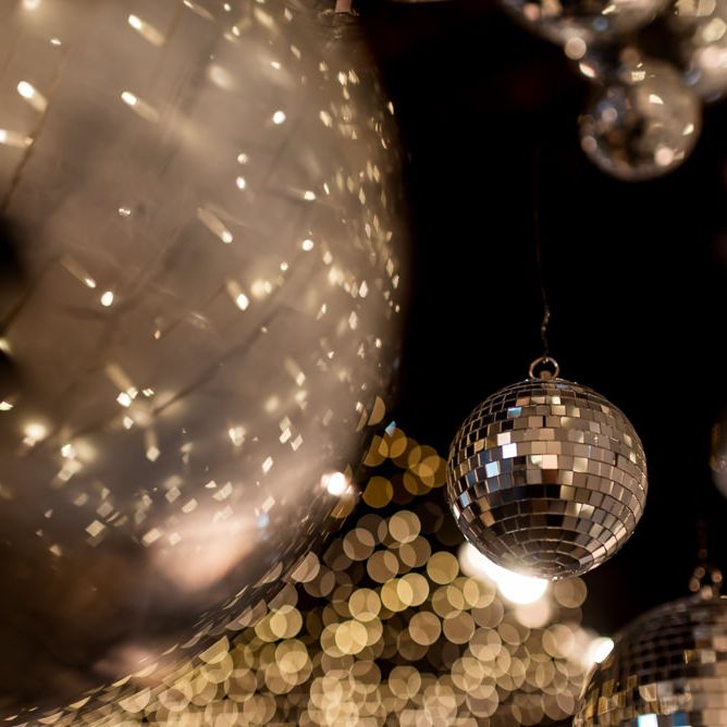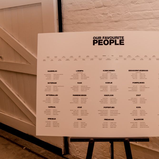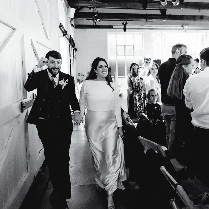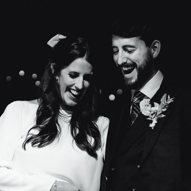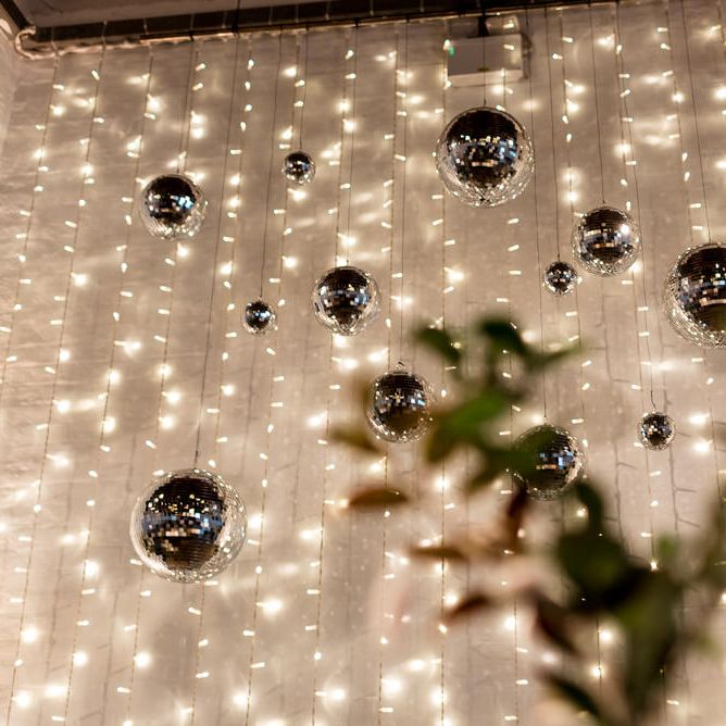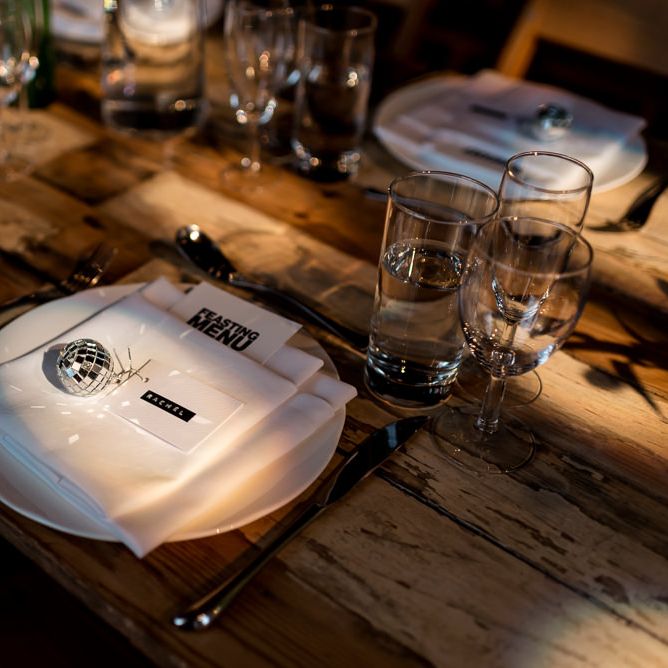 I wanted the day to feel chic, sparkly and special. We splashed out on the venue’s pea lights (after some heated debates!) which made the whole room twinkle. Then we added loads of disco balls, including a little one as each guest’s place setting, to help catch the lights. We kept all of our signage monochrome and simple (and designed by Paul to keep costs down), and our flowers were greens, whites, and neutrals. Jess did beautiful white roses for the bouquets and incredible pampas grass disco ball installations.