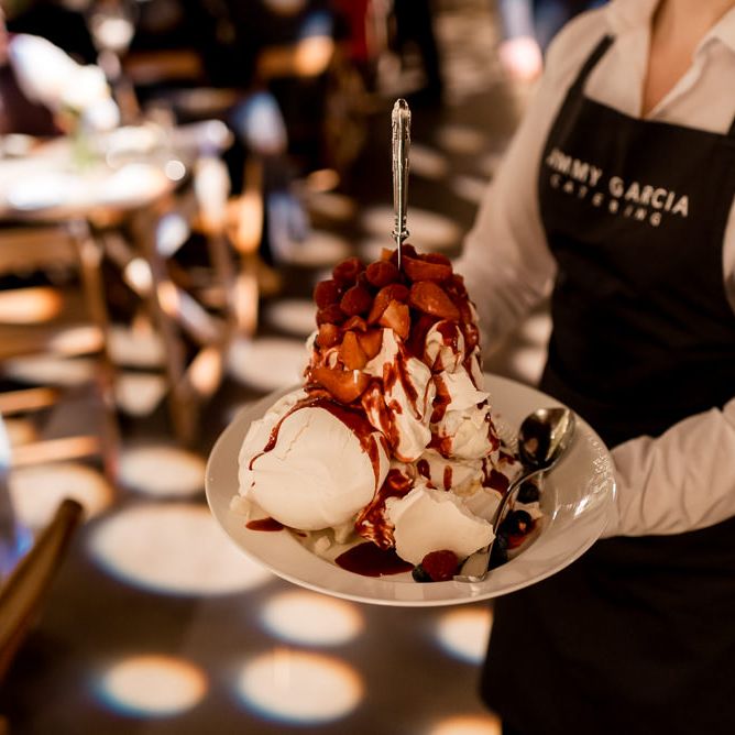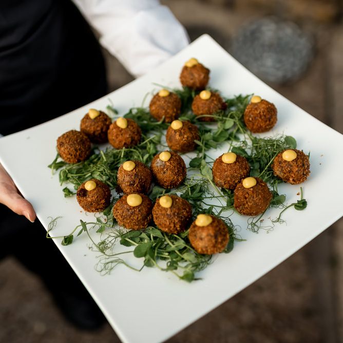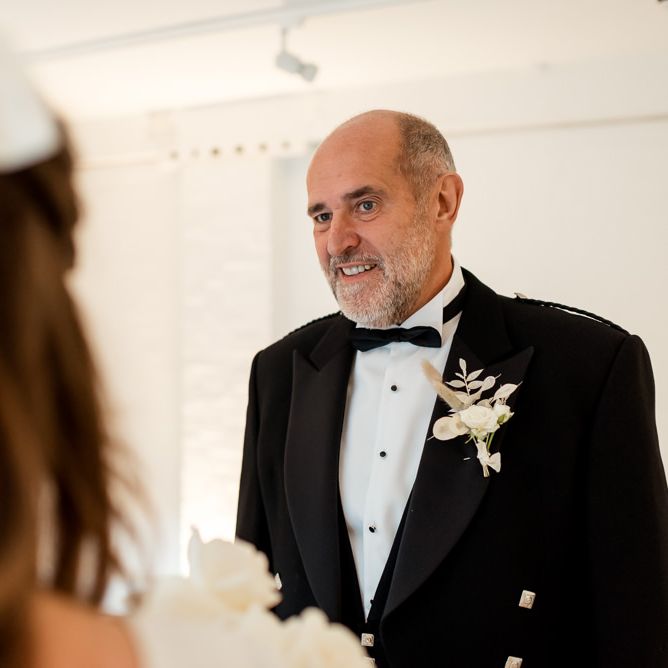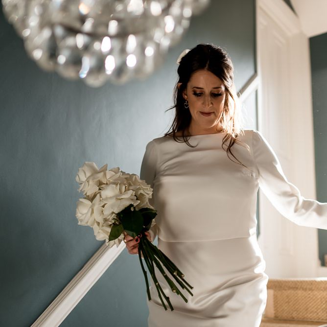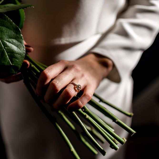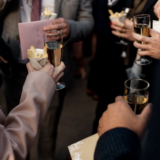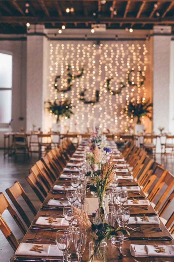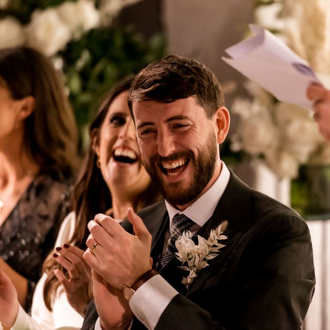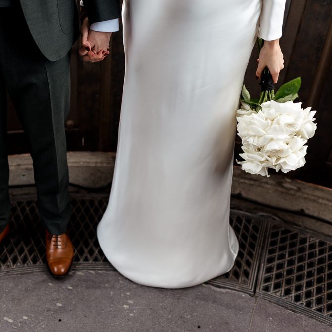 I wanted the day to feel chic, sparkly and special. We splashed out on the venue’s pea lights (after some heated debates!) which made the whole room twinkle. Then we added loads of disco balls, including a little one as each guest’s place setting, to help catch the lights. We kept all of our signage monochrome and simple (and designed by Paul to keep costs down), and our flowers were greens, whites, and neutrals. Jess did beautiful white roses for the bouquets and incredible pampas grass disco ball installations.