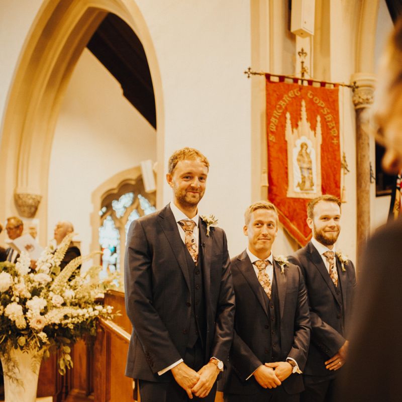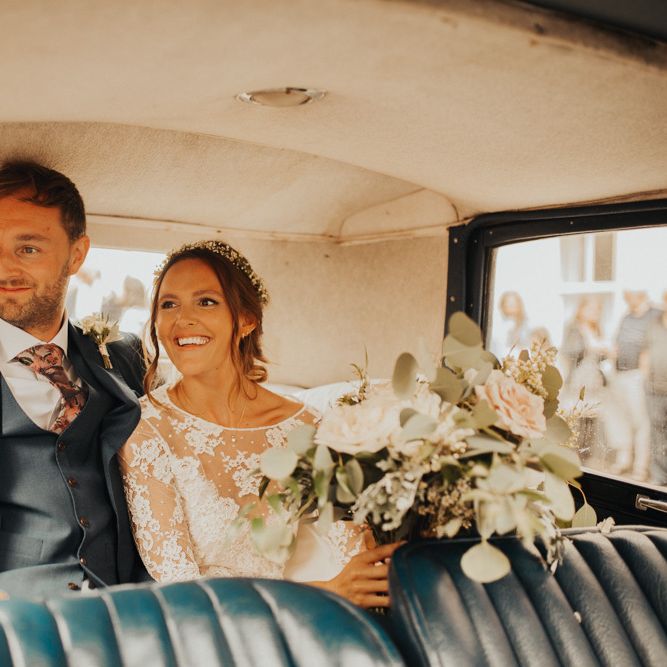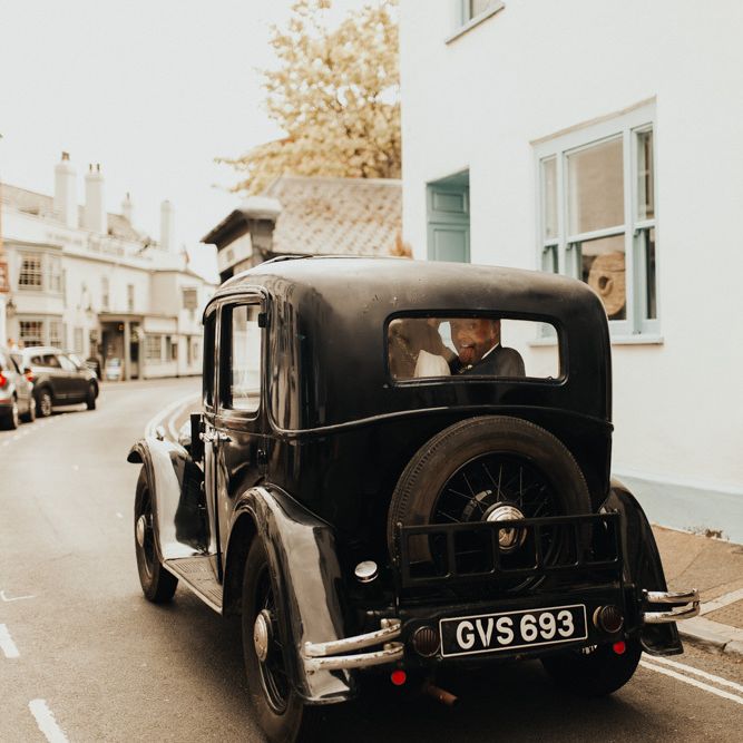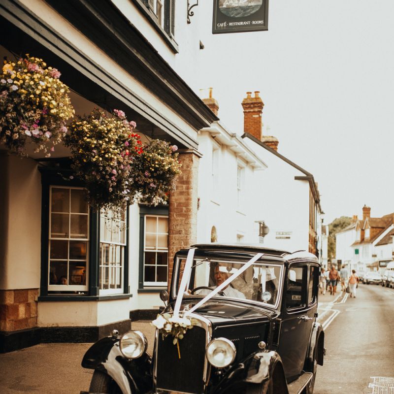Our wedding took place in St Margaret's Church in Topsham which is where my parents were married over 35 years ago. A dream of mine from when I was a young girl was to have my wedding reception in my parent's garden as it was full of so many happy childhood memories, and so after the service finished, our guests walked 800 meters up the road to enjoy an evening of fun in a traditional marquee erected in a field overlooking the rolling hills of Devon. Our drive from the church to the wedding reception was very special. We were picked up in an Austin 7 from the 1930s by a local doctor, who didn't want a penny but asked that we make a donation to Hospiscare Charity - this charity is very close to our hearts as Justin's dad passed away the previous year and this charity had been a huge support.