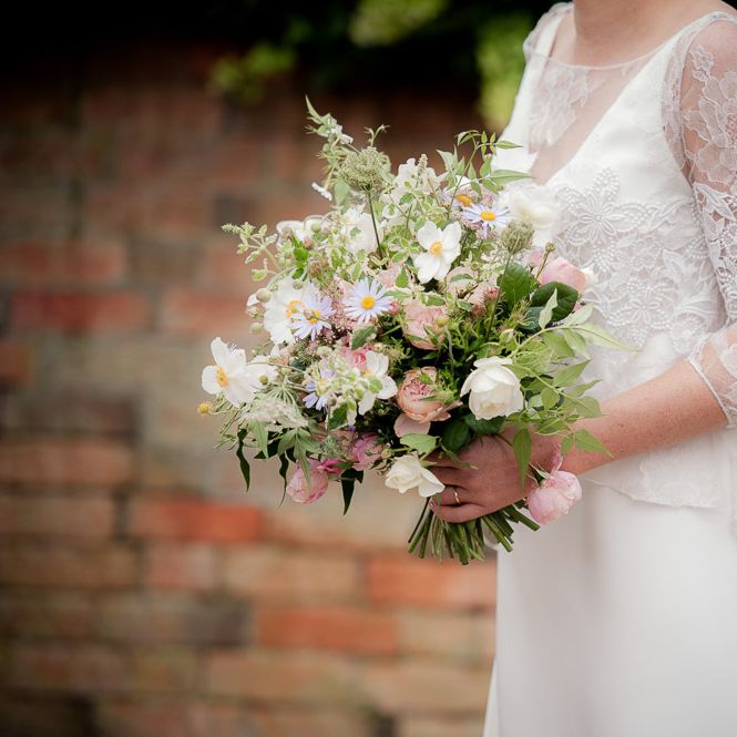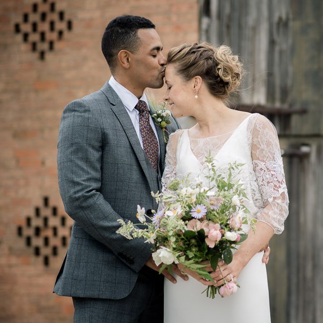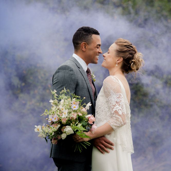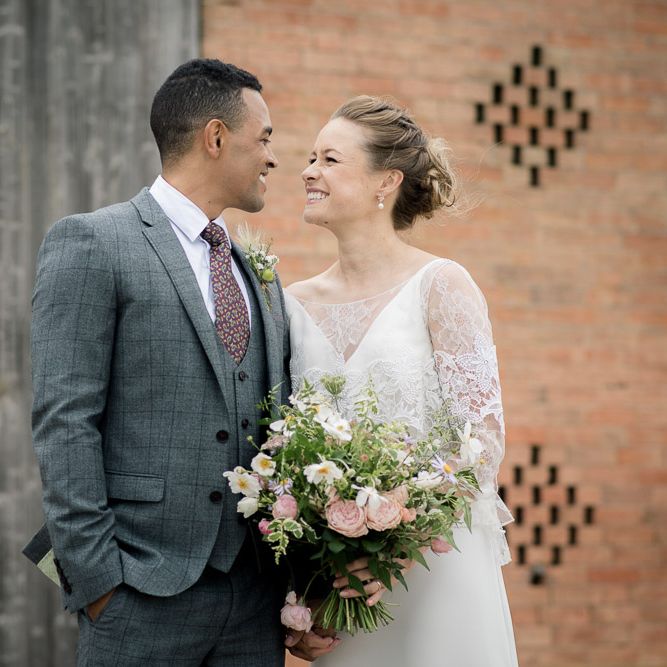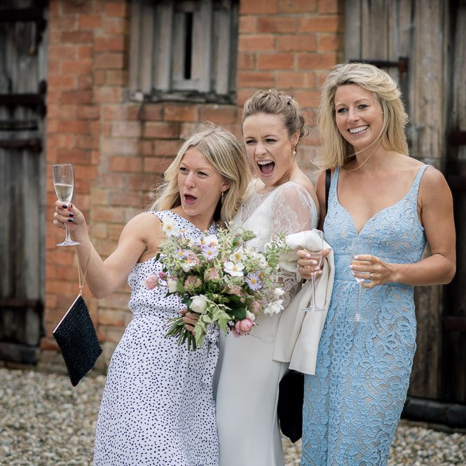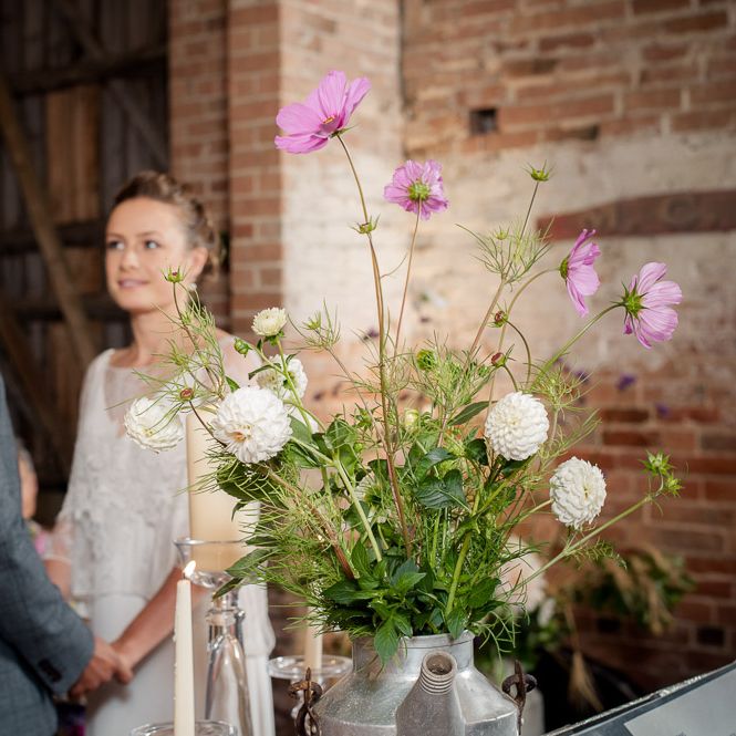 Bride in Tea Length Wedding Dress and Birdcage Wedding Veil for a Pastel Barn Wedding