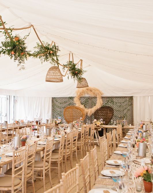 Being right next to the sea and in the middle of Summer, we wanted to capture some of that seaside feel in the styling and props. So we made use of materials such a rope, driftwood and macrame. We used nautical props, including barrels and wicker chairs. Our flowers also reflected this, with the use of grasses and local wildflowers. This all came together to create a relaxed, seaside, boho look which we loved! I think the most major installation had to be on the ceiling of our marquee. We had a vision of creating something colourful, nautical and spectacular on the ceiling. We wanted to use rope - because of the nautical connection - but also to combine this with the use of flowers and grasses to echo the flower selection. This was a labour of love and all thanks to the great work of Caroline Grimble, florist at Wild Rubus. There were many evening phone calls where we tried to describe our vision. Caroline provided a number of sketches and eventually, we reached a decision on the design. It wasn't until the day before the wedding that we actually saw the finished article. It was even better than we had imagined and really brought life, colour and joy to the marquee.