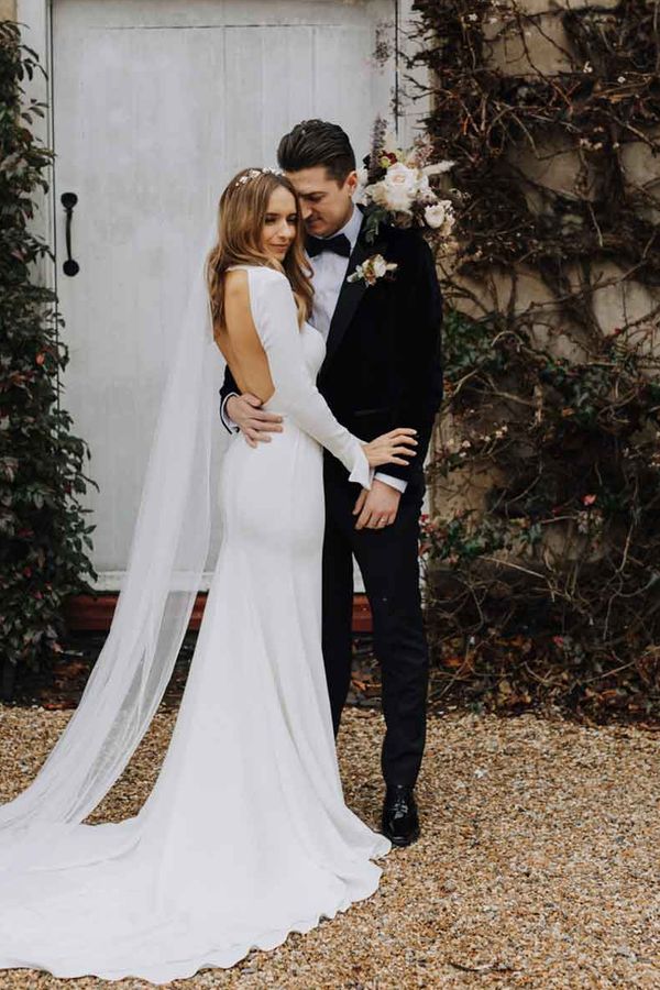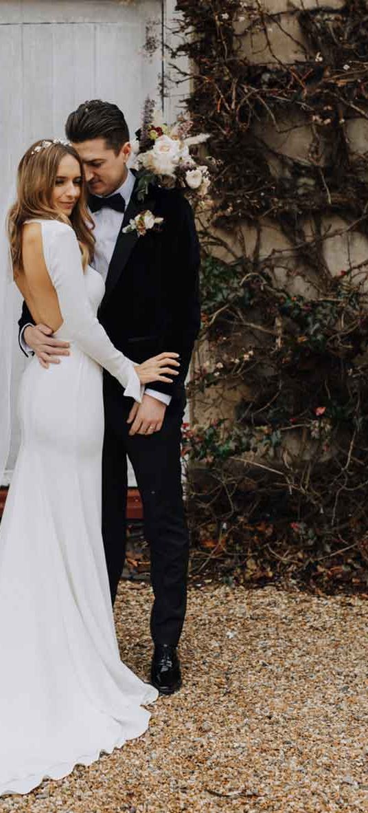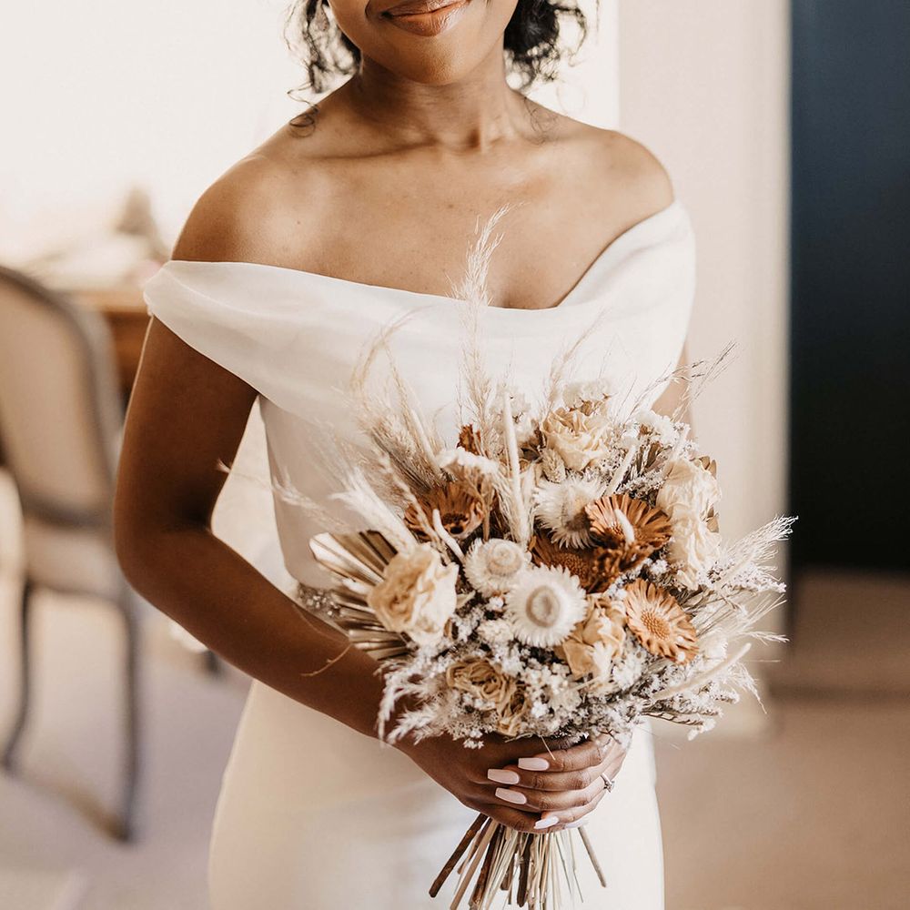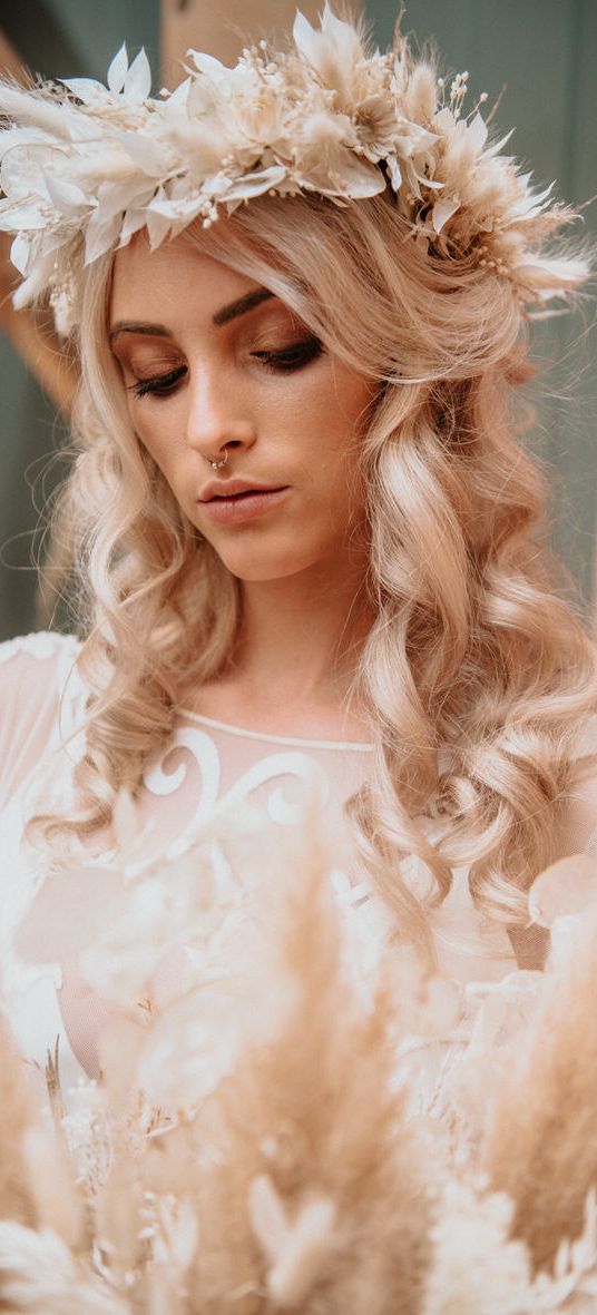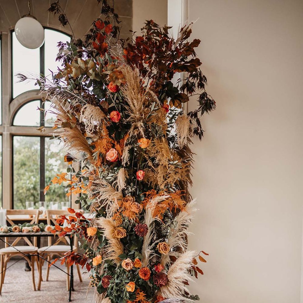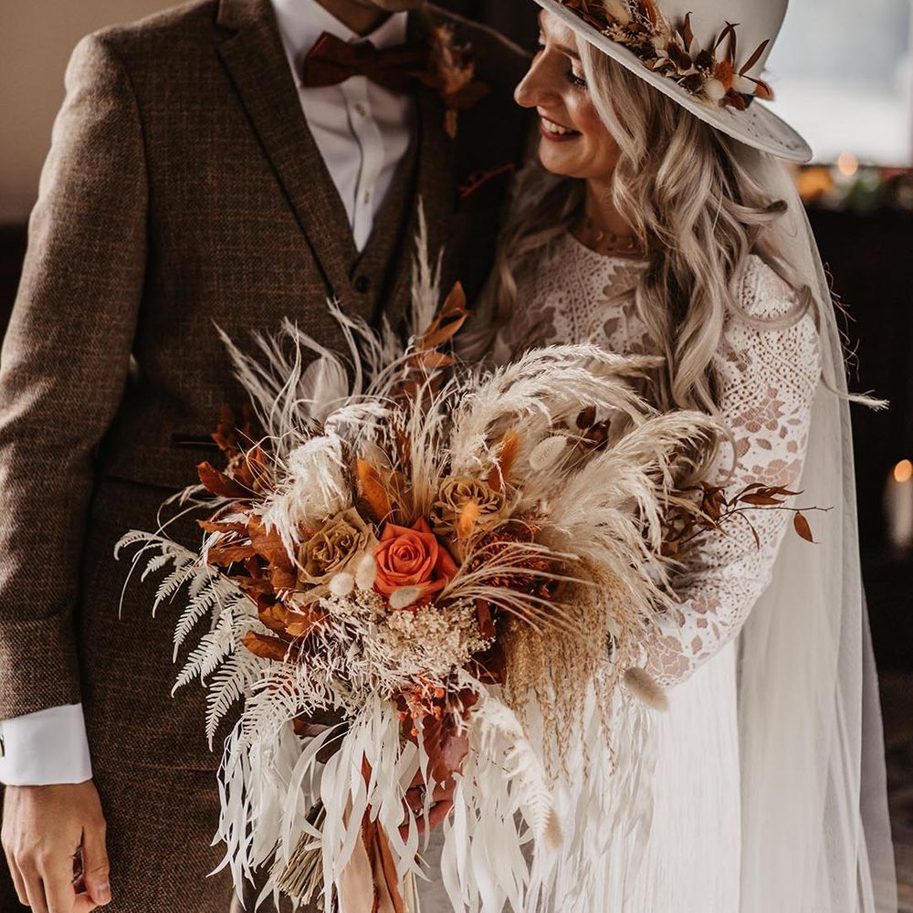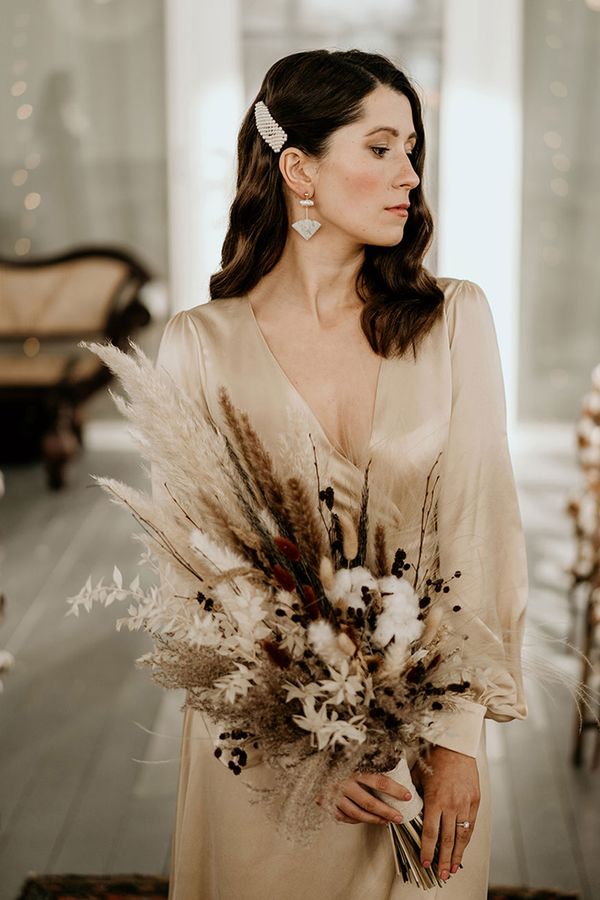 Emma Beaumont Wedding Dress for a Winter Wedding at Northbrook Park with Pampas Grass Floral Arrangements