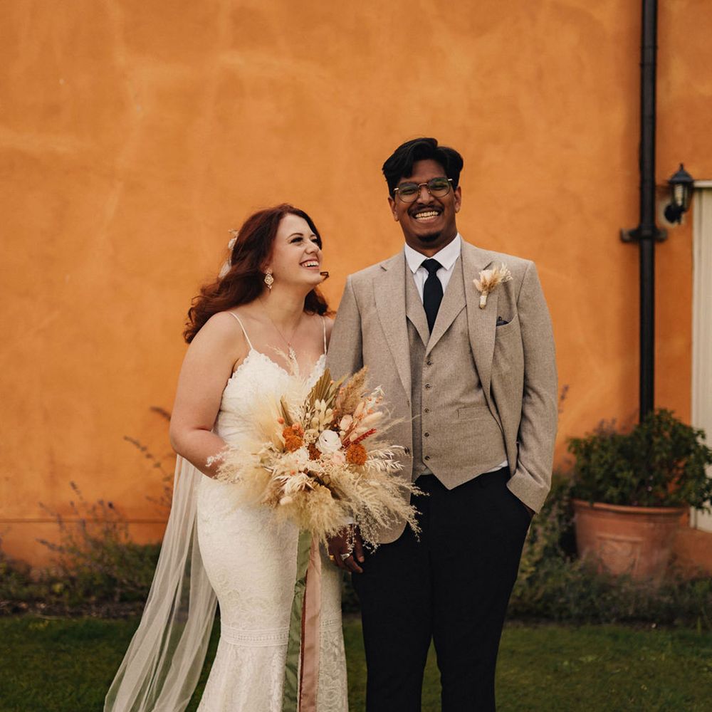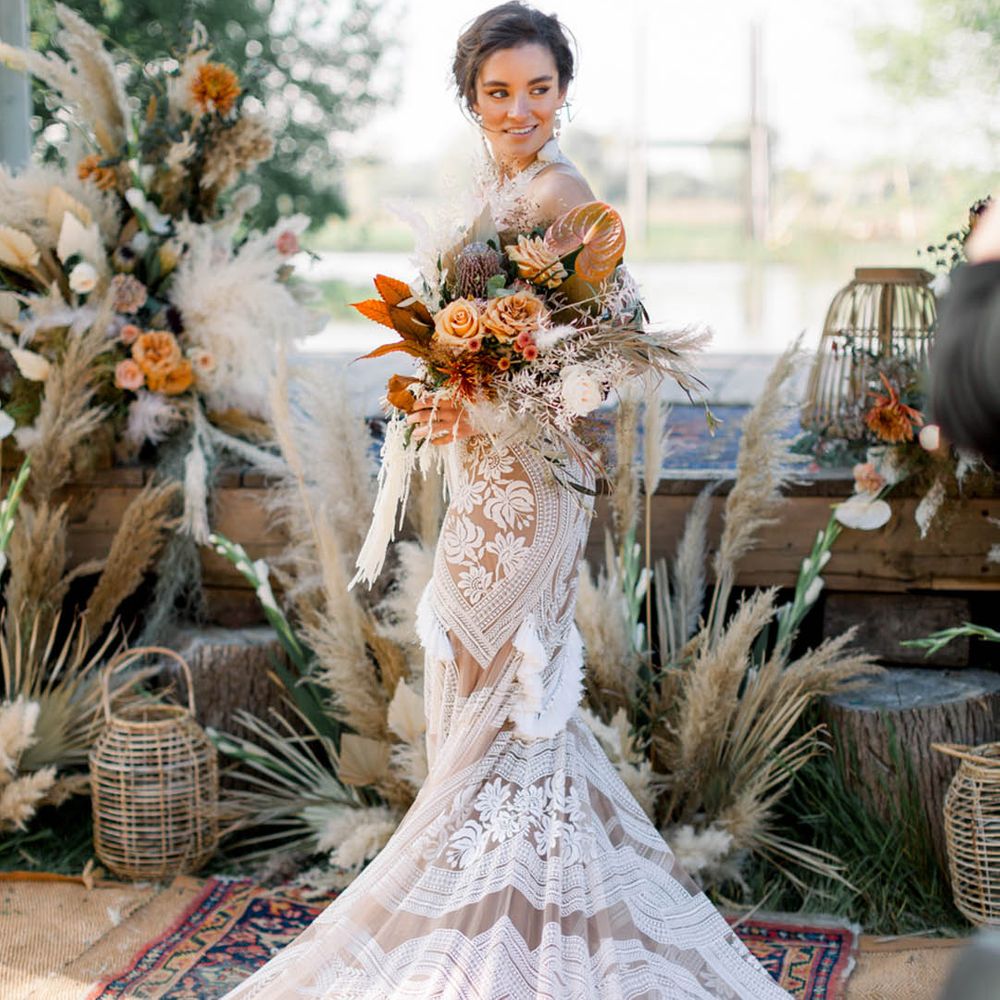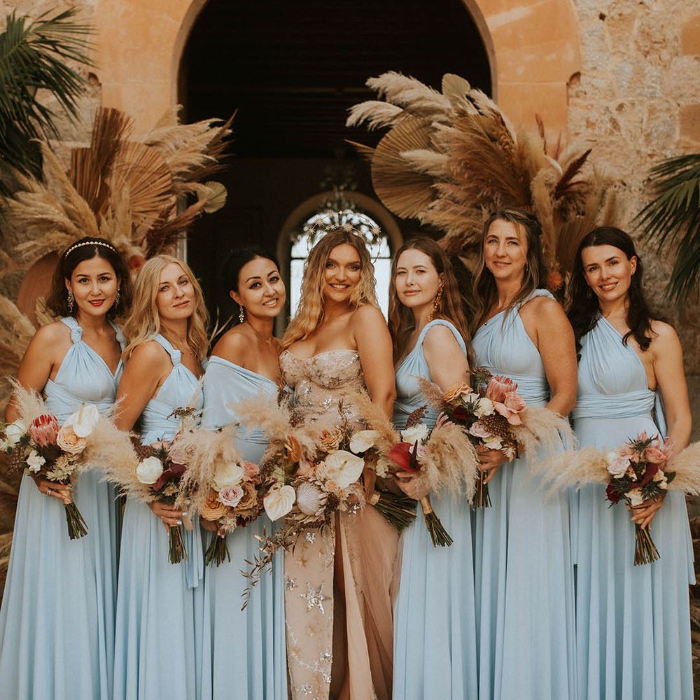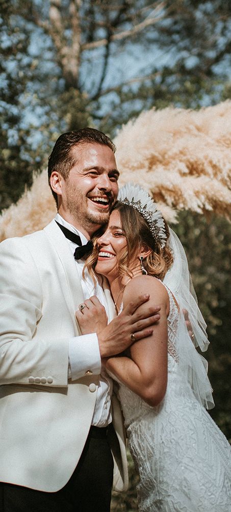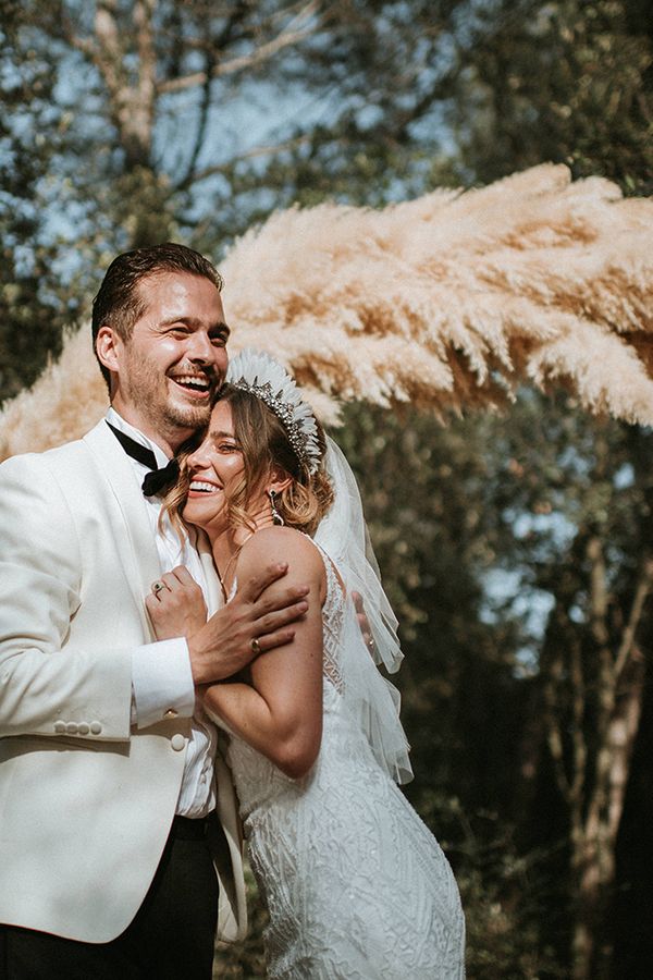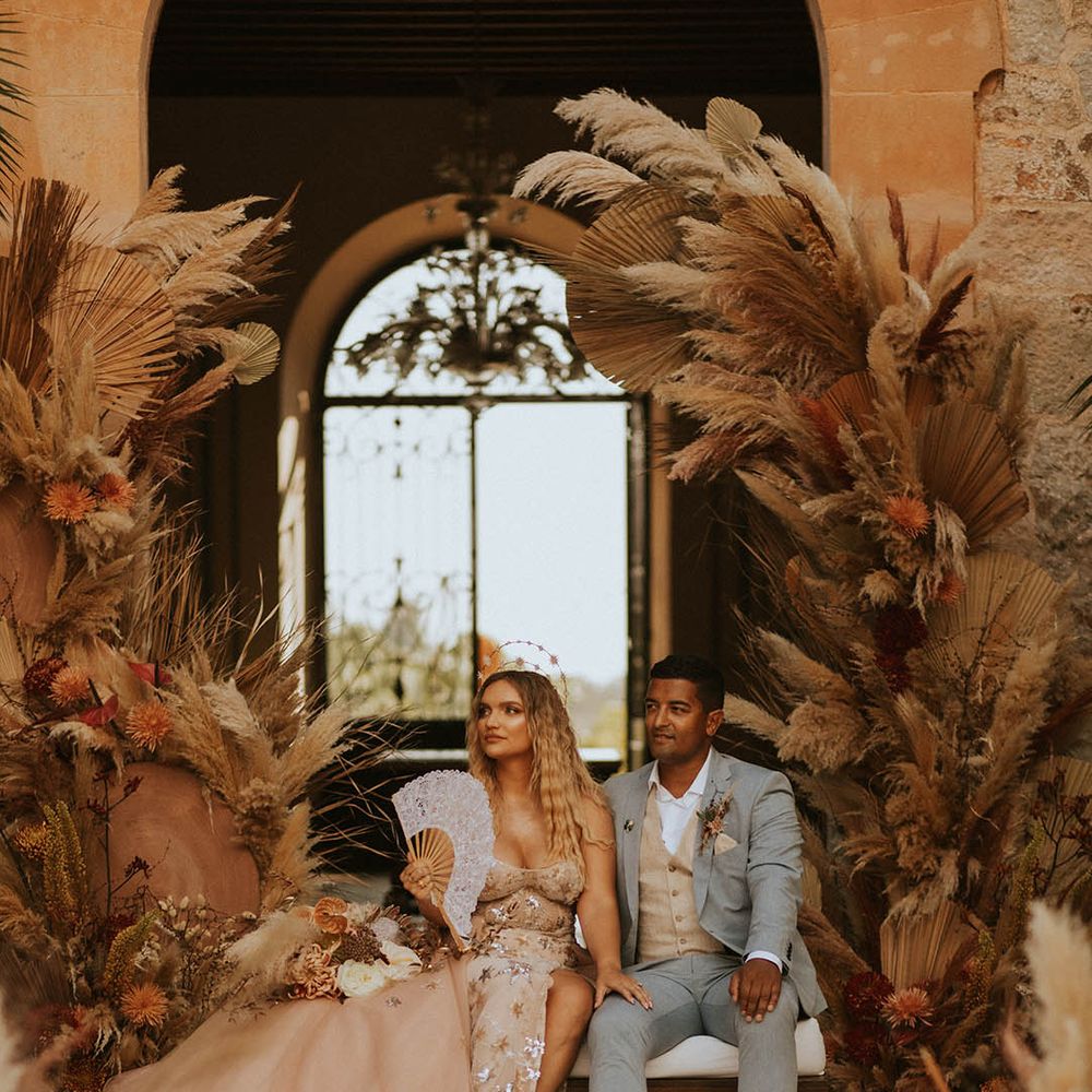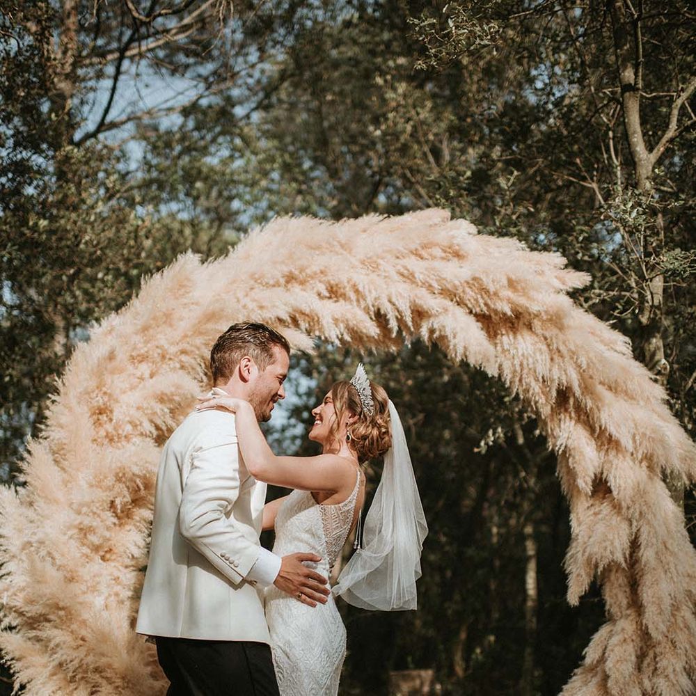 Mallorca Wedding with Pampas Grass and Acrylic Wedding Decor and Emma Beaumont Bridal Wedding Dress