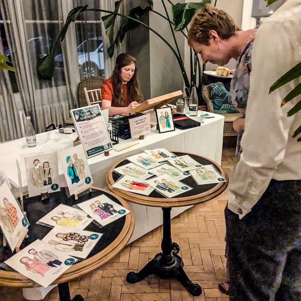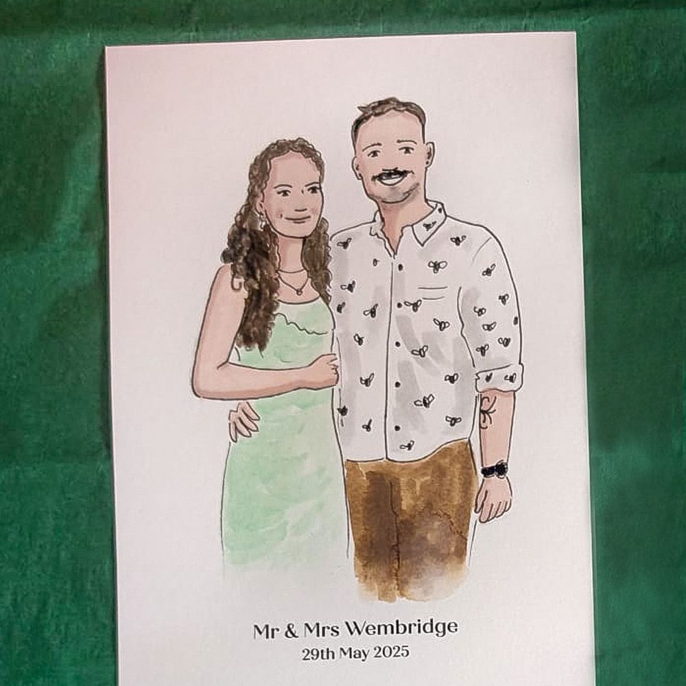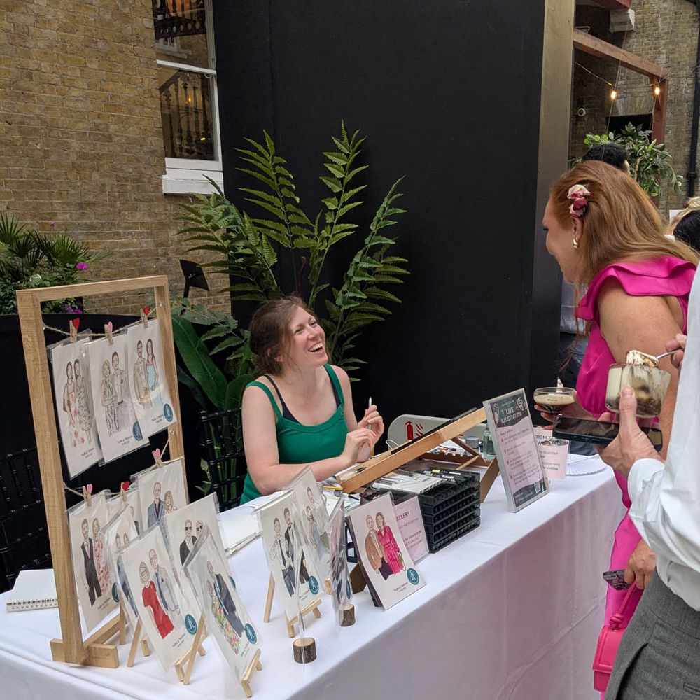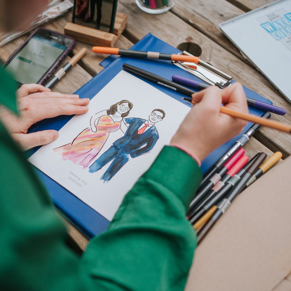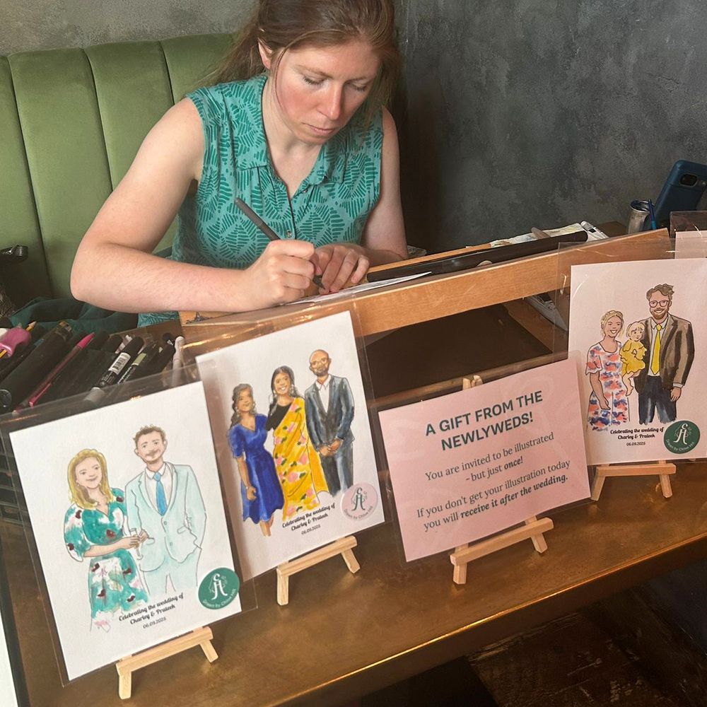 Live illustration for weddings and events - Entertainment that is as unique and special as your guests are! I draw your guests as they celebrate, creating vibrant portraits of them. It's interactive entertainment and a meaningful keepsake in one. Perfect for couples who love unique touches! If you're planning a wedding that's more about creating an unforgettable experience than perfection, you've come to the right place. I create live illustrations at weddings across London and the surrounding counties - giving your guests a truly unique, personal keepsake. I take photos and then draw your guests as they mingle. It's interactive entertainment that creates a real buzz! There's something magical about watching portraits come to life in front of you, and guests love seeing themselves transformed into colourful illustrations that make them go "that looks just like me!" With a background in animation and children's illustration, my focus is capturing genuine likenesses through recognisable expressions and features - plus your fabulous outfits! I love bold colour and creating vibrant, contemporary portraits guests are proud to display. Live illustration is perfect for experience-focused couples who care about connection.