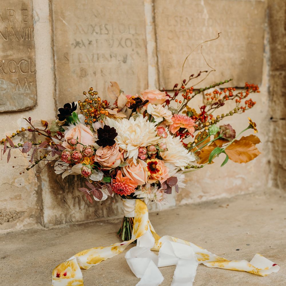 I wanted to finally say thank you for all of the hard work you and your lovely team put into our wedding in October. I don't know what magic you wove, but you managed to create exactly what I had in my head and it was all beautiful. I have had so many comments about how beautiful the bouquets were and how fabulous the hanging arch was I can't tell you. We had the arch and table garlands hanging in our dining room for weeks afterwards! We still have two of the mini squashes on the dresser!